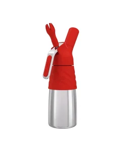 - Includes: 1 or 1/2 pint (Sold separately) stainless steel lever handled whipper with dispensing handle, Ivory/Red silicone covered charger holder and bottle cover, 2 dispensing/decorator tips, and cleaning brush.