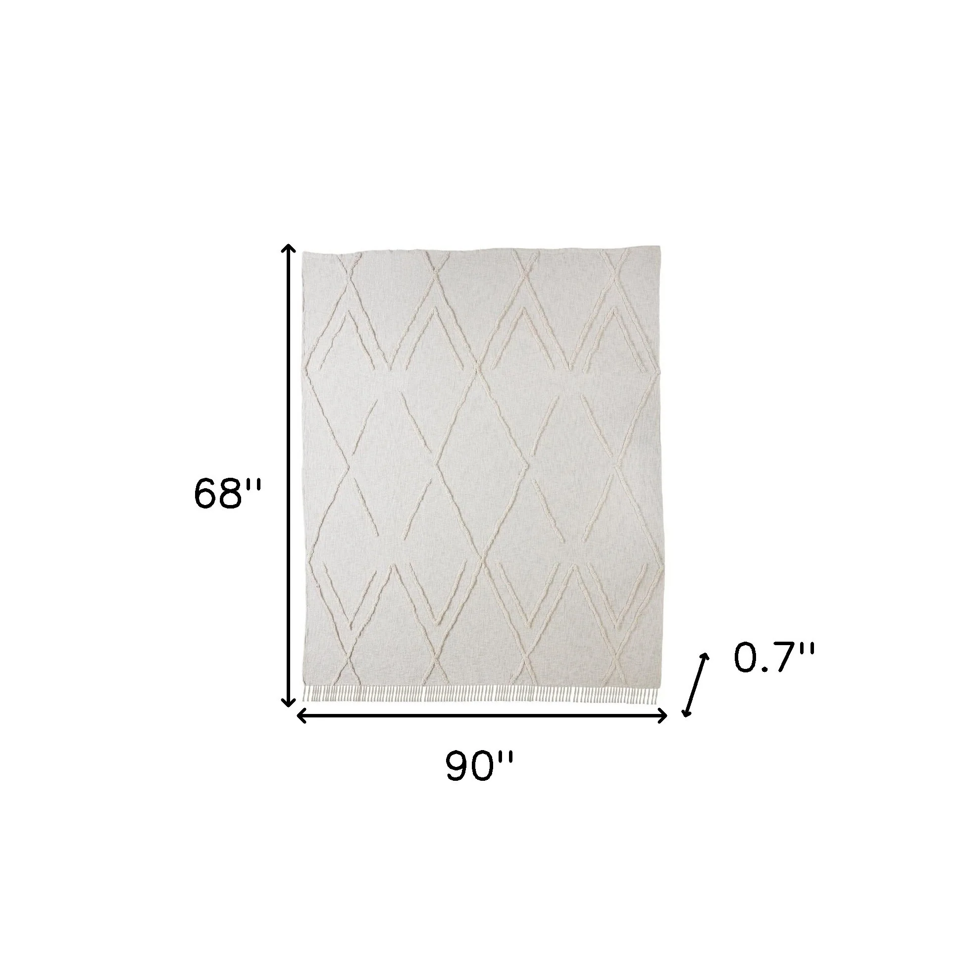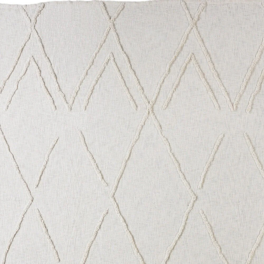 Elevate your bedroom with this chic Ivory geometric twin cotton coverlet with fringe. Crafted from high-quality cotton with a thread count of 300, this bohemian-style top of bed adds a modern touch to your space. Perfect for a single or twin-sized bed, this coverlet is the perfect lightweight design for year round use. Embrace the tufted textural geometric pattern and the fringe details to transform your bedroom into a trendy retreat. 68-inch H x 90-inch W x 0.7-inch D