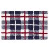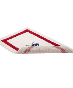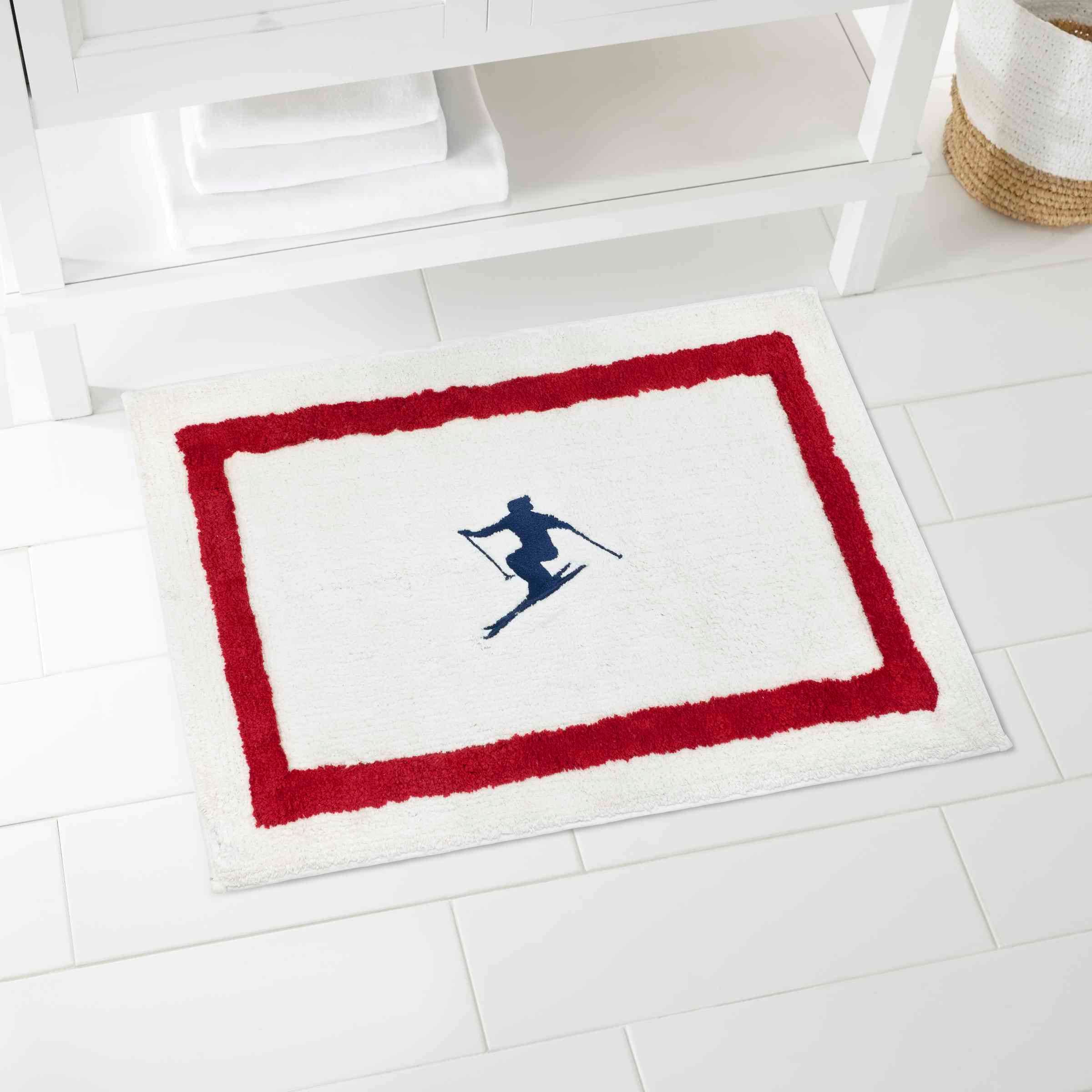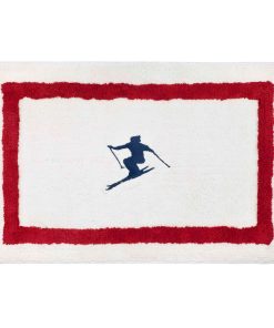 The Izod Alpine Decorative Bathroom Rug features an embroidered navy blue jumping skier on a winter white ground with red border. Tufted in 100% cotton, 20" x 32", non-skid, latex back. Shop the full Izod bath collection of shower curtains, rugs, towels, bath accessories.