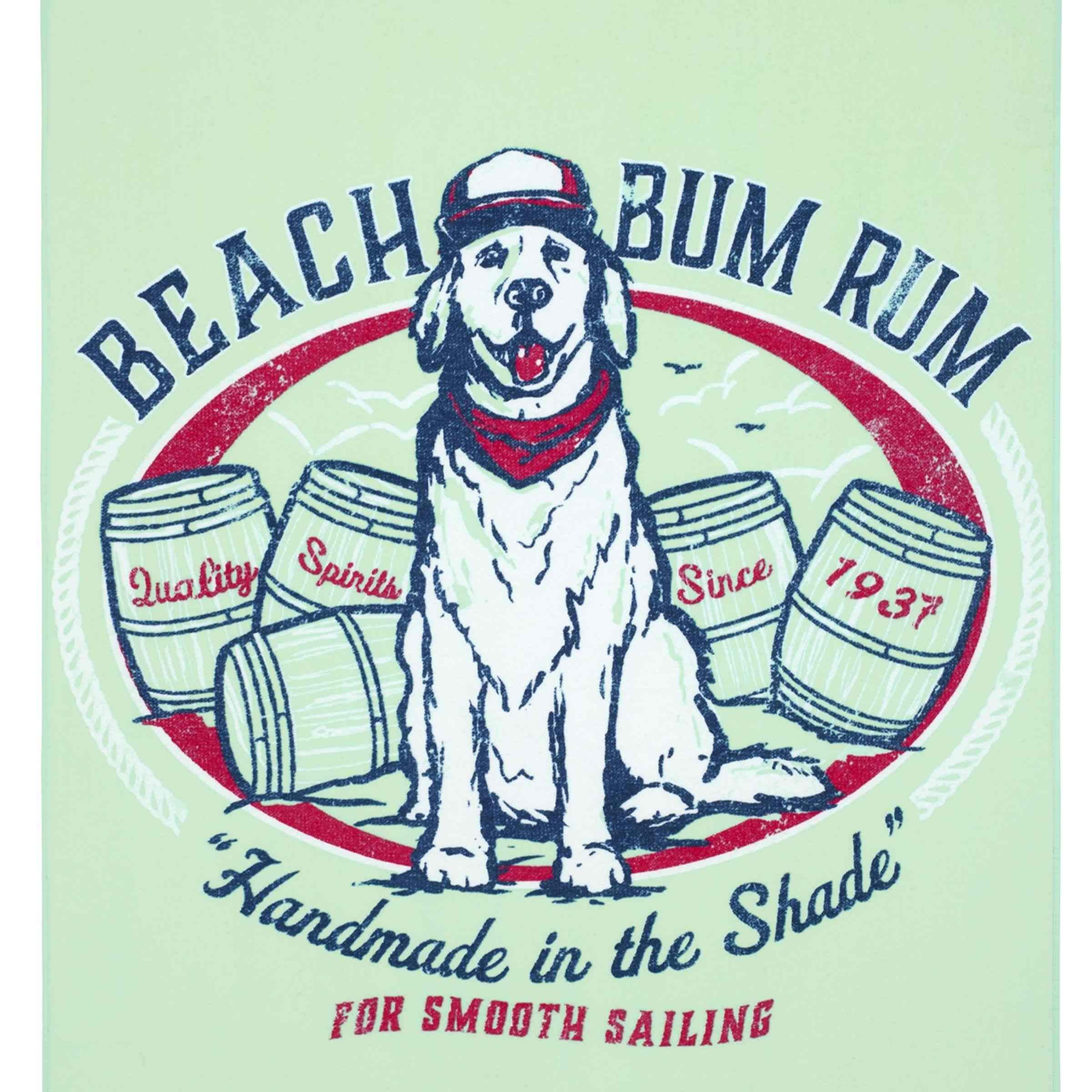 The Izod Beach Bum Beach Towel features a Golden Retriever surrounded by casks of an adult beverage with "Beach Bum Rum" and "Handmade in the Shade" printed in black on a mint green ground. 100% cotton sheared velour face, terry back, 40" x 70". Perfect for the dog (and rum) lovers out there!!