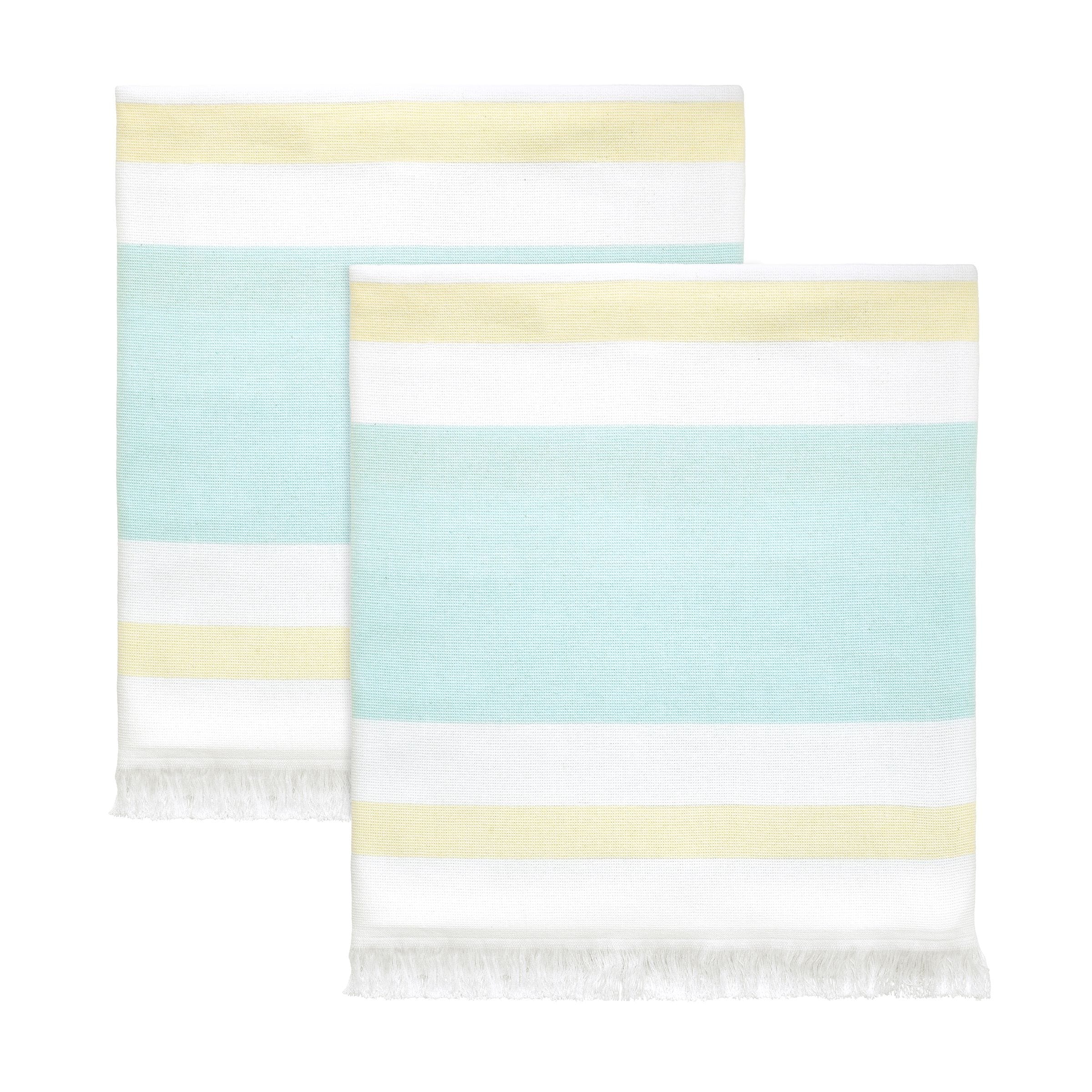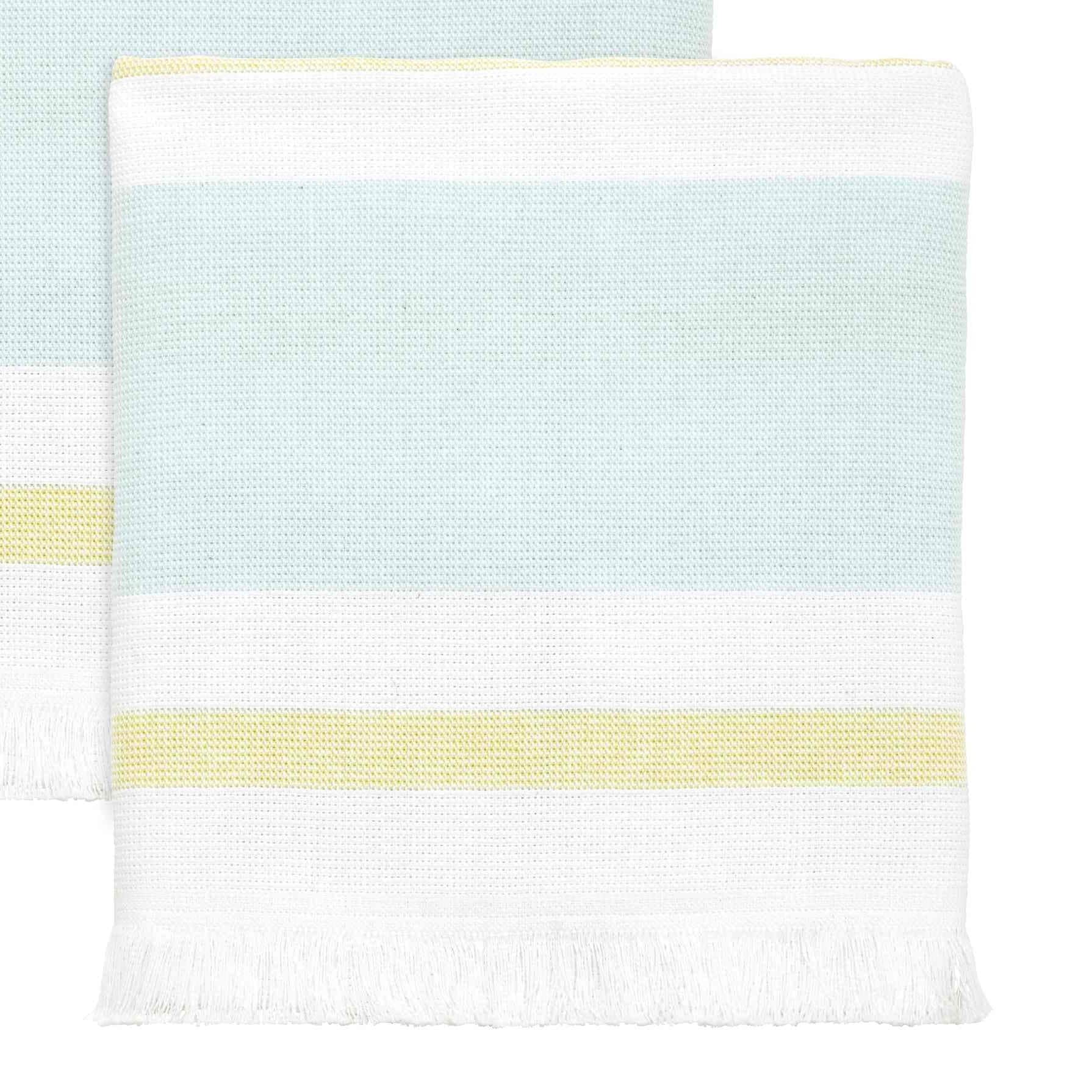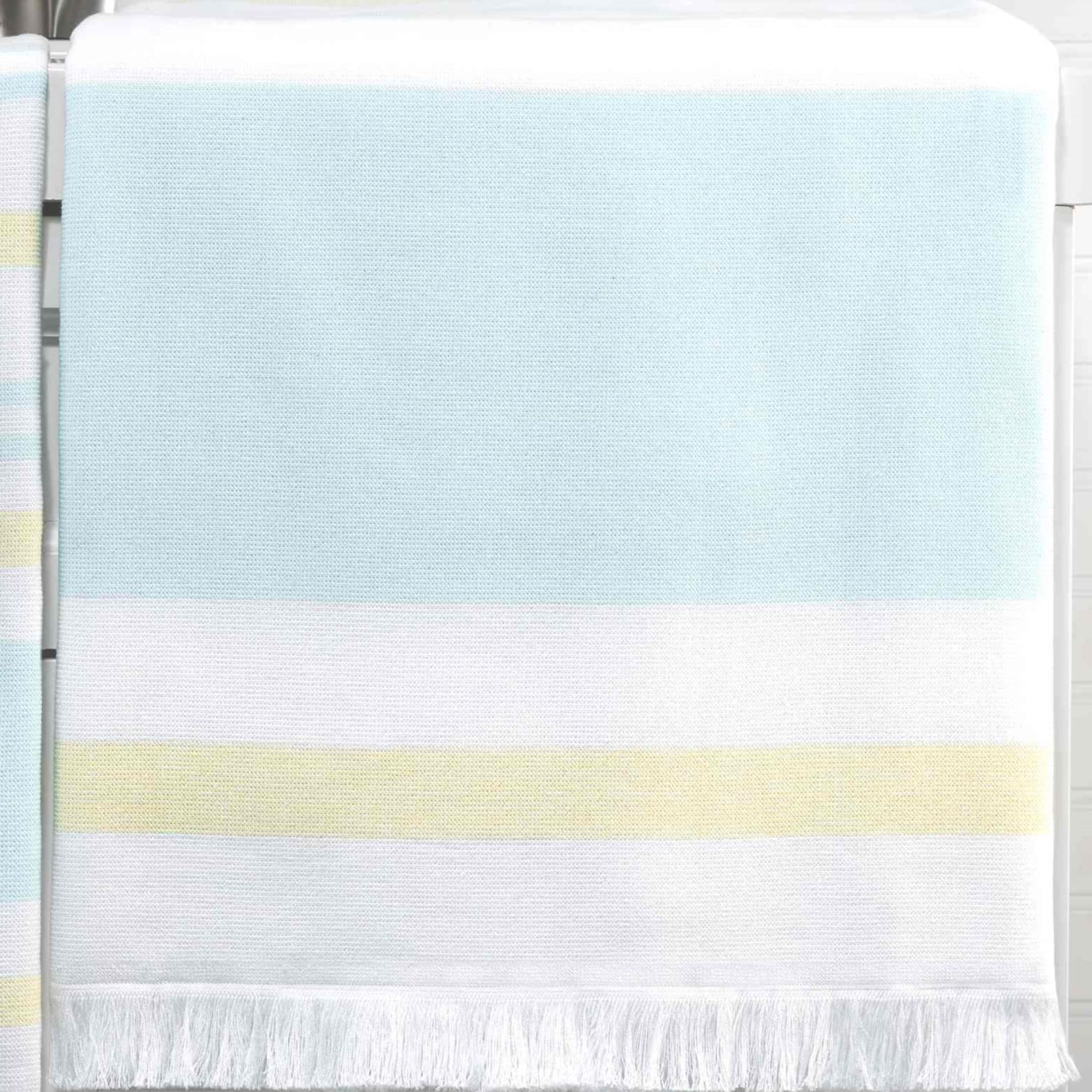 The Izod Clubhouse Stripe Aqua 3-Piece Hammam Towel Set features an aqua, yellow and white woven stripe design with fringe. The 100% cotton hammam-style towel is flat-woven on one side reversing to terry–lightweight, fast-drying. Includes 1 bath (30"x54"), hand (16"x28"), fingertip (11"x18").