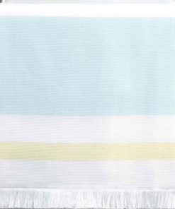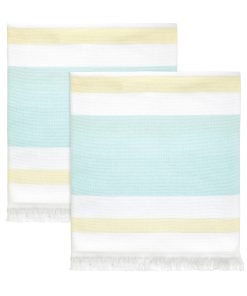 The Izod Clubhouse Stripe Aqua 2-Pack Hammam Bath Towel Set features an aqua, yellow and white woven stripe design finished with fringe on both ends. The hammam-style towel is flat woven on one side and reverses to terry–lightweight and fast-drying. 100% cotton, two 30" x 54" towels.