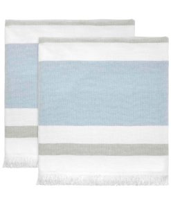 The Izod Clubhouse Stripe Blue 2-Pack Hammam Bath Towel Set features a medium blue, grey and white woven stripe design finished with fringe on both ends. The hammam-style towel is flat woven on one side and reverses to terry–lightweight and fast-drying. 100% cotton, two 30" x 56" towels.
