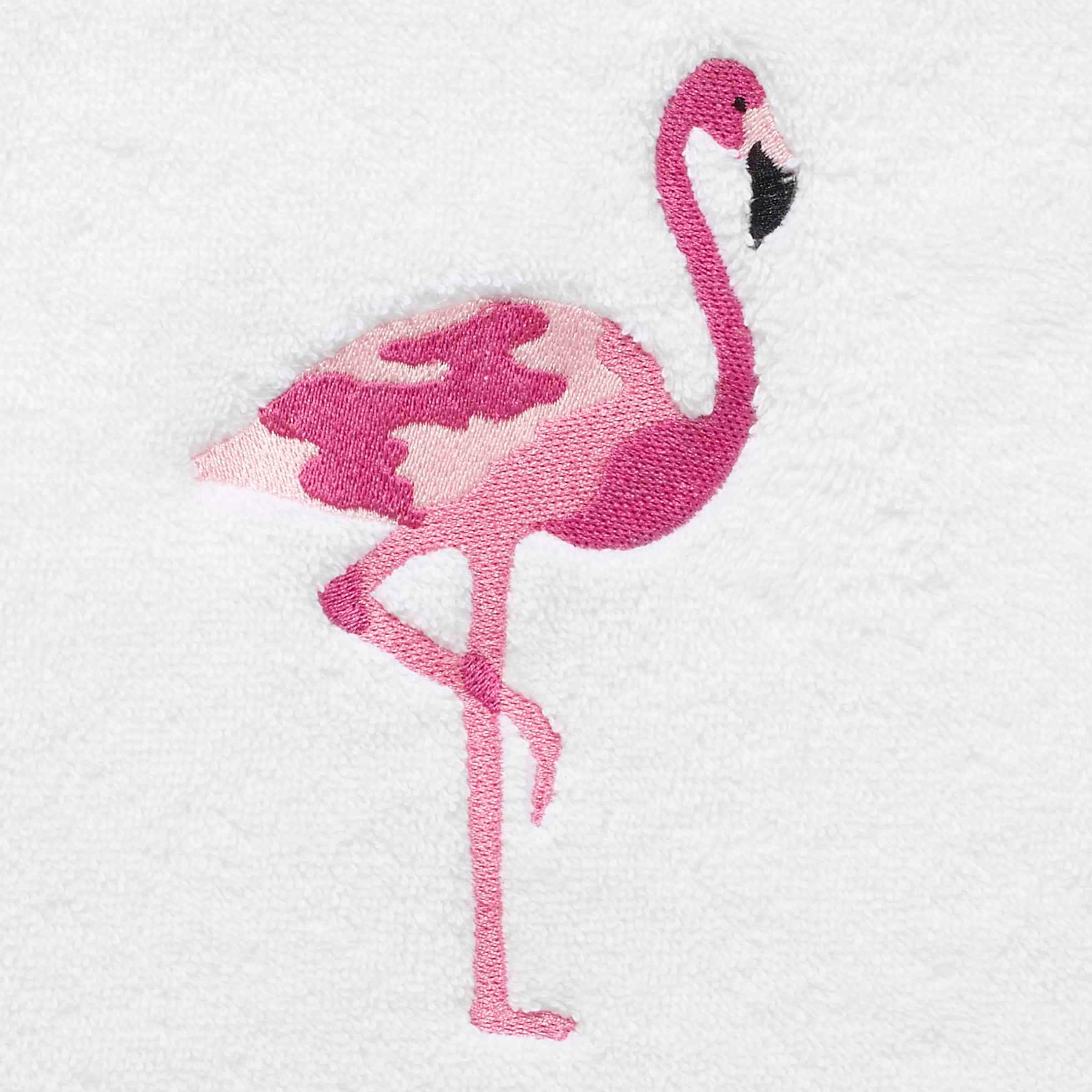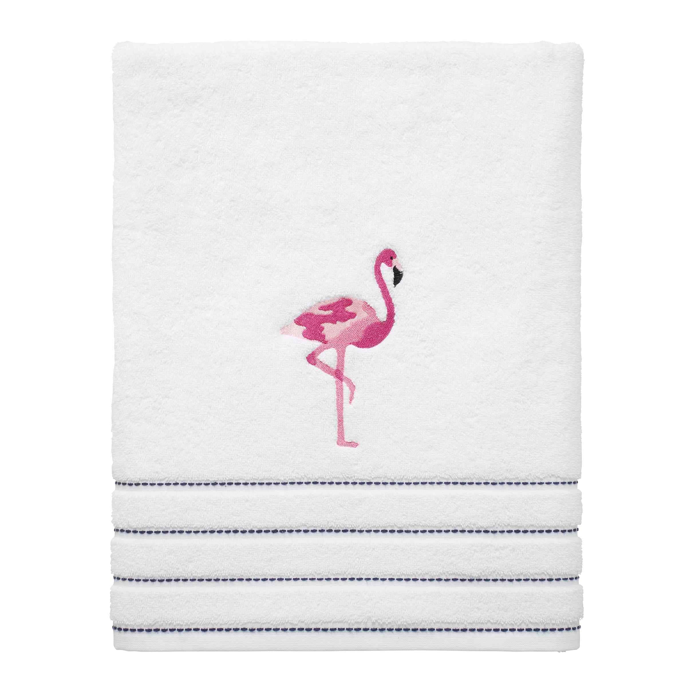 The Izod Flamingo White 2-Pack Bath Towel Set features an intricately embroidered pink flamingo standing on one leg on a white terry ground with coordinating navy blue polyester ticking stripes. Includes two 100% cotton 27" x 54" towels. Coordinating rug and shower curtain available.