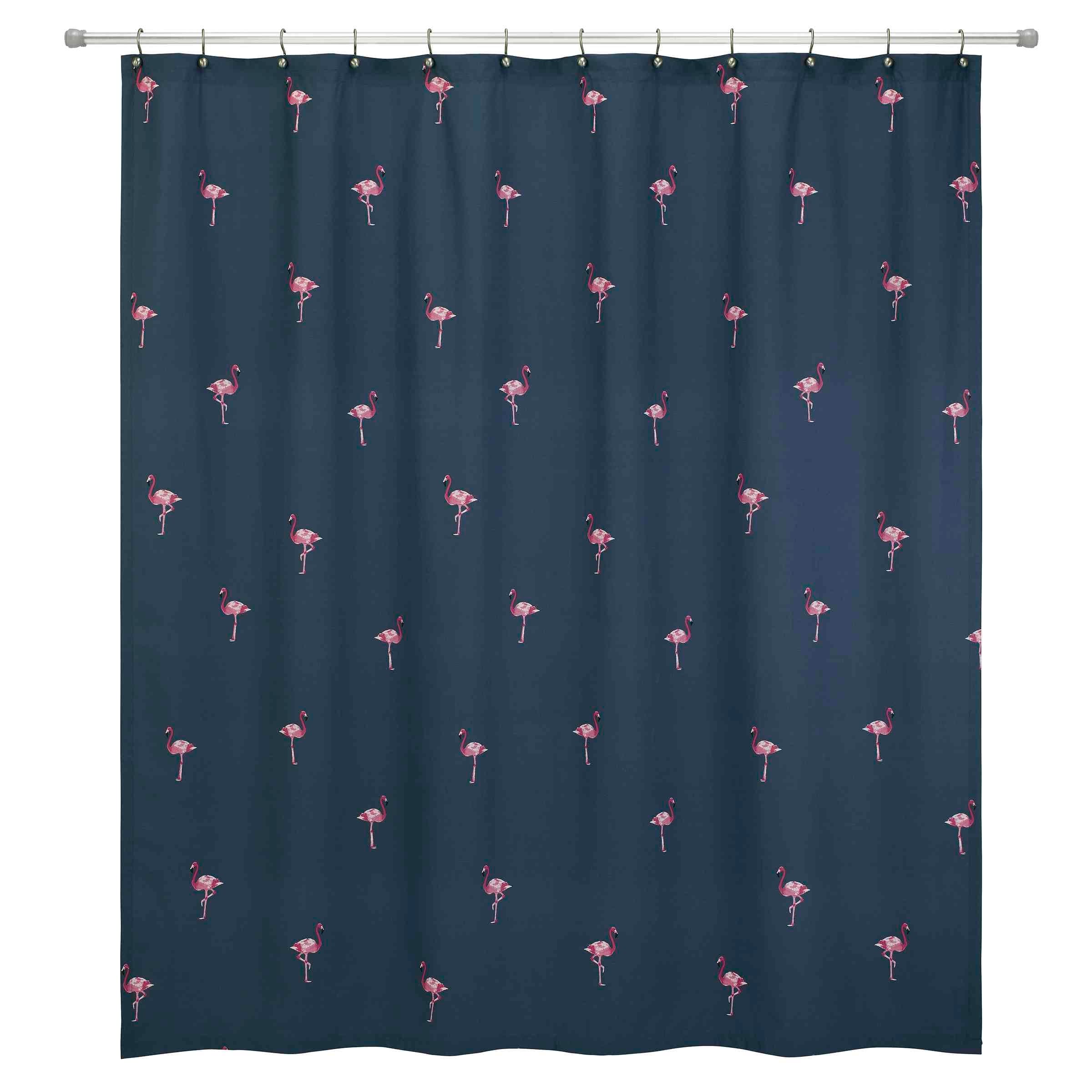 The Izod Flamingo Shower Curtain features a flamboyance of flamingos printed in vibrant pink against a navy blue background. The cloth is a 52% polyester, 48% cotton heavyweight twill fabric for easy-care and a great look. 72" x 72".