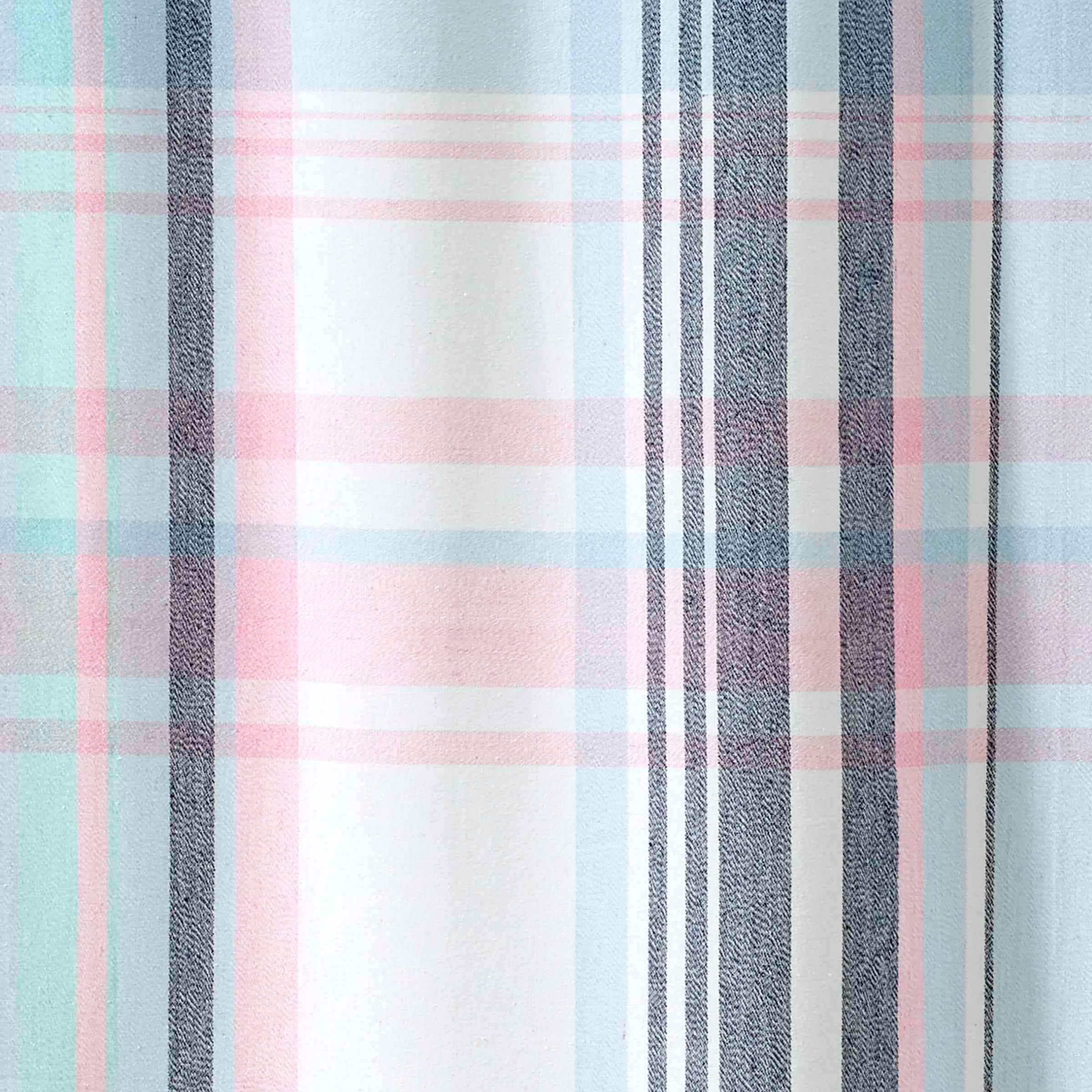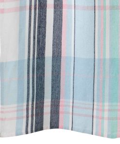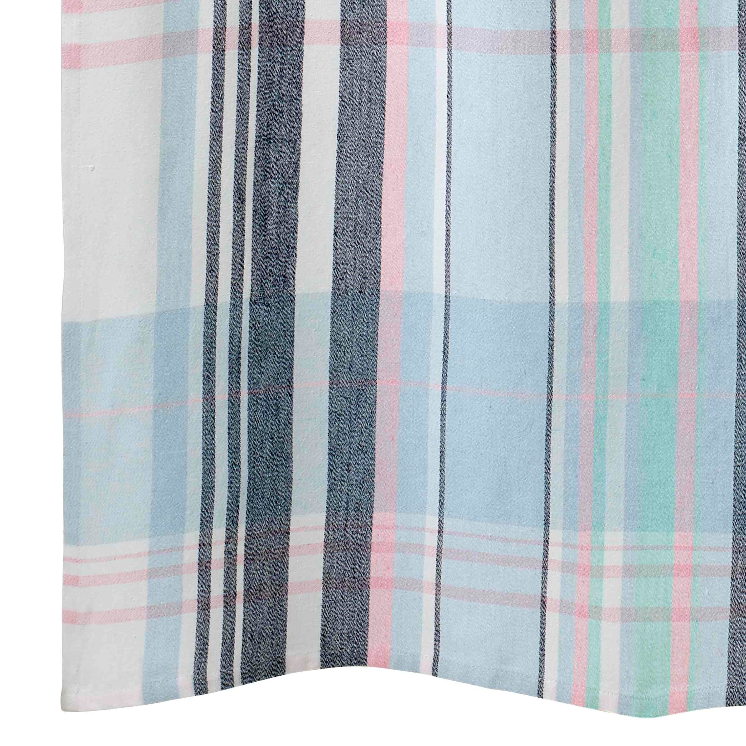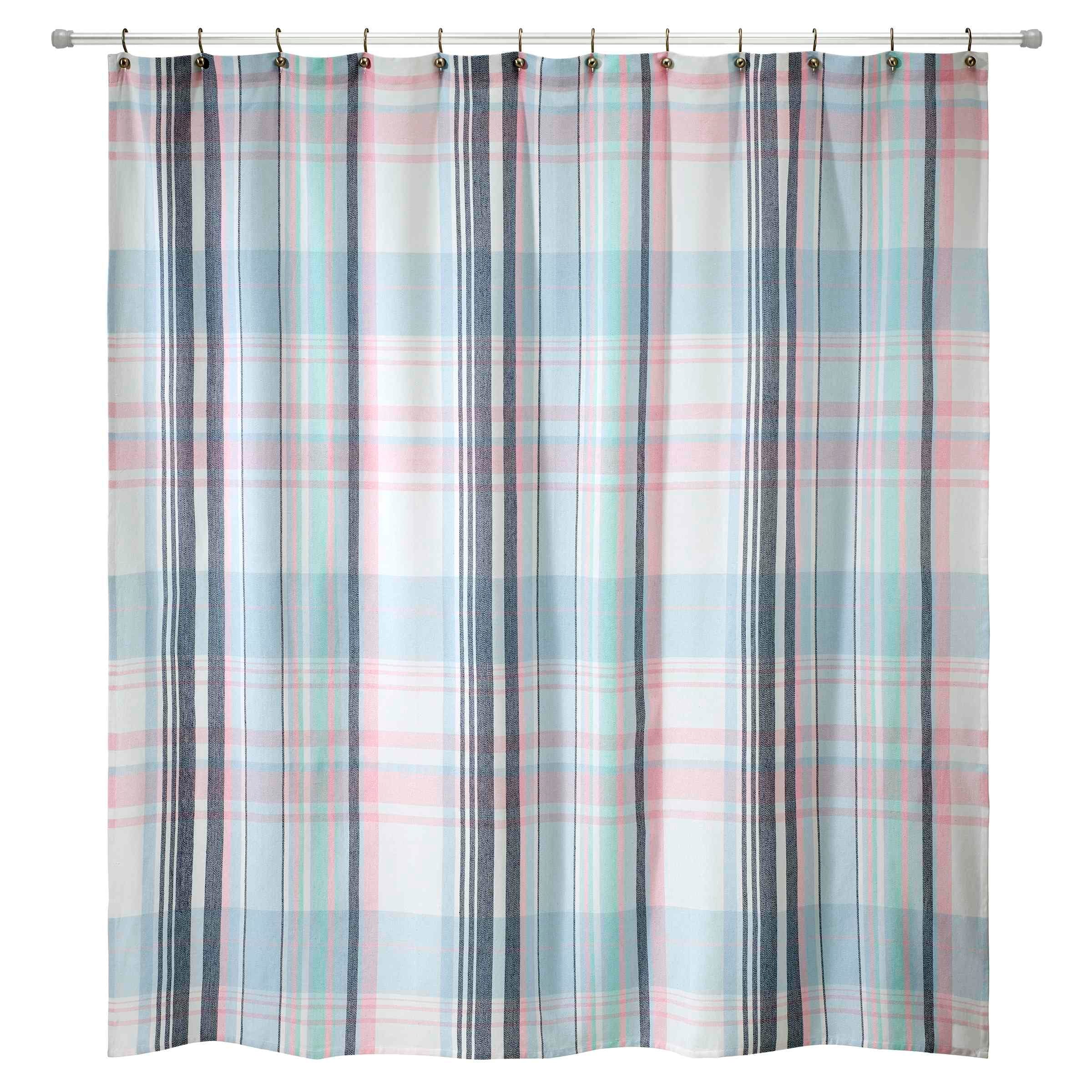 The Izod Heritage Plaid Shower Curtain features a classic madras plaid pattern in various shades of blue-from light blue to navy-with accents of pink. The yarn-dye woven fabric is made of 65% Cotton and 35% Polyester for soft feel.