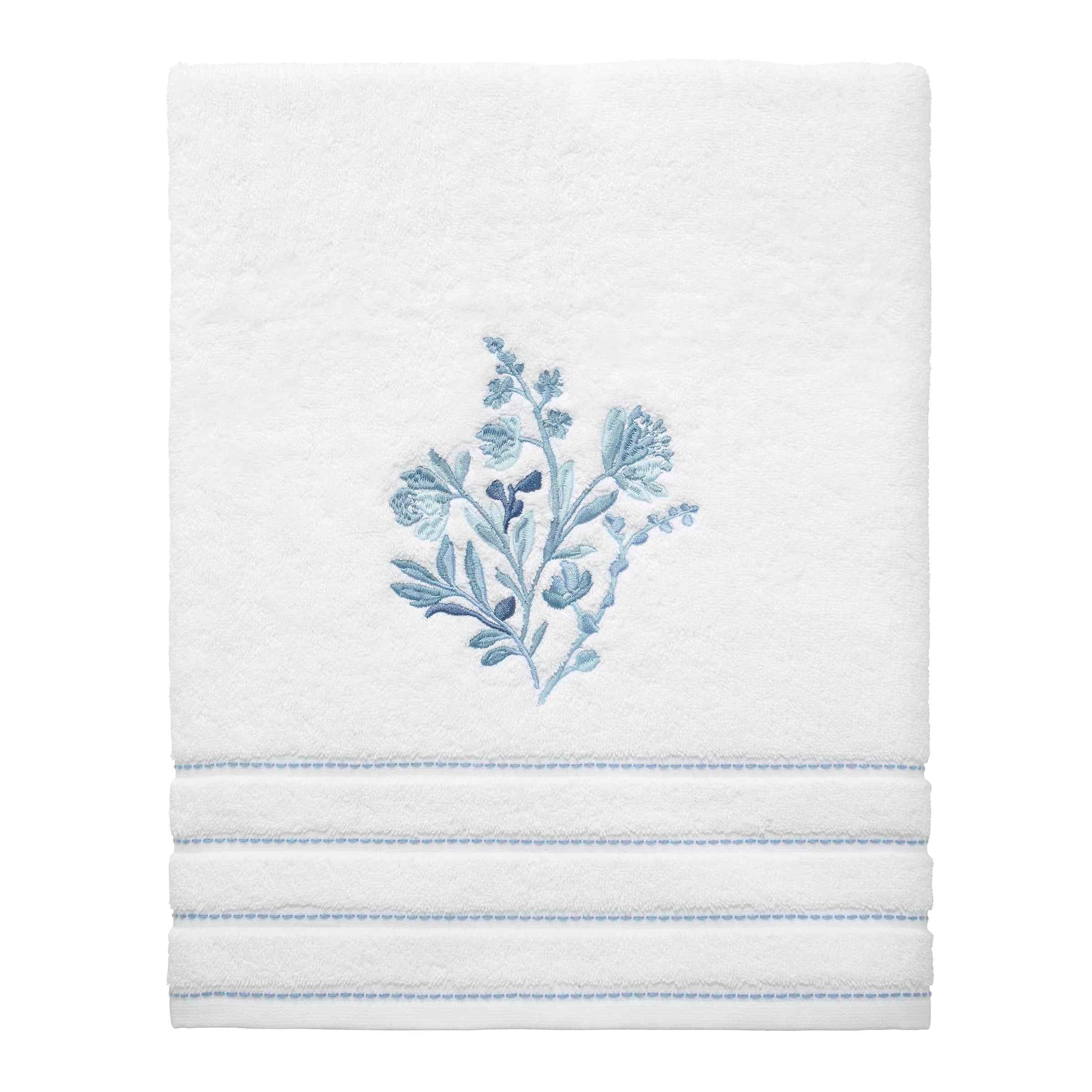 The Izod Mystic Floral White 3-Piece Towel Set features an intricately embroidered floral design in light-to-medium blues on a white terry ground with coordinating medium blue ticking stripes. 100% cotton (excl. of stripes). Incl. one ea. of bath (27"x54"), hand (16"x28"), fingertip (11"x18").