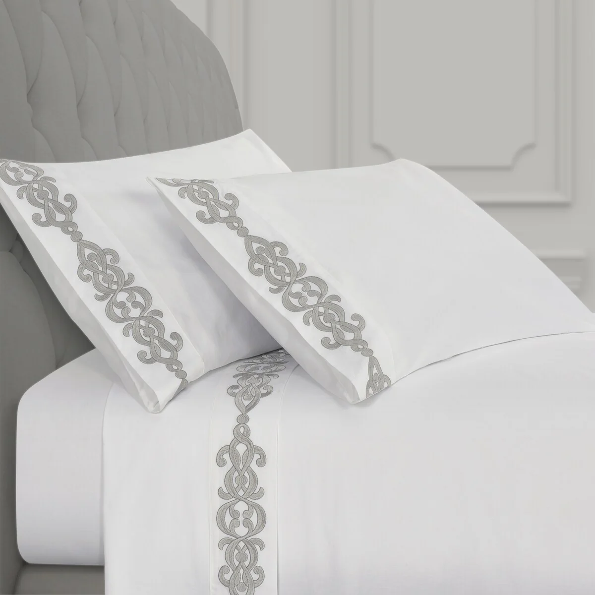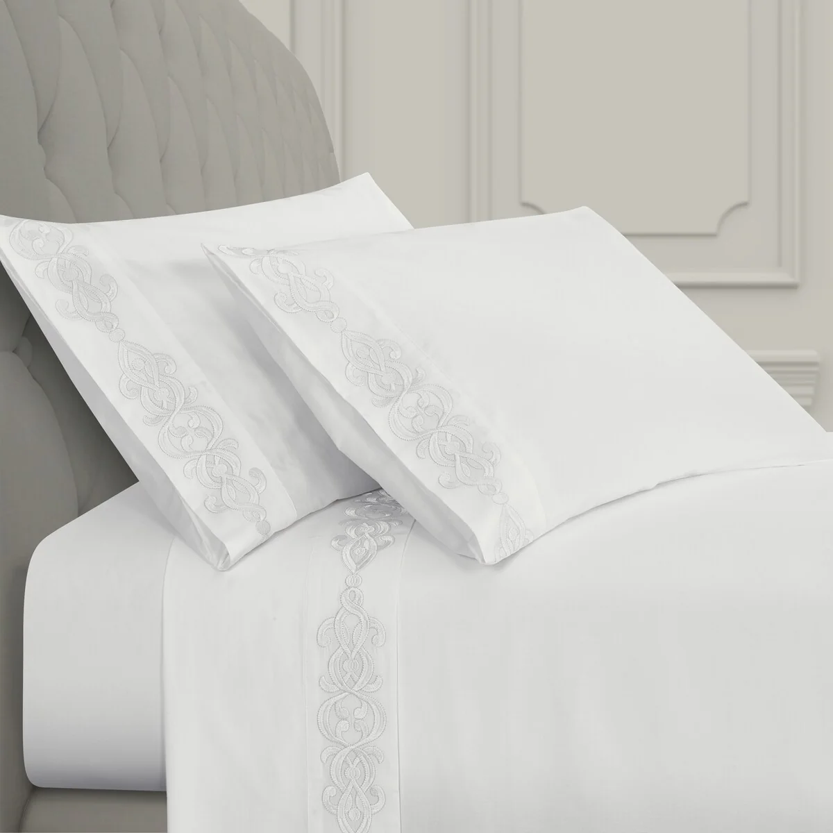 Add a luxurious foundation to your bed with the Imperial Embroidered Sheet Set. Featuring an updated stylized scroll embroidery design, detailed with a darker stitch outline for a stunning shadow effect and further definition. Crafted with plush 100% Cotton fabric that feels cool, soft to the touch, and breathable for a rejuvenating night’s sleep. The sheets are available in multiple colors to coordinate beautifully with the J. Queen New York Bedding collections and are machine washable for easy care. Includes 1 flat sheet, 1 fitted sheet, and 2 pillowcases.