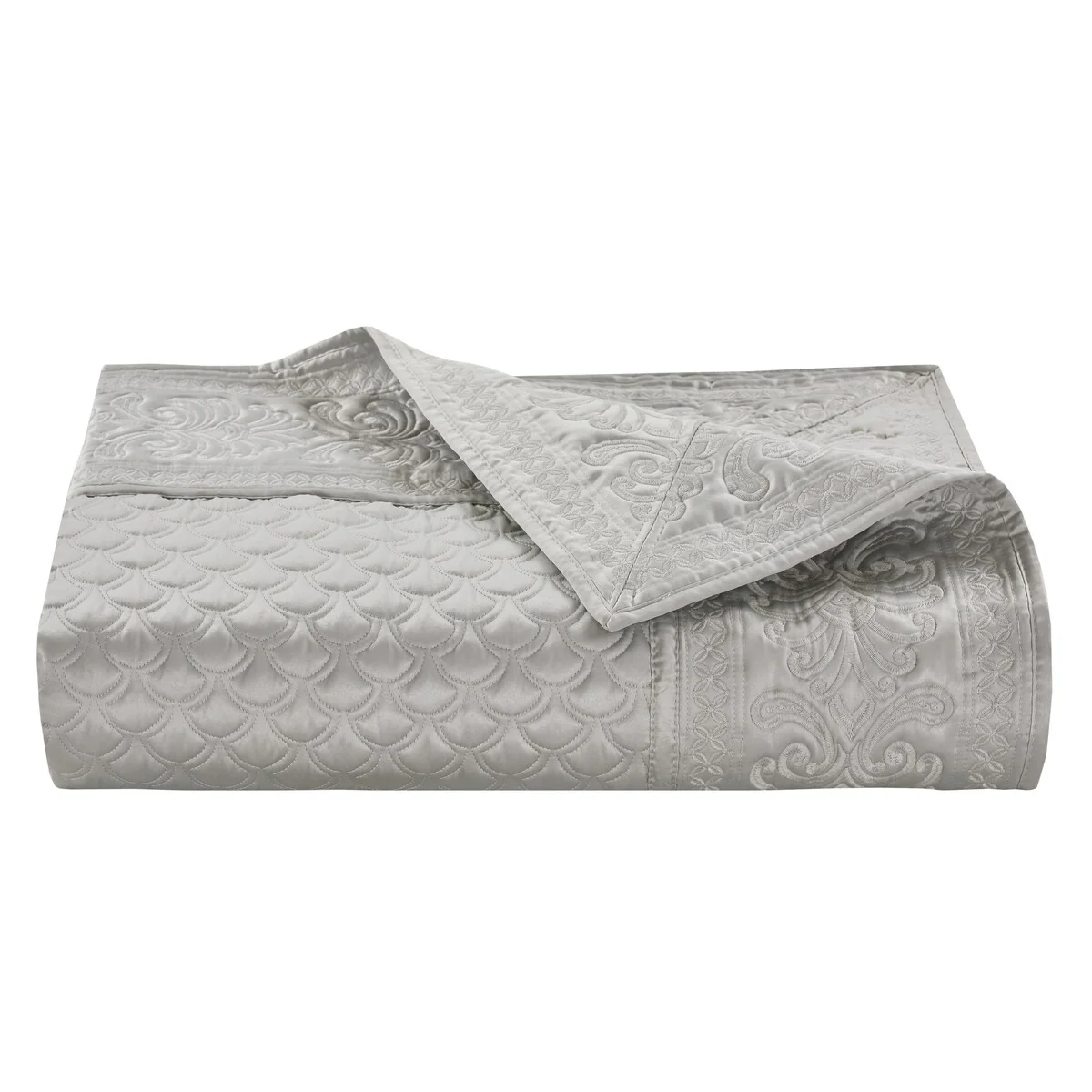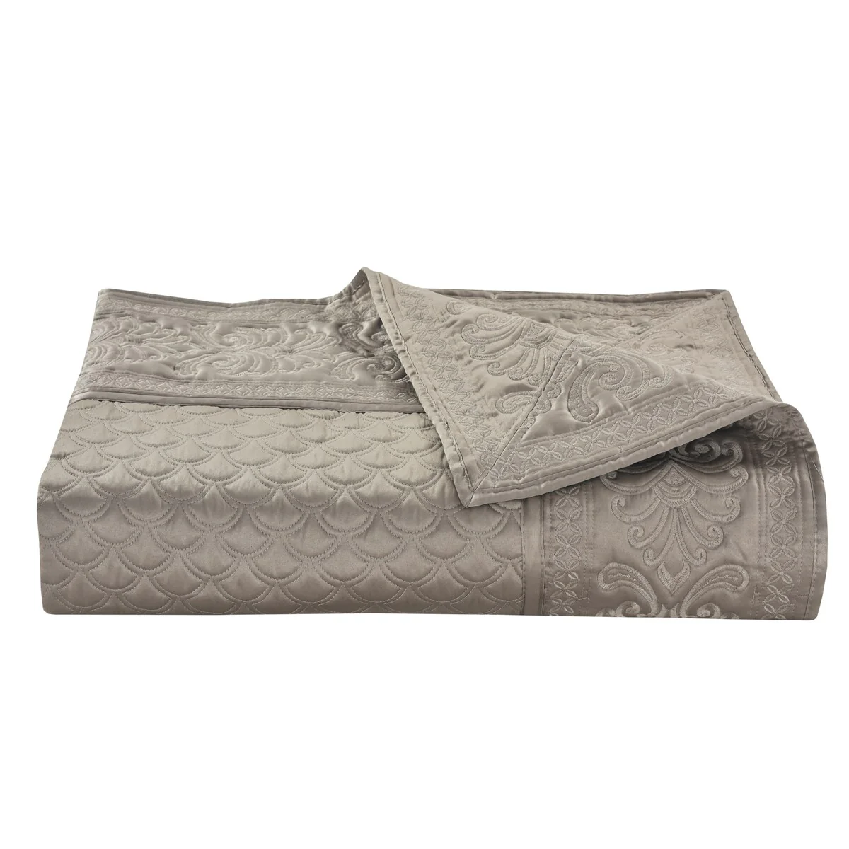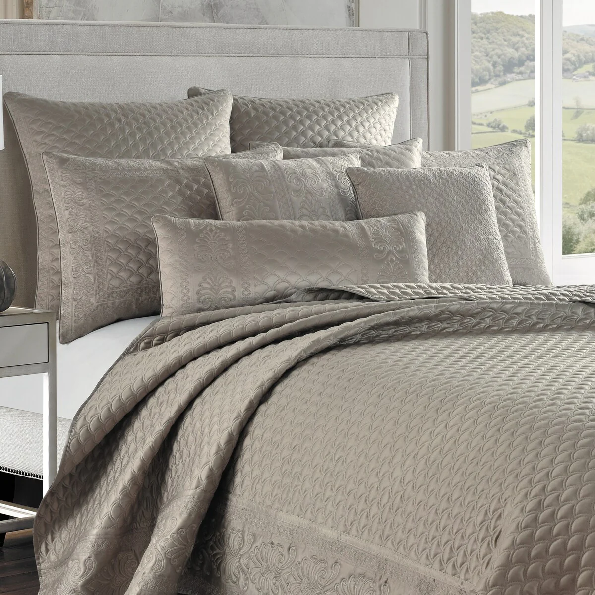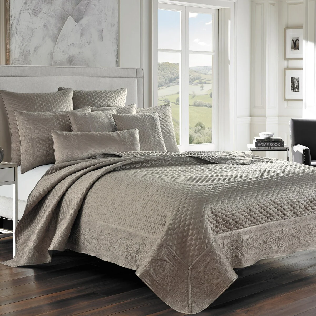 Bring a touch of luxury to your bedroom with the J. Queen New York Lyndon Coverlet Quilt. This traditional quilt/coverlet features plush fabric finished with a subtle matte satin, adding dimension and style to your decor. The machine-quilted design is bordered with an elegant foulard and damask embroidery, mitered at the corners, and edged with self-piping. Available in multiple fashionable colorways, complete the elegant look with the coordinating shams and throw pillows.