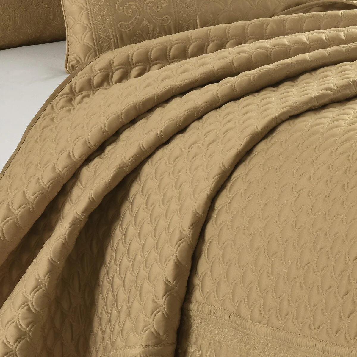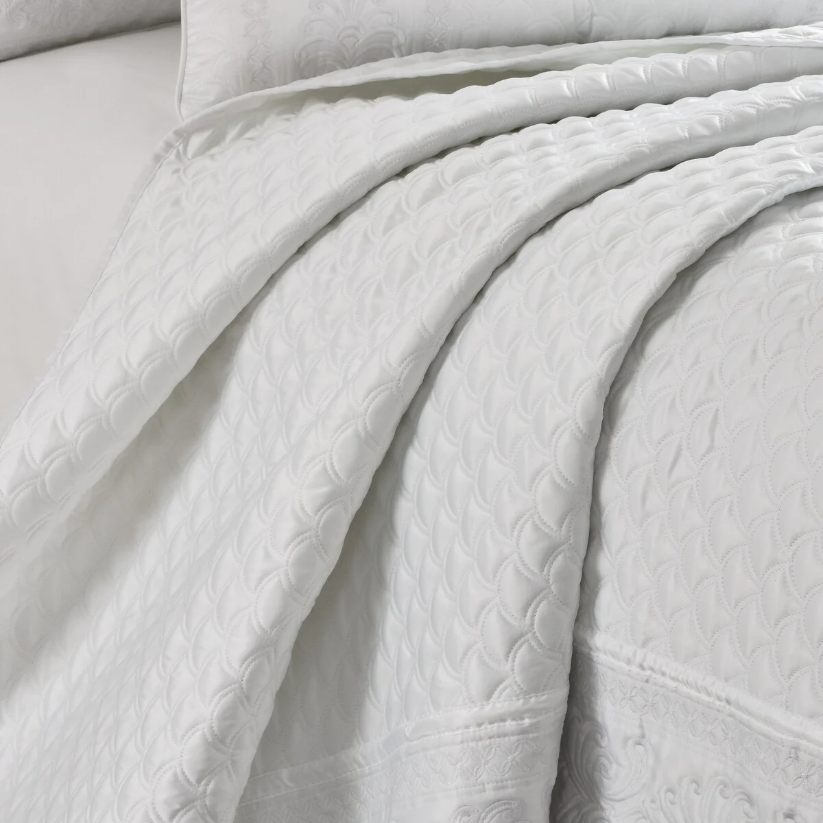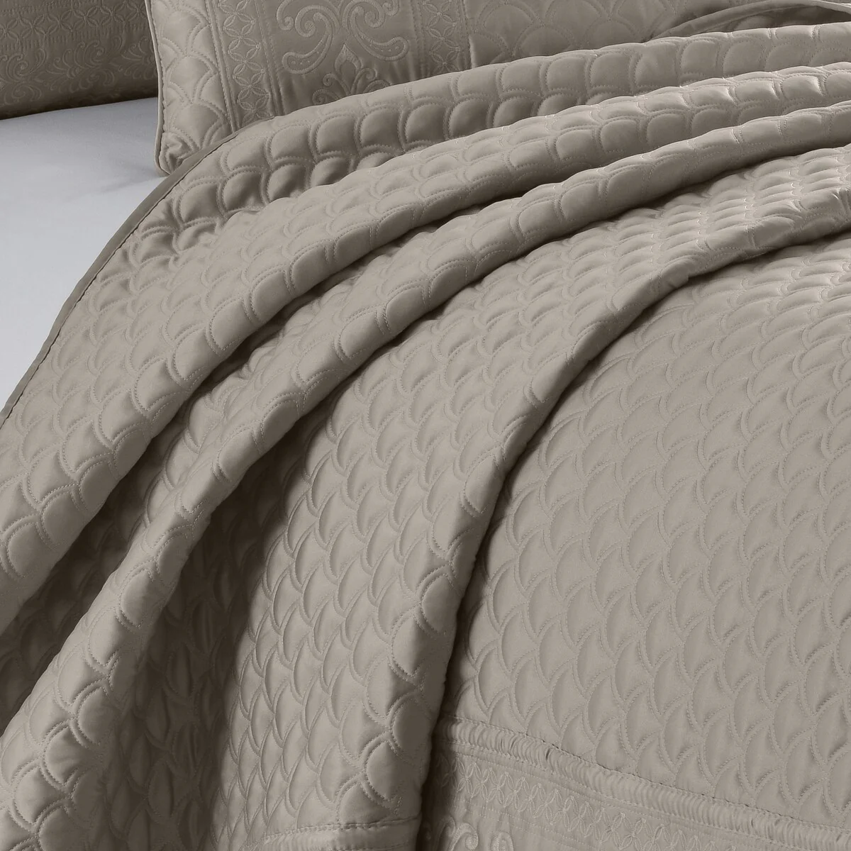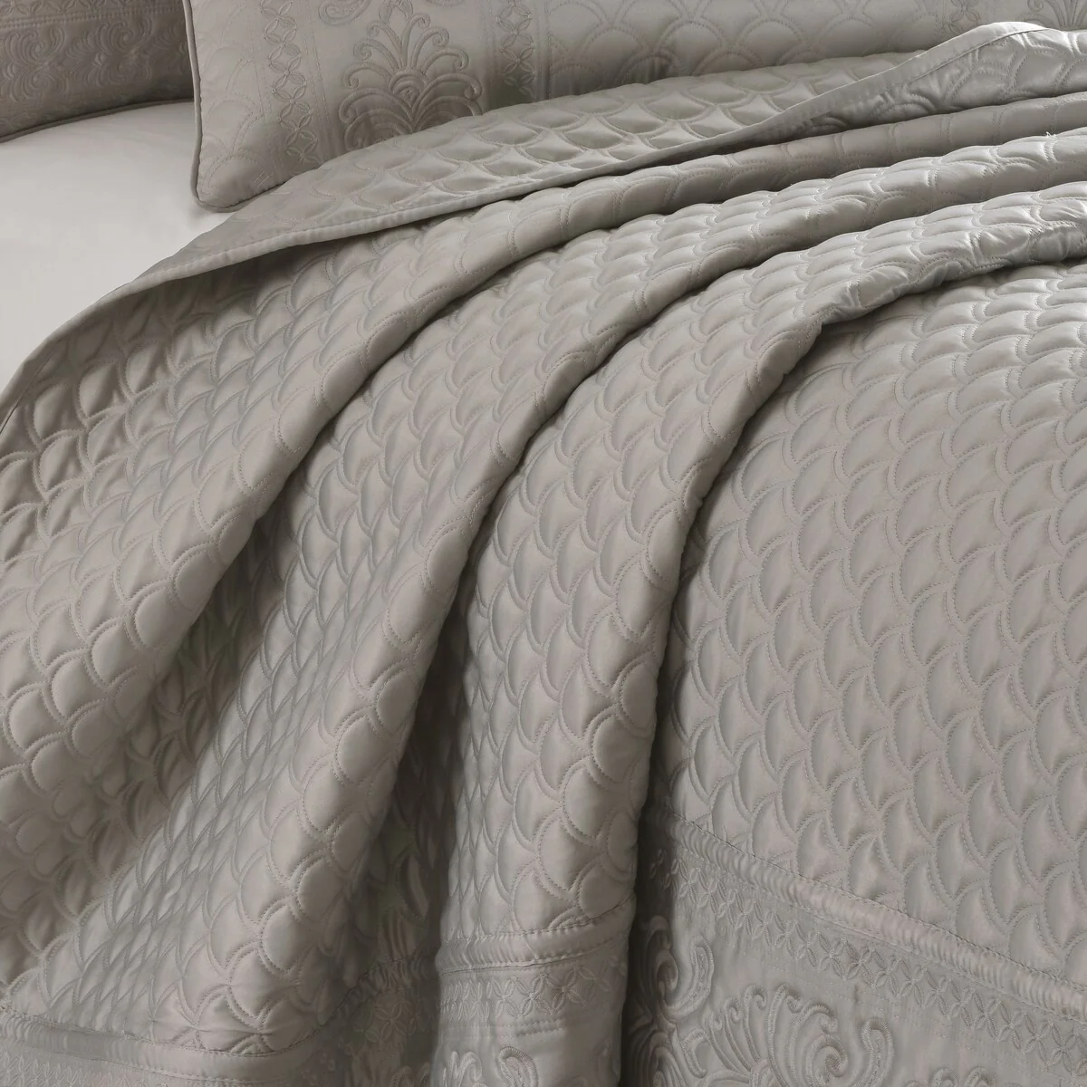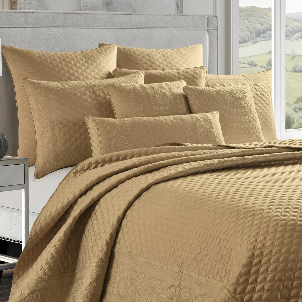 Bring a touch of luxury to your bedroom with the J. Queen New York Lyndon Coverlet Quilt. This traditional quilt/coverlet features plush fabric finished with a subtle matte satin, adding dimension and style to your decor. The machine-quilted design is bordered with an elegant foulard and damask embroidery, mitered at the corners, and edged with self-piping. Available in multiple fashionable colorways, complete the elegant look with the coordinating shams and throw pillows.