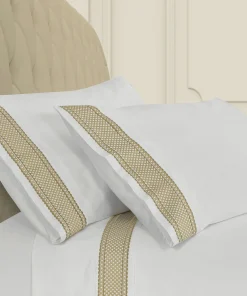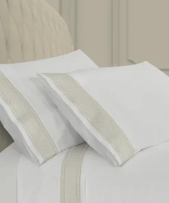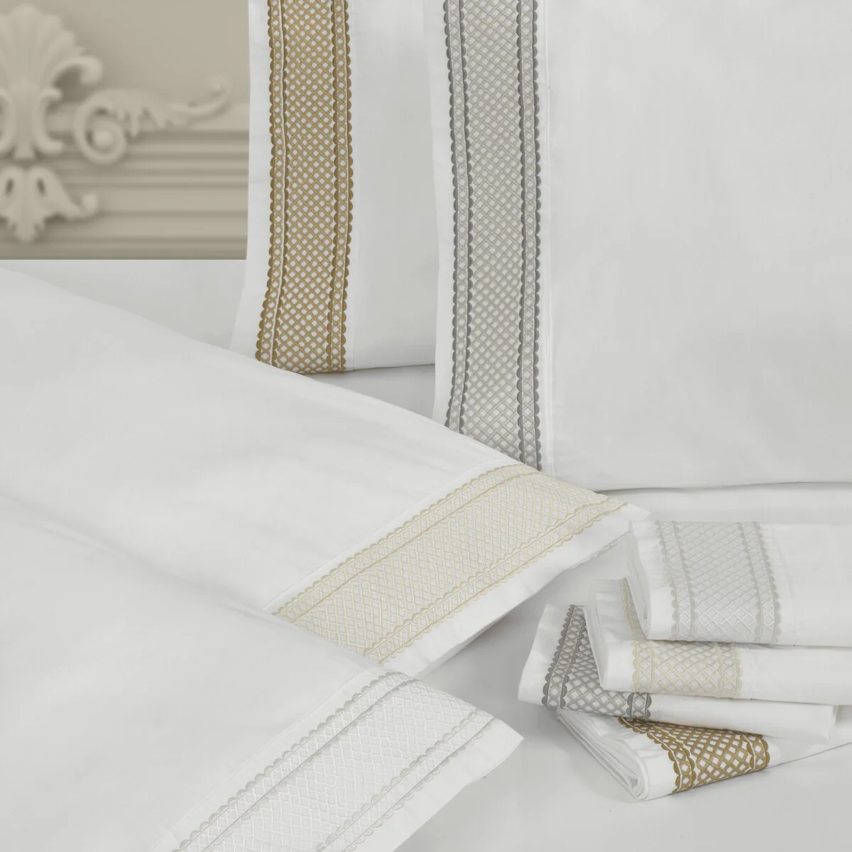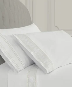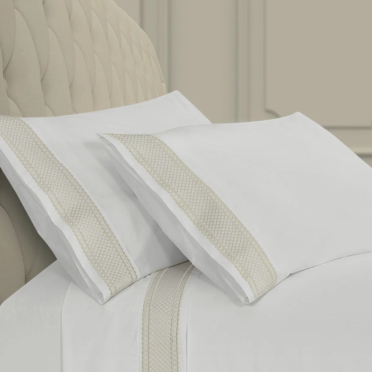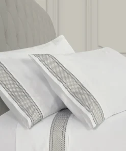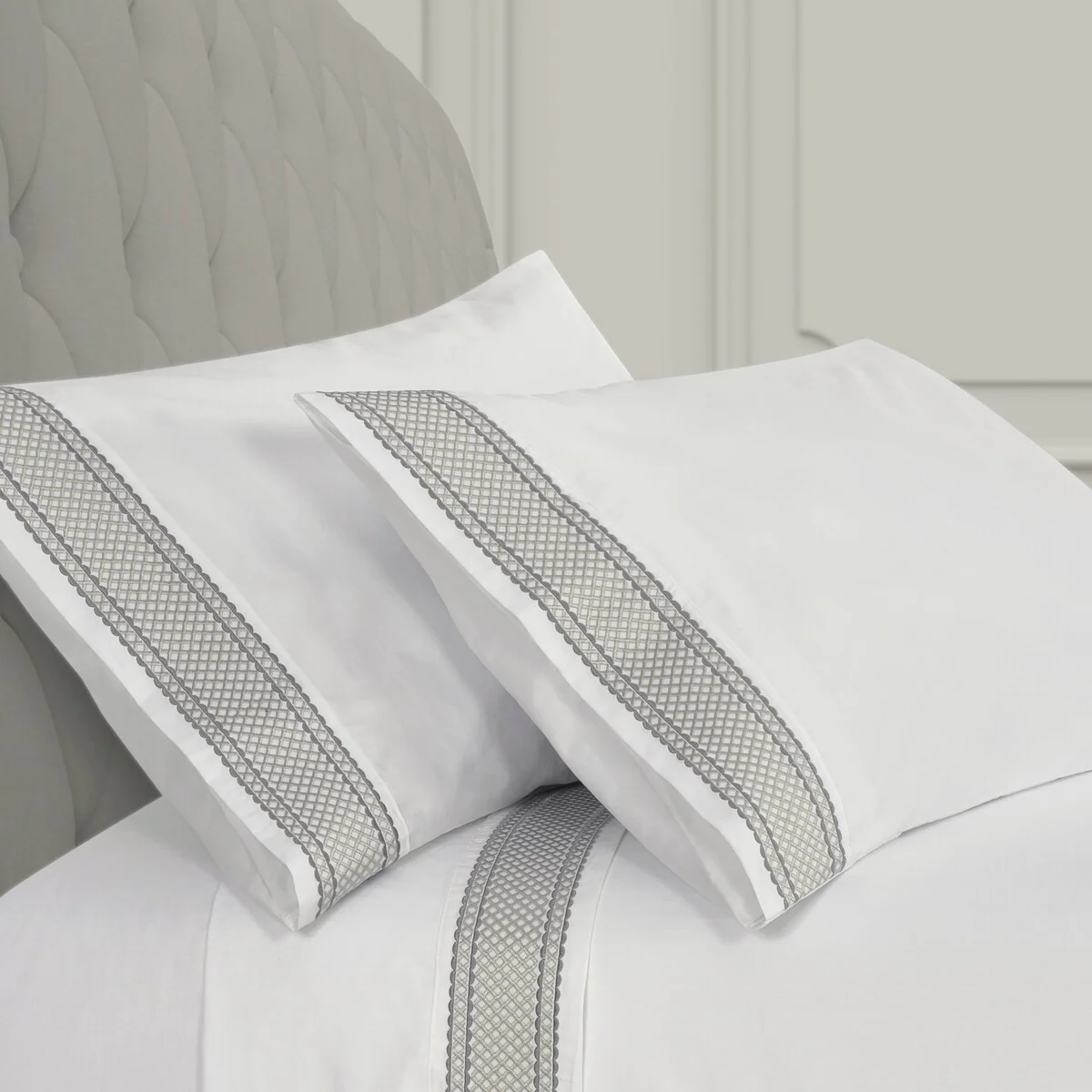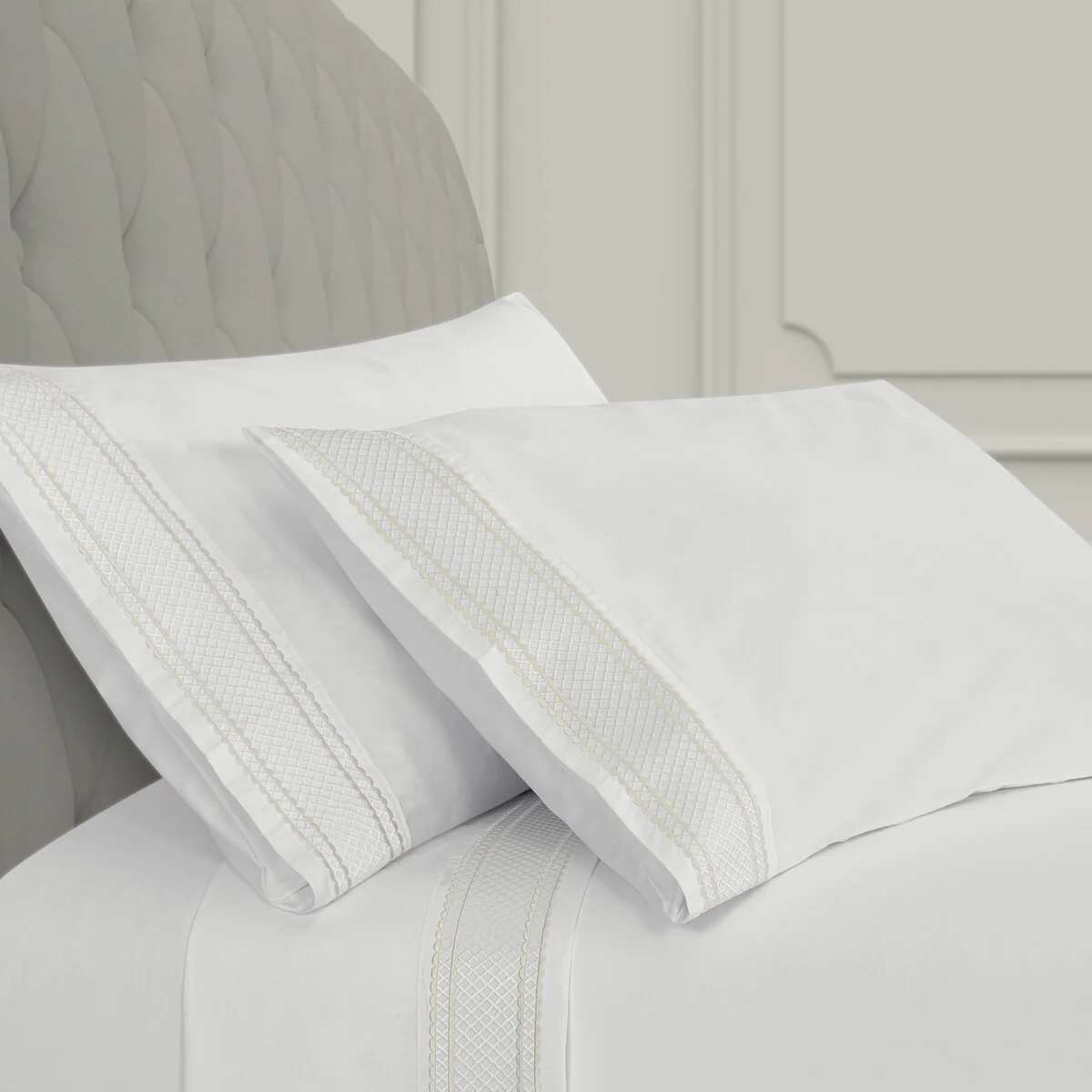 Add a luxurious foundation to your bed with the Monarch Embroidered Pillowcase Pair. Featuring an embroidered border design, carefully constructed around the centered lattice design. The border is framed with a darker scalloped edge on the top and bottom, providing a dimension of decorator’s detail. Crafted with plush 100% Cotton fabric that feels cool, soft to the touch, and breathable for a rejuvenating night’s sleep. The pillowcases are available in multiple colors to coordinate beautifully with the J. Queen New York Bedding collections and are machine washable for easy care.
