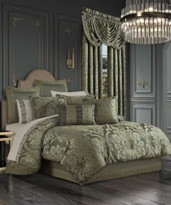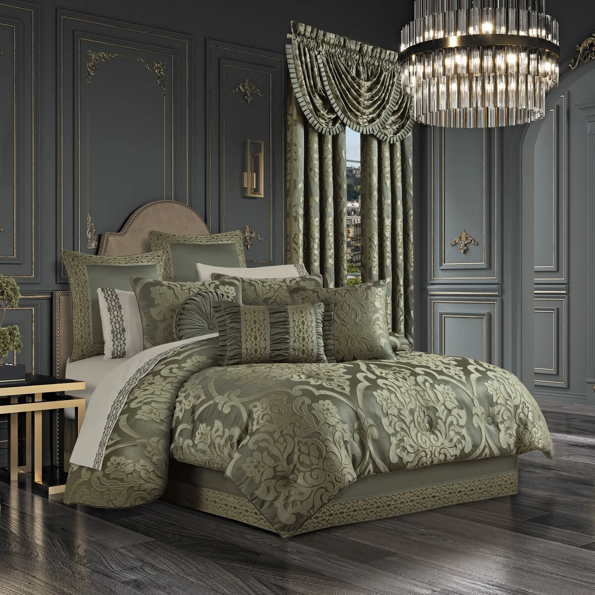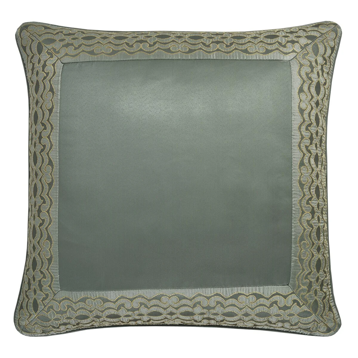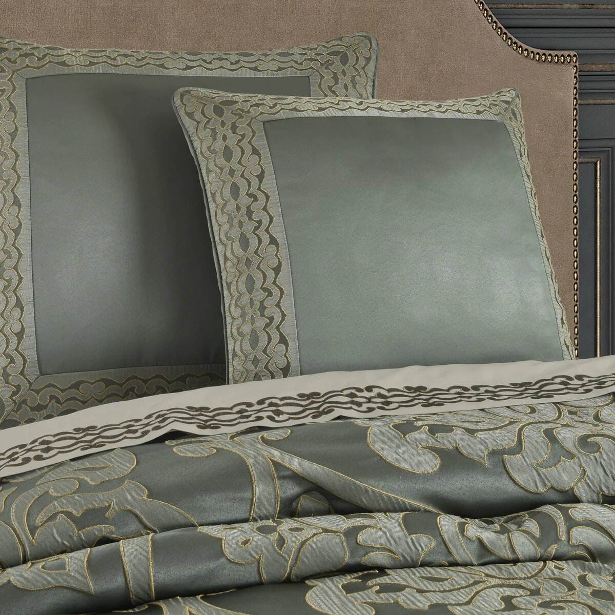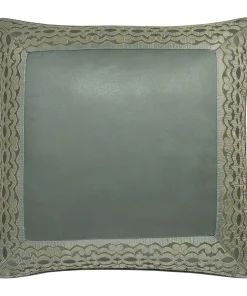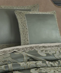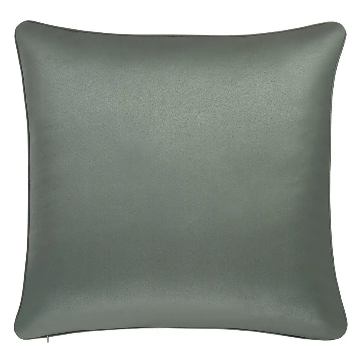 The Santino Euro Sham is beautiful accent to your bedding decor. Featuring a jade colored satin, finished with a delicate border design as a dramatic frame. Trimmed with a 1/4"piping and it reverses to a solid jade satin with a hidden zipper closure. This lovely backdrop coordinates with the comforter set and accessories (each Euro sold separately)