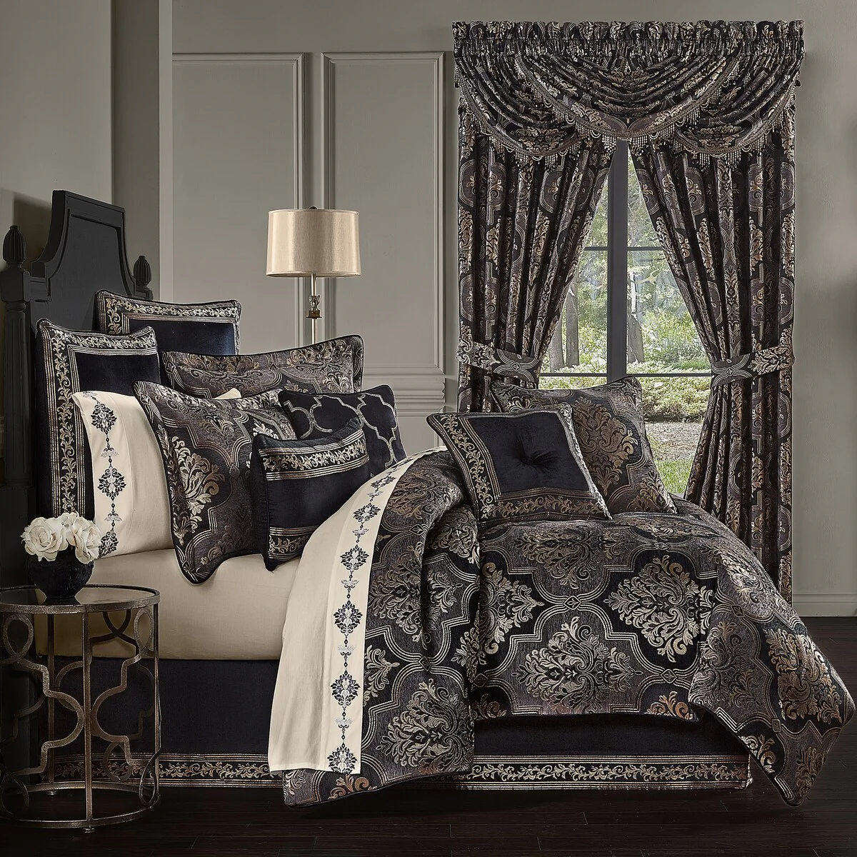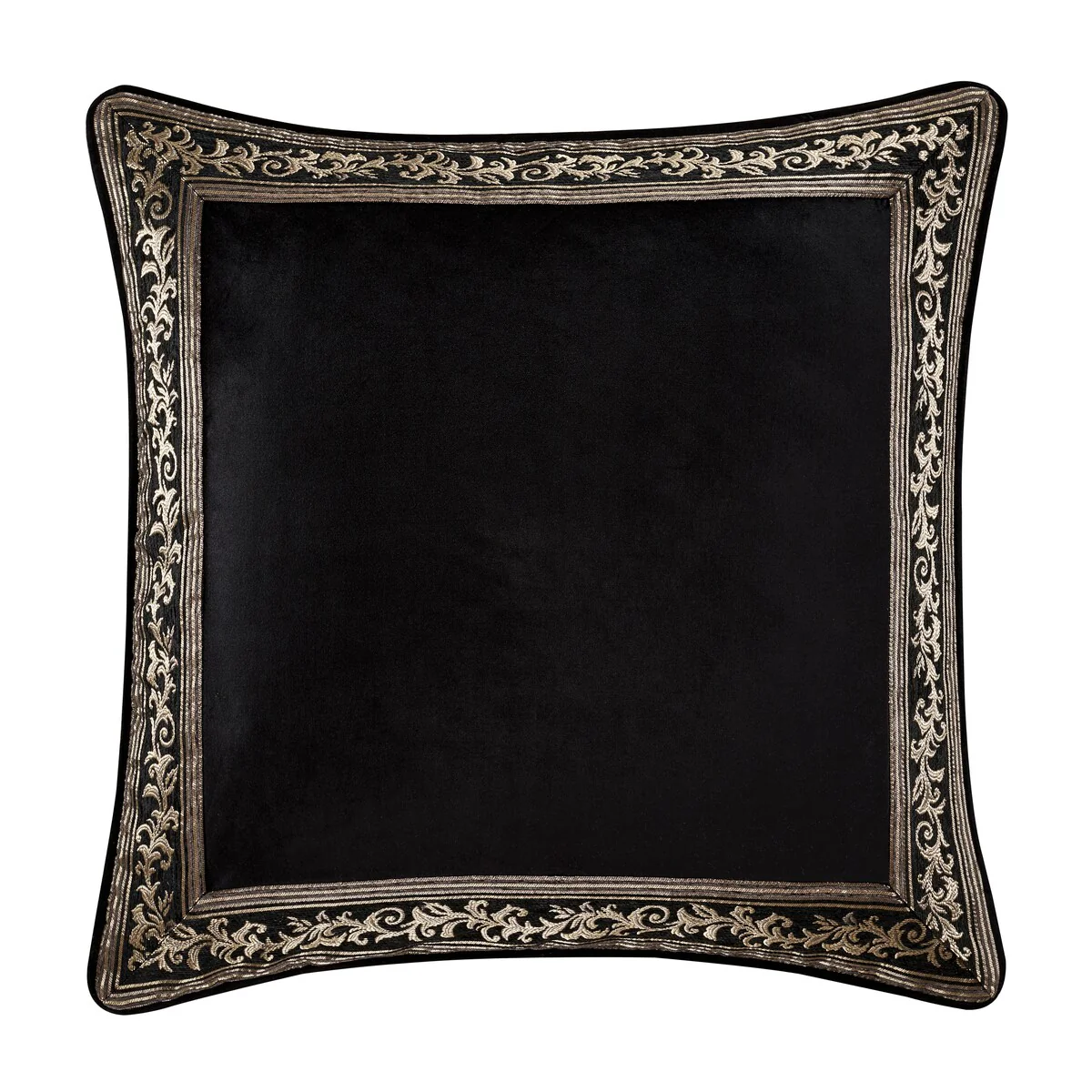 The Windham Euro Sham is beautiful accent to your bedding decor. Featuring a black velvet in the center with a scroll stripe border that is framed and mitered on all four sides. The sham reverses to vertical scroll stripe with 1/4" piping in black rayon cotton velvet. Pair this pillow sham with the Windham Bedding set for a complete look.