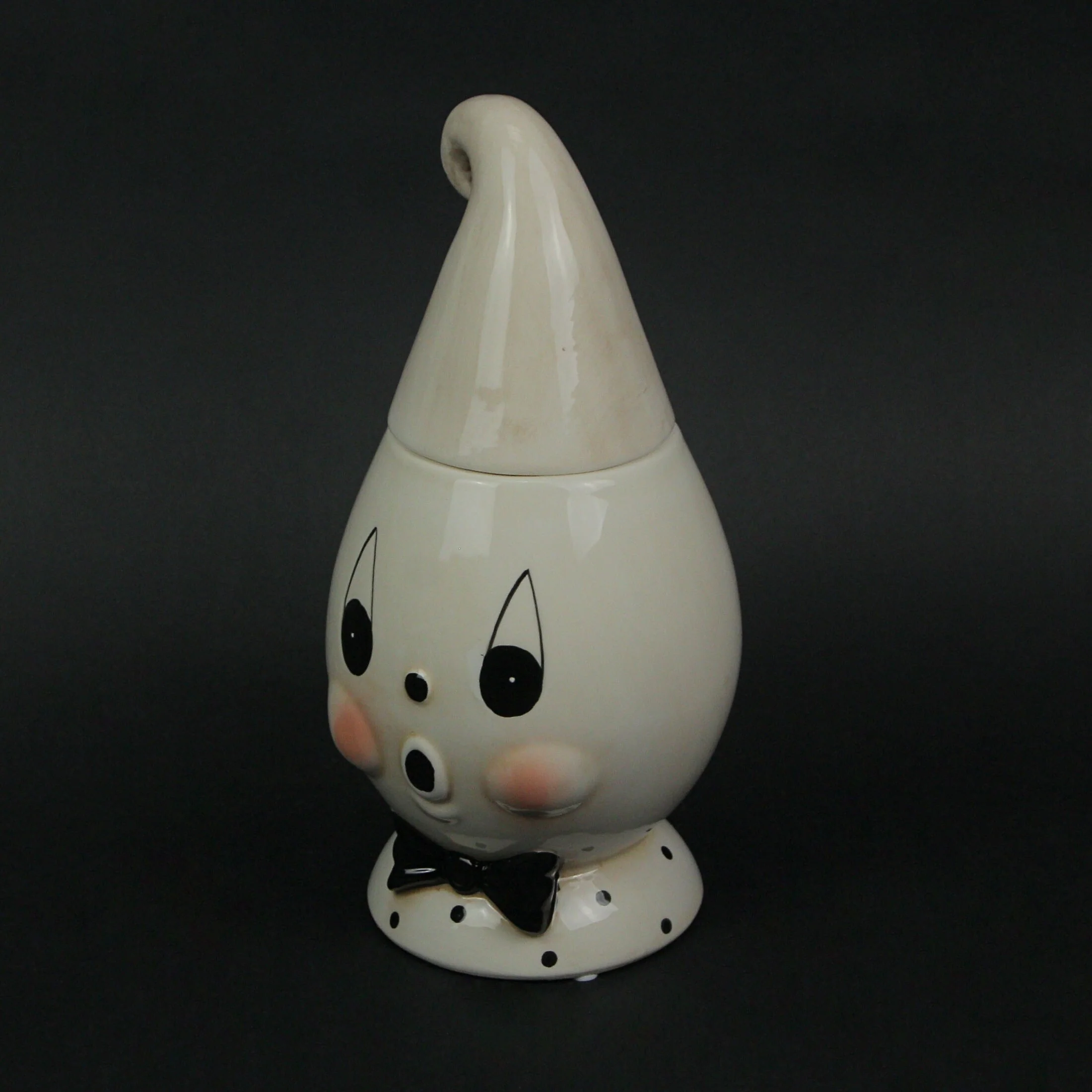 Give your home a touch of vintage spooky style with this adorable Boo! bow tie ghost cookie jar. Designed by artist Johanna Parker. it is crafted from dolomite ceramic, with a hand-glazed finish for years of maintenance-free display. The top of Boo’s head lifts off to store your favorite treats. It is food-safe, but hand-washing is recommended. The cookie jar measures 11.25 inches high, and 5.5 inches in diameter. Don’t miss out on this wonderful take on one of Johanna’s best-known designs.