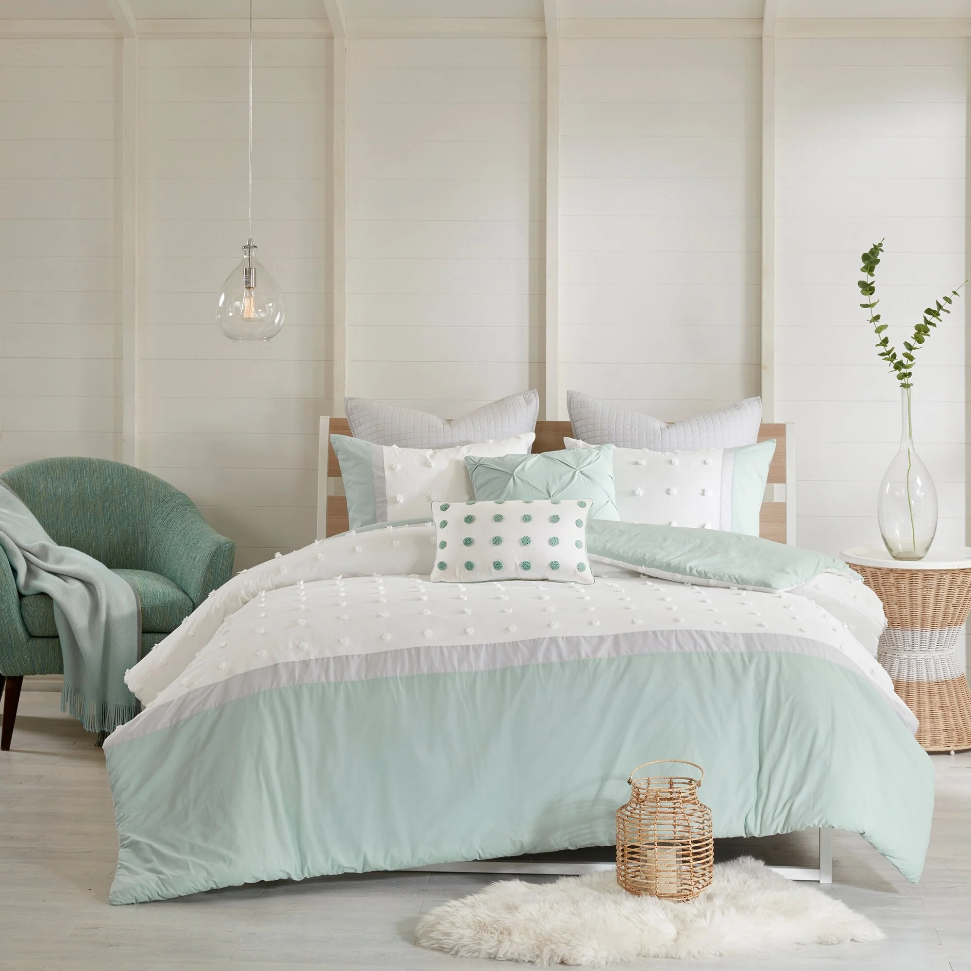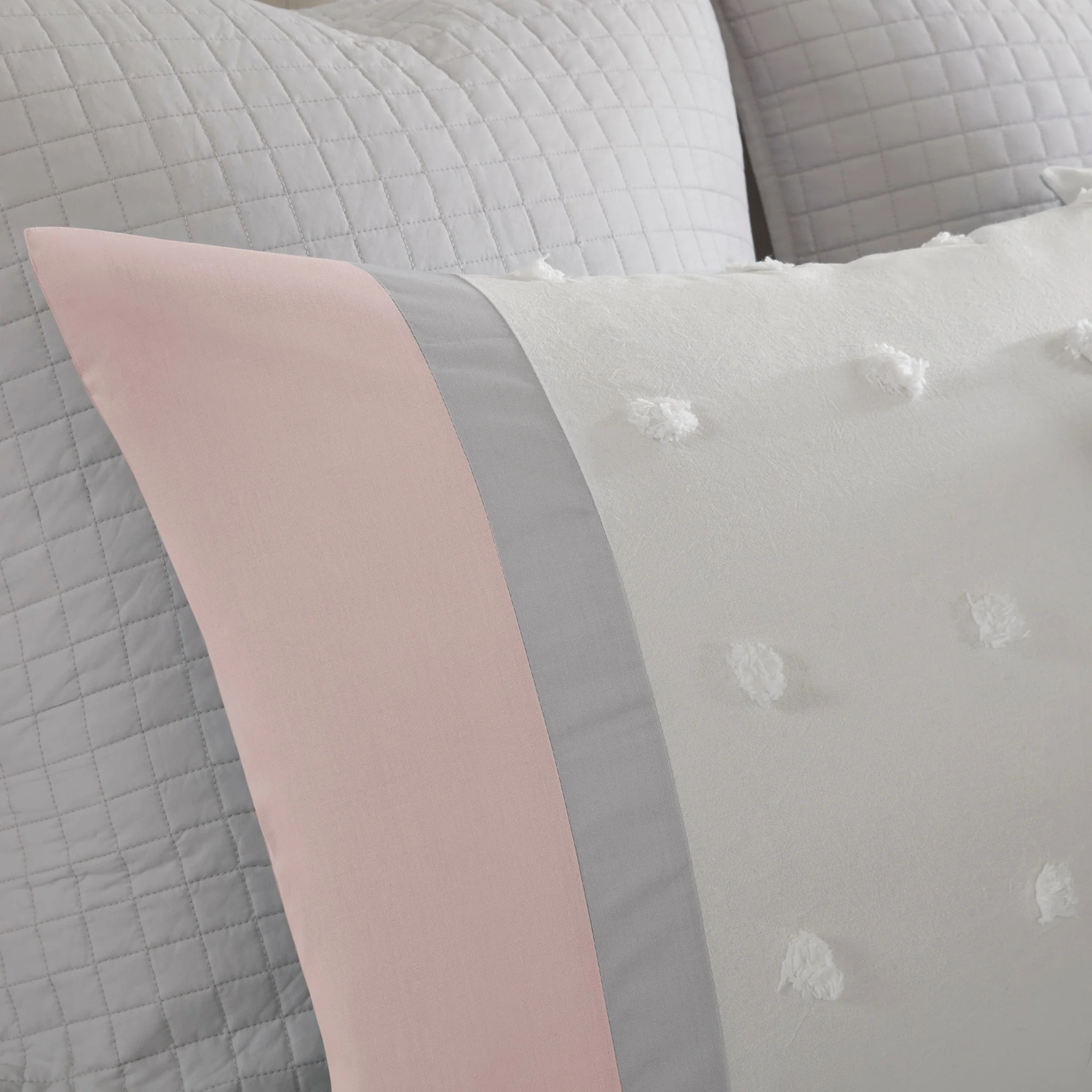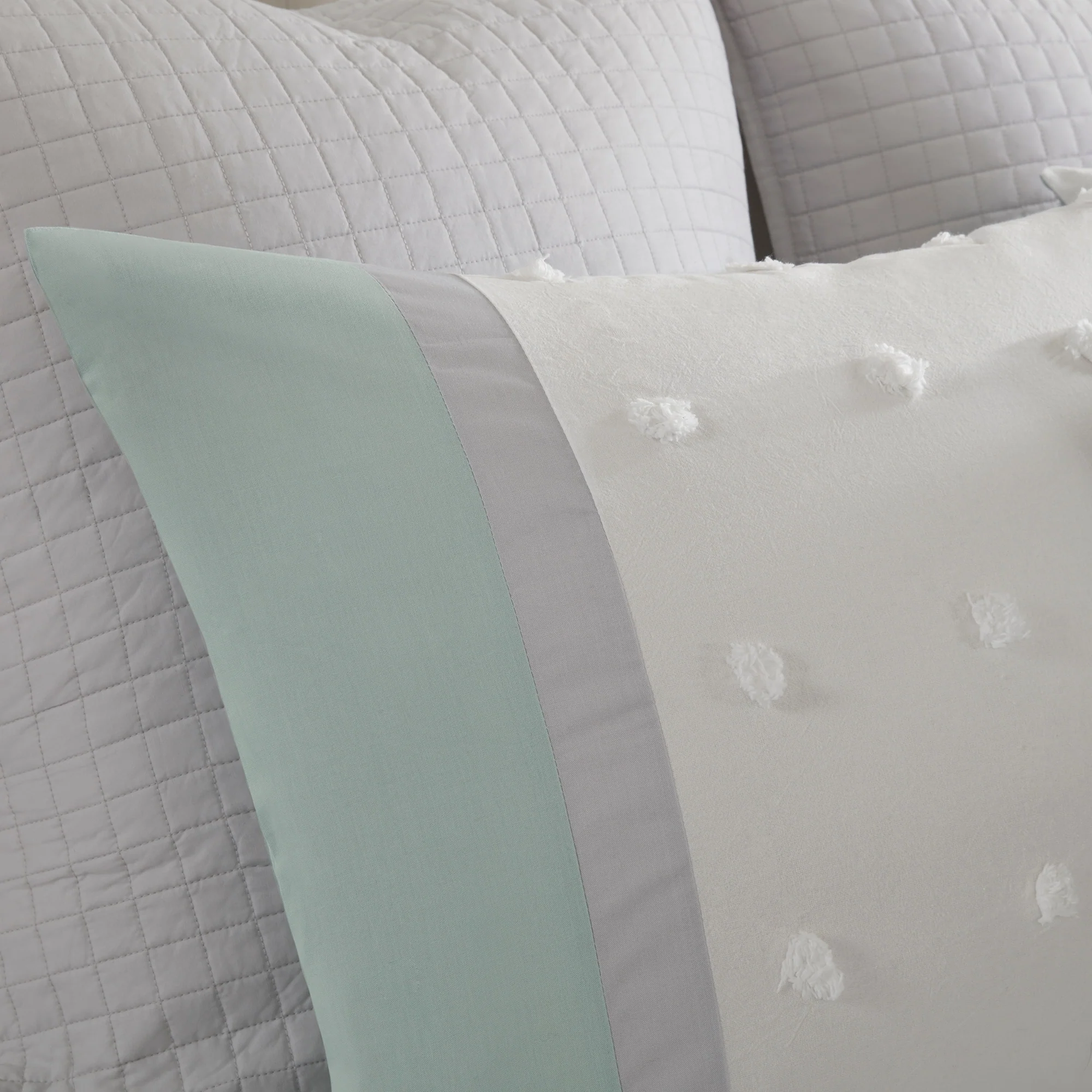 Stylish and comfortable, the Urban Habitat Jojo 7 Piece Cotton Jacquard Duvet Cover Set is the perfect update for your bedroom. The 100-percent cotton duvet cover and shams showcase a pieced design in ivory, grey, and colorful hues accented by jacquard tufted dots with a solid reverse. Two quilted Euro shams add extra dimension to the bed, while two decorative pillows add the finishing touches. This bedding set is also OEKO-TEX certified, meaning it does not contain any harmful substances or chemicals to ensure quality comfort and wellness. Button closures on the duvet cover secure a padded insert (NOT included) within the duvet cover and internal corner ties prevent it from shifting.