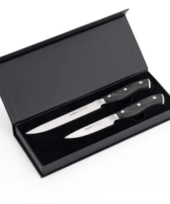 Your new 5.5” Utility Knife and 3.5” Paring Knife each have a 4.5” curved handle for a comfy grip, and in balance with the sharp 2.1mm blade. You now have two incredibly useful knives for most meats, vegetables and fruits and non-food things! High Carbon German Steel Blades, wrapped in a classic Pakkawood handle, nestled in a luxury gift box. Multipurpose knives for chopping fine herbs, tough vegetables or fruits, toddler sandwiches and kids’ lunches.