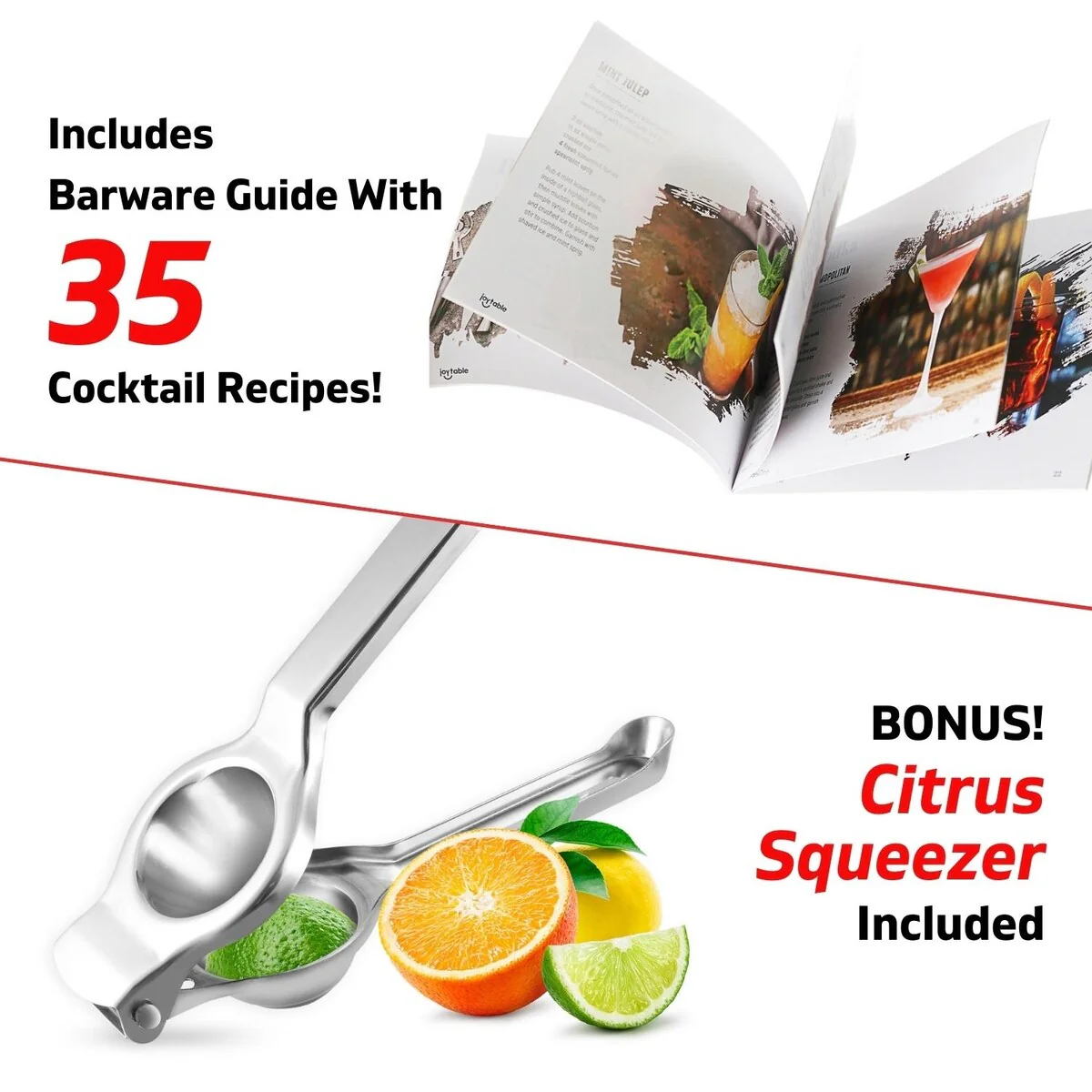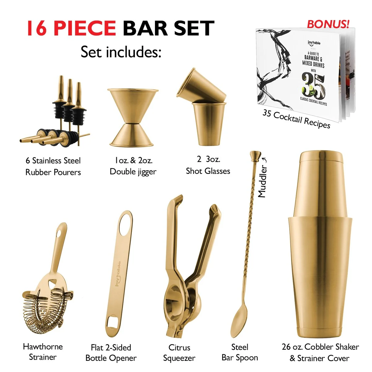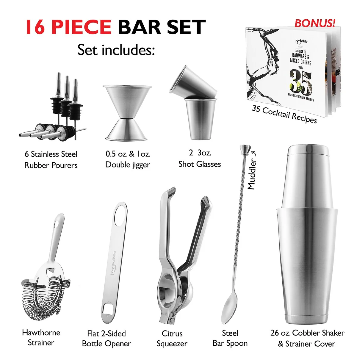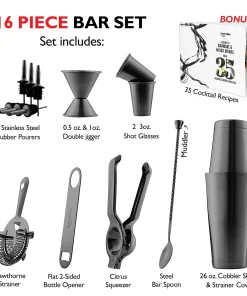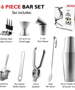 - 16 Piece Set: 6 Rubber Pourers, 2 Shot Glasses 3oz, Cobbler Shaker with Strainer Cover (26oz), Double Jigger (0.5oz & 1oz), Flat 2-Sidded Bottle Opener, Hand-Held Citrus Squeezer, Bar Spoon (also serves as a Muddler), Hawthorne Strainer, and Cocktail Recipe Book.