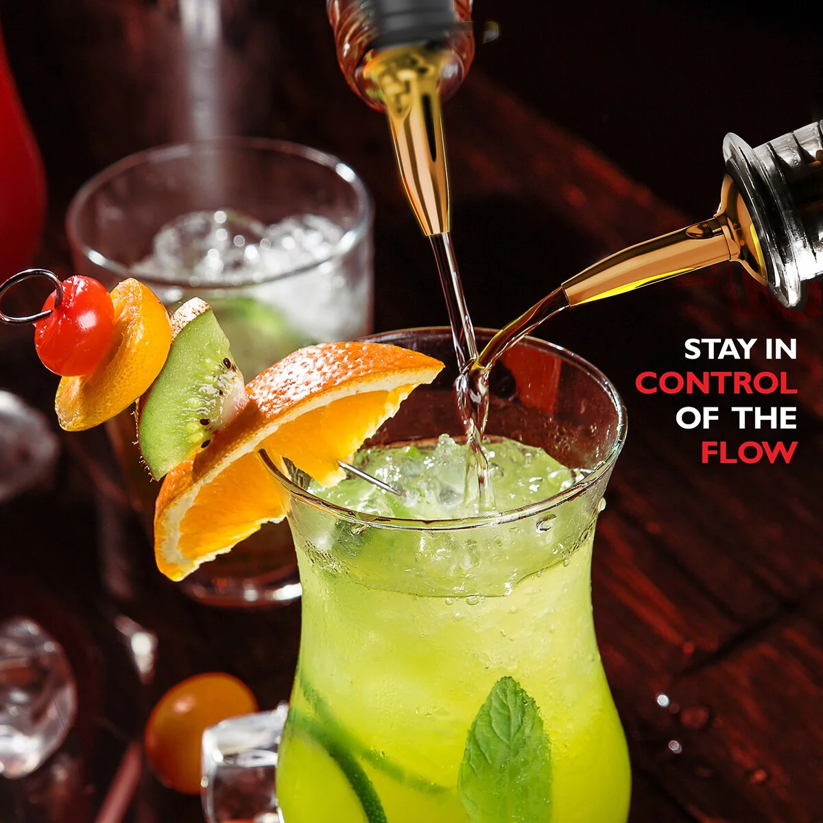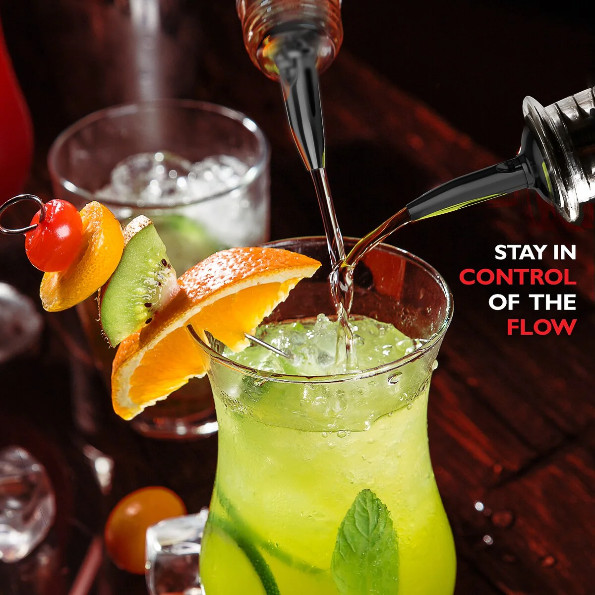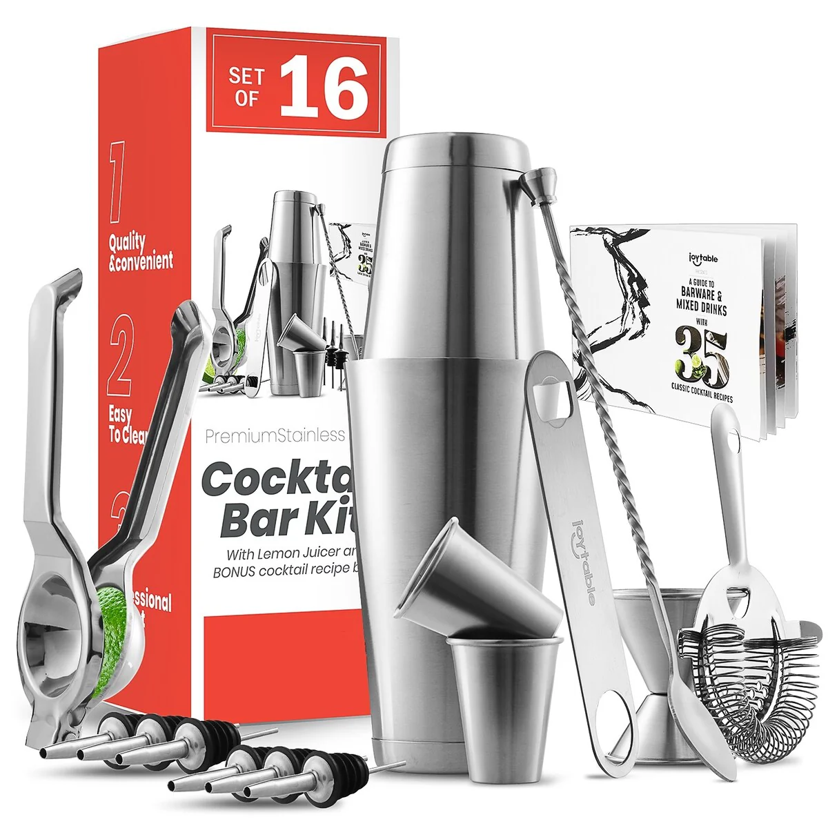- 16 Piece Set: 6 Rubber Pourers, 2 Shot Glasses 3oz, Cobbler Shaker with Strainer Cover (26oz), Double Jigger (0.5oz & 1oz), Flat 2-Sidded Bottle Opener, Hand-Held Citrus Squeezer, Bar Spoon (also serves as a Muddler), Hawthorne Strainer, and Cocktail Recipe Book.