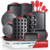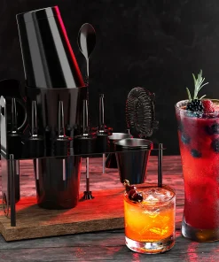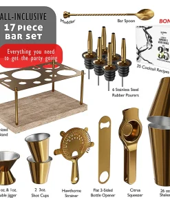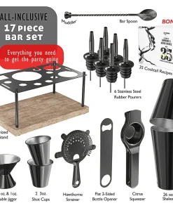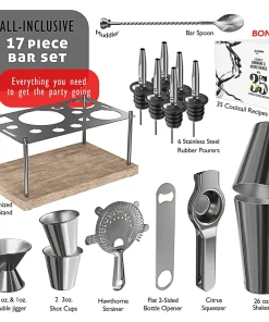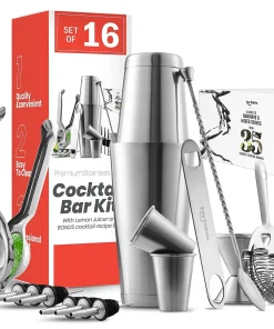 - 16 Piece Stand Set: 6 Rubber Pourers, 2 Shot Glasses 3oz, Cobbler Shaker with Strainer Cover (26oz), Double Jigger (0.5oz & 1oz), Flat 2-Sidded Bottle Opener, Hand-Held Citrus Squeezer, Bar Spoon (also serves as a Muddler), Hawthorne Strainer, Organized Stand and Cocktail Recipe Book.