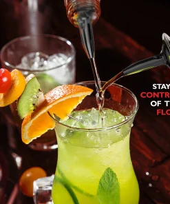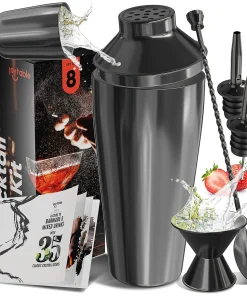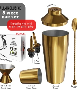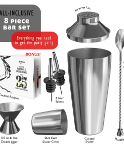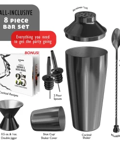 - 8 Piece Set: 2 Rubber Pourers, Cobbler Shaker with Strainer Cover (26oz), Double Jigger (0.5oz & 1oz), steel Bar Spoon (also serves as a Muddler), and Cocktail Recipe Book