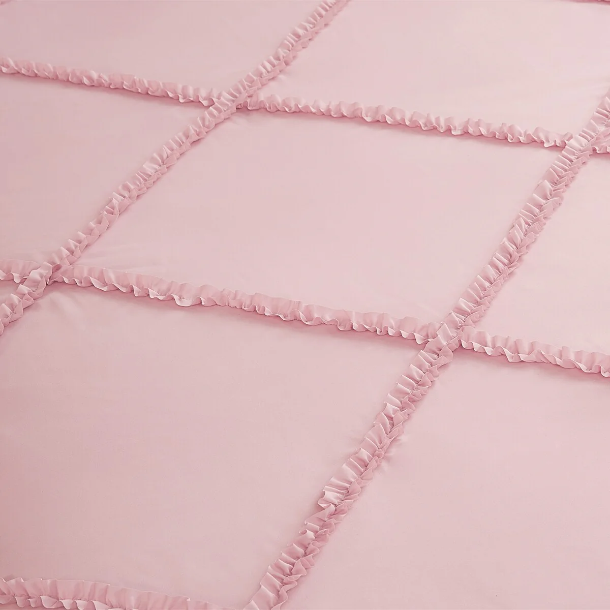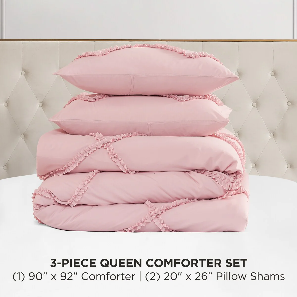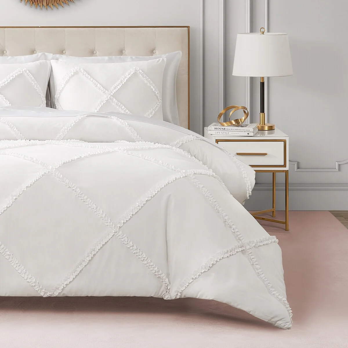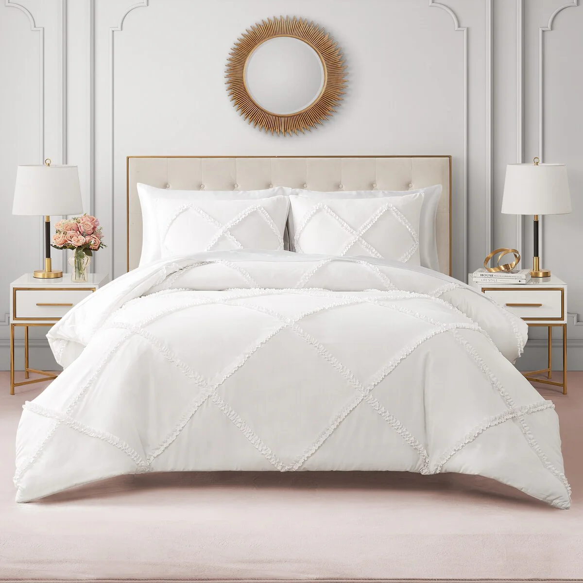- REVERSIBLE COMFORTER SET: The Juicy Couture Diamond Ruffle reversible comforter set features a ruffled diamond pattern. The reverse side features a sumptuously soft plush microfiber