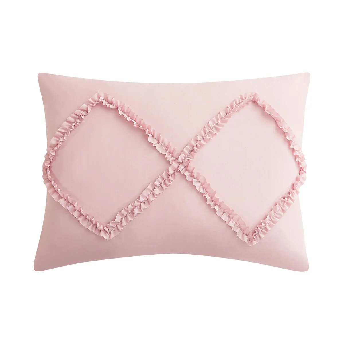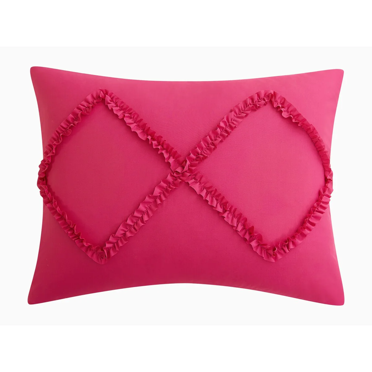 Make a statement with the Juicy Couture Diamond Ruffle reversible comforter set. Stylish ruffle detailing in a diamond pattern with a bold design. The reverse side features a sumptuously soft plush microfiber. Available in Twin, Queen, and King sizes. Machine wash cold, gentle, and separately. Do not bleach. Tumble dry low. If there is no free movement in the washer or dryer, use a large-capacity commercial machine. Remove promptly. Do not iron. Face and reverse: 100% microfiber polyester. 100% polyester fill. Imported.