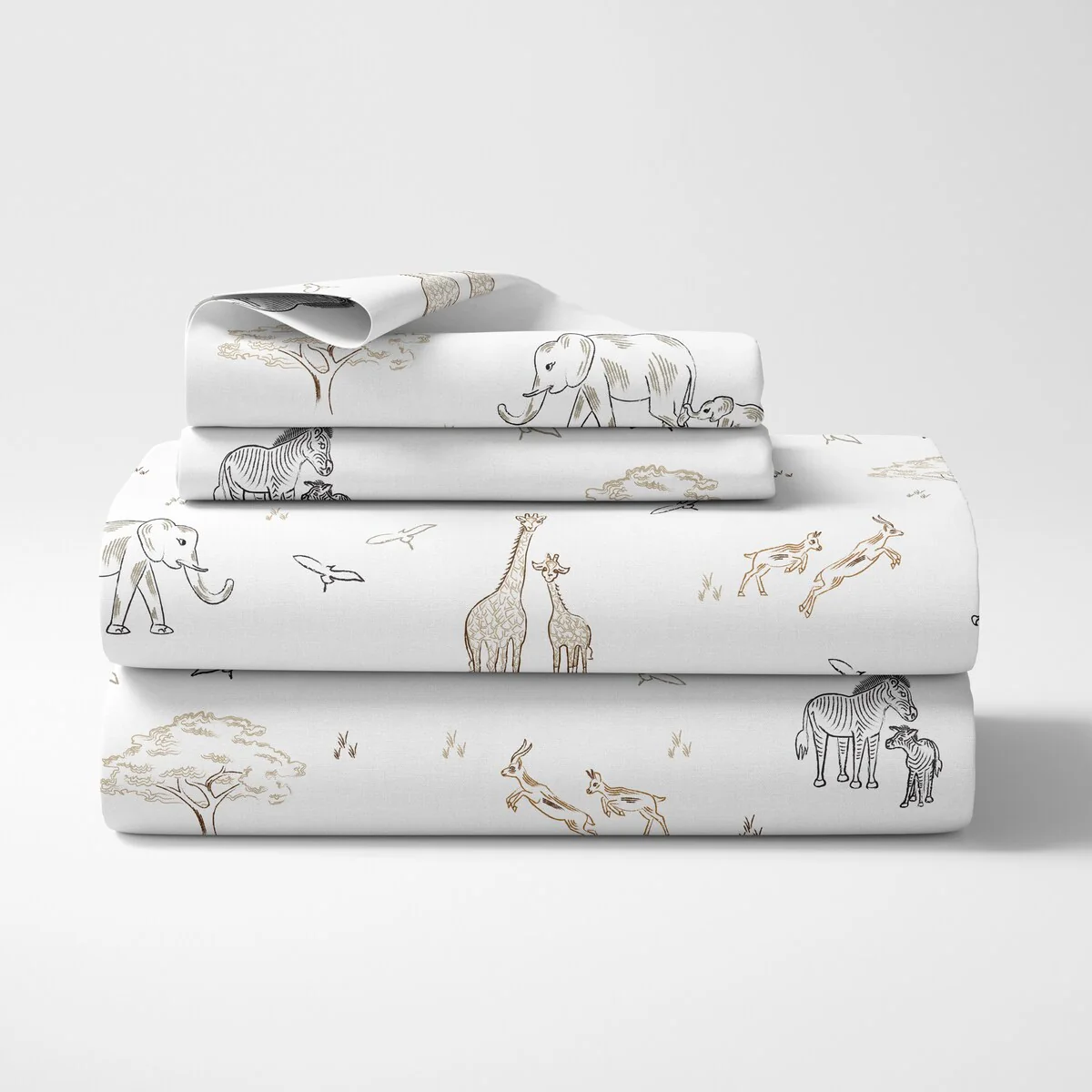 Jungle Safari Animals Queen Sheet Set Taupe Black and White Gender Neutral Elephant Giraffe Wildlife Adventure Zebra Serengeti