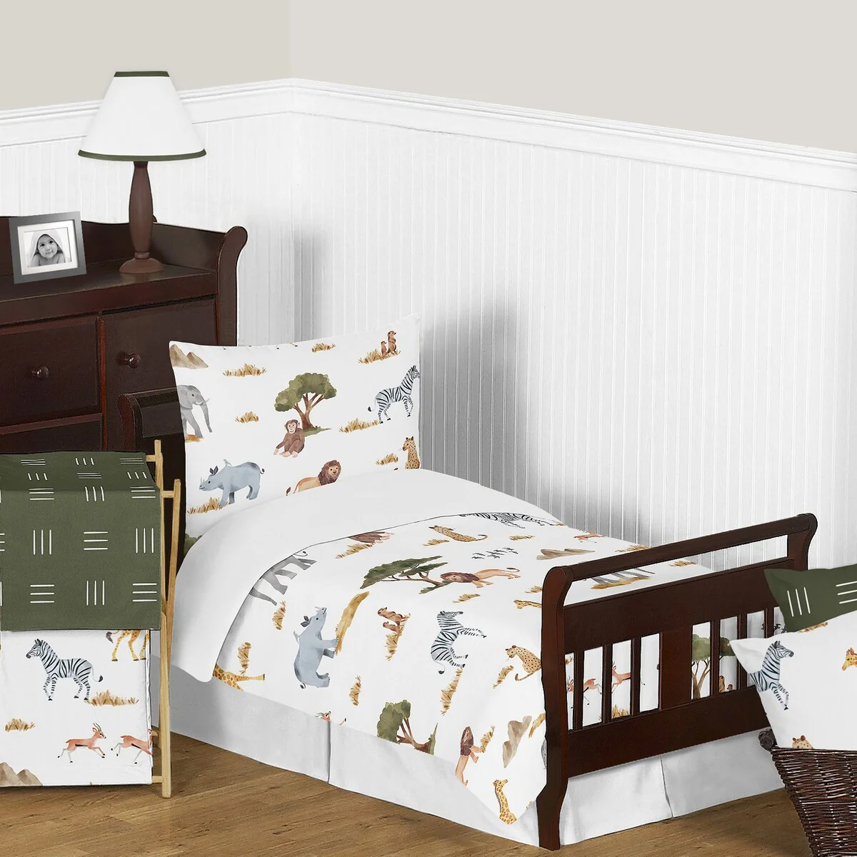 Serengeti 4 Piece Queen Sheet Set will help complete the look of your Sweet Jojo Designs room. This multicolor jungle safari animals print brushed microfiber fabric sheet set fits all standard queen size mattresses and is machine washable for easy care. Queen Sheet Set Includes: Fitted Sheet, Flat Sheet and 2 Pillow Cases.