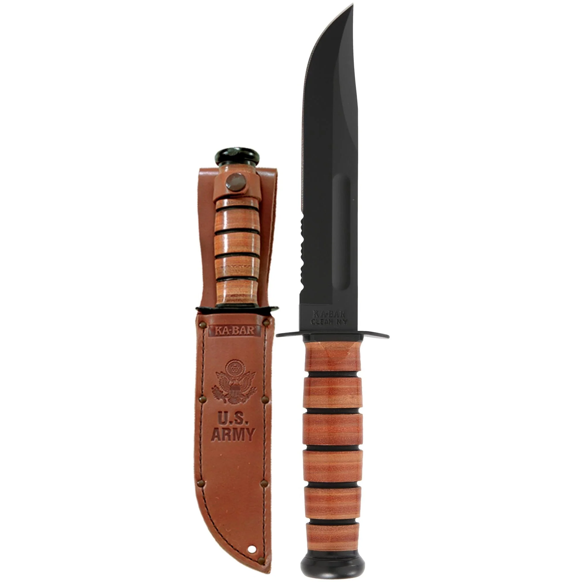 This traditional KA-BAR Utility Knife is marked for Army personnel and features a partially serrated edge to aid in cutting synthetic and looped materials. Tang stamped US ARMY. A leather sheath is included. Knife manufactured in the USA, sheath is manufactured in Mexico.