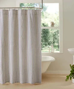 Give your bath a classic touch of vintage simplicity and charm with our Kaila Ticking Stripe Shower Curtain 72×72. Beautifully decorated with classic ticking stripes in navy and creme, this cotton curtain is perfect for your vintage farmhouse bath. Easily hang this country cottage bath curtain with shower hooks of your choosing (not included) using the button holes attached. A 3" rod pocket is also available as an alternative hanging method.