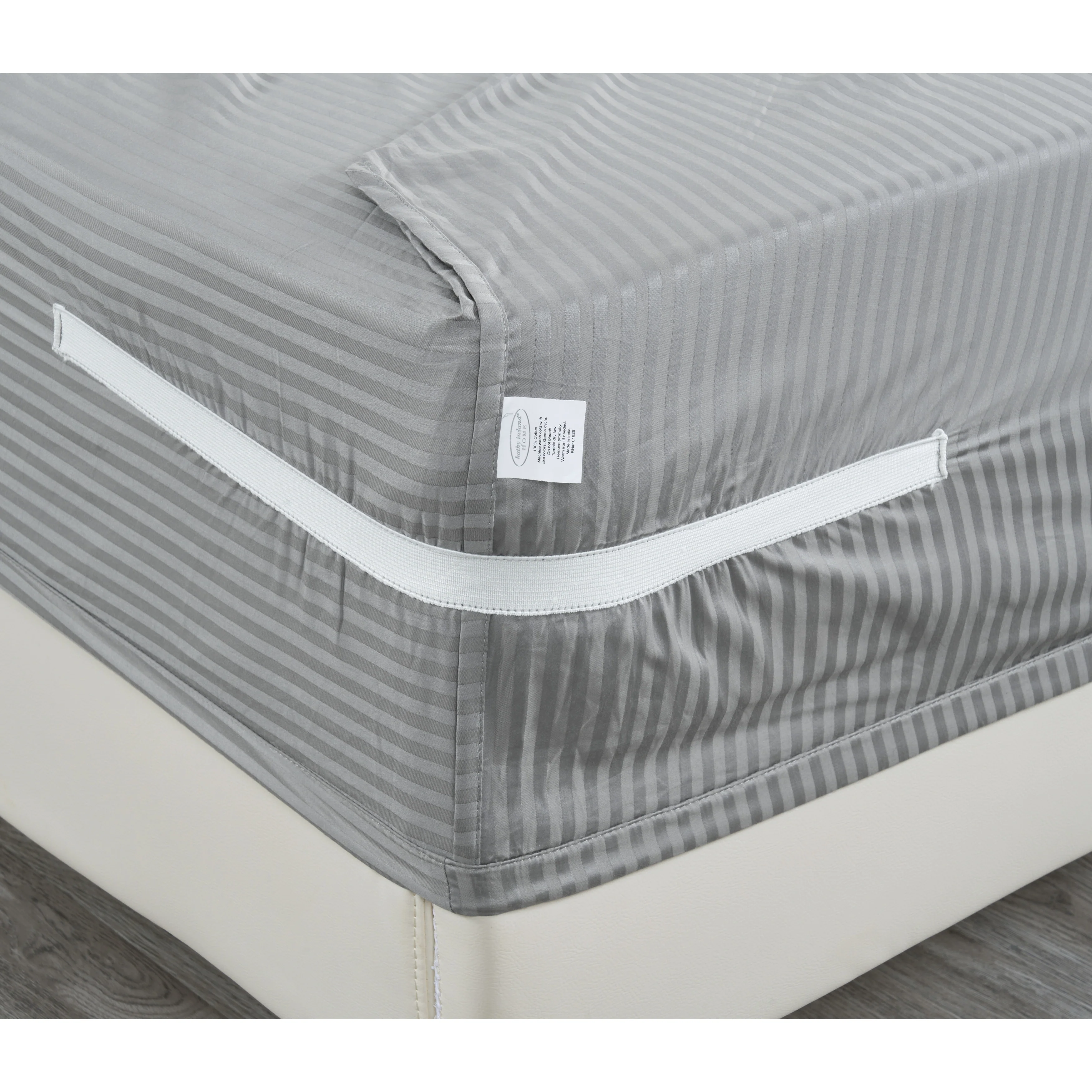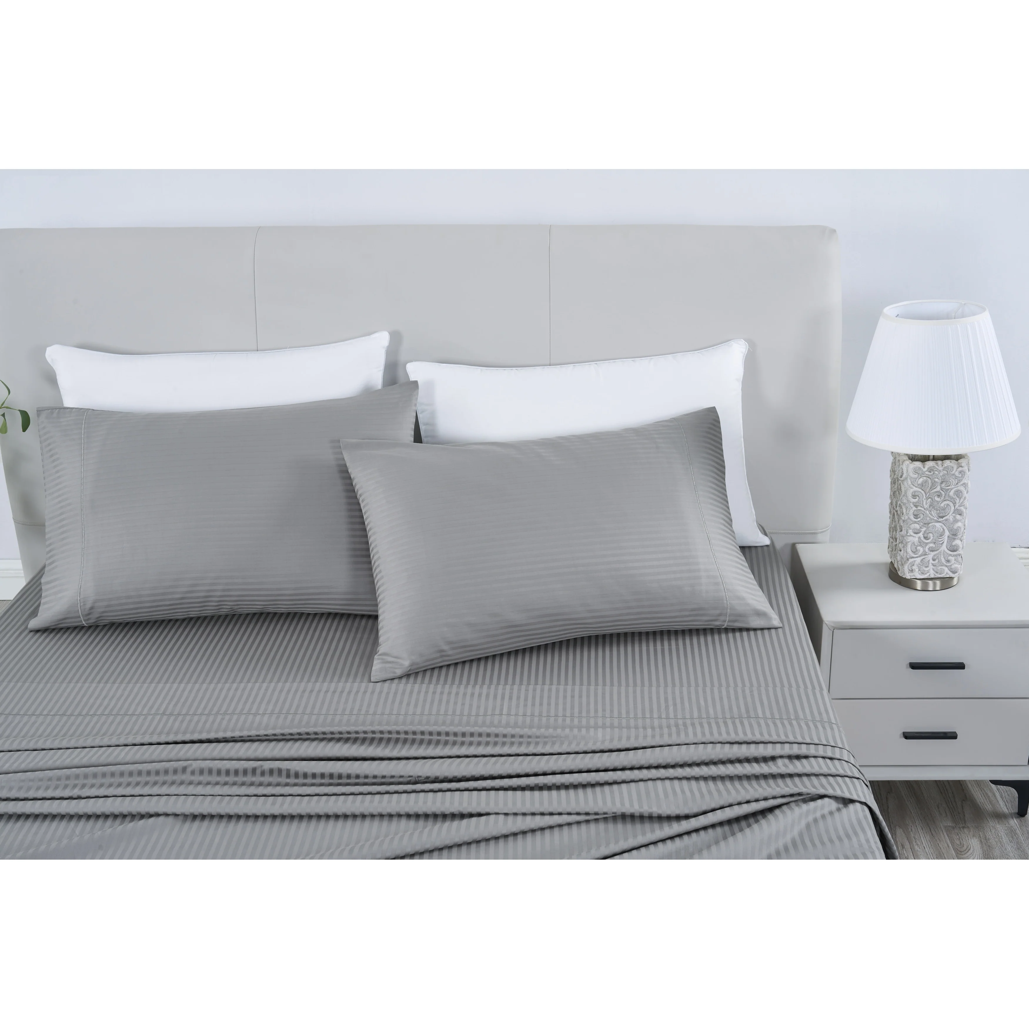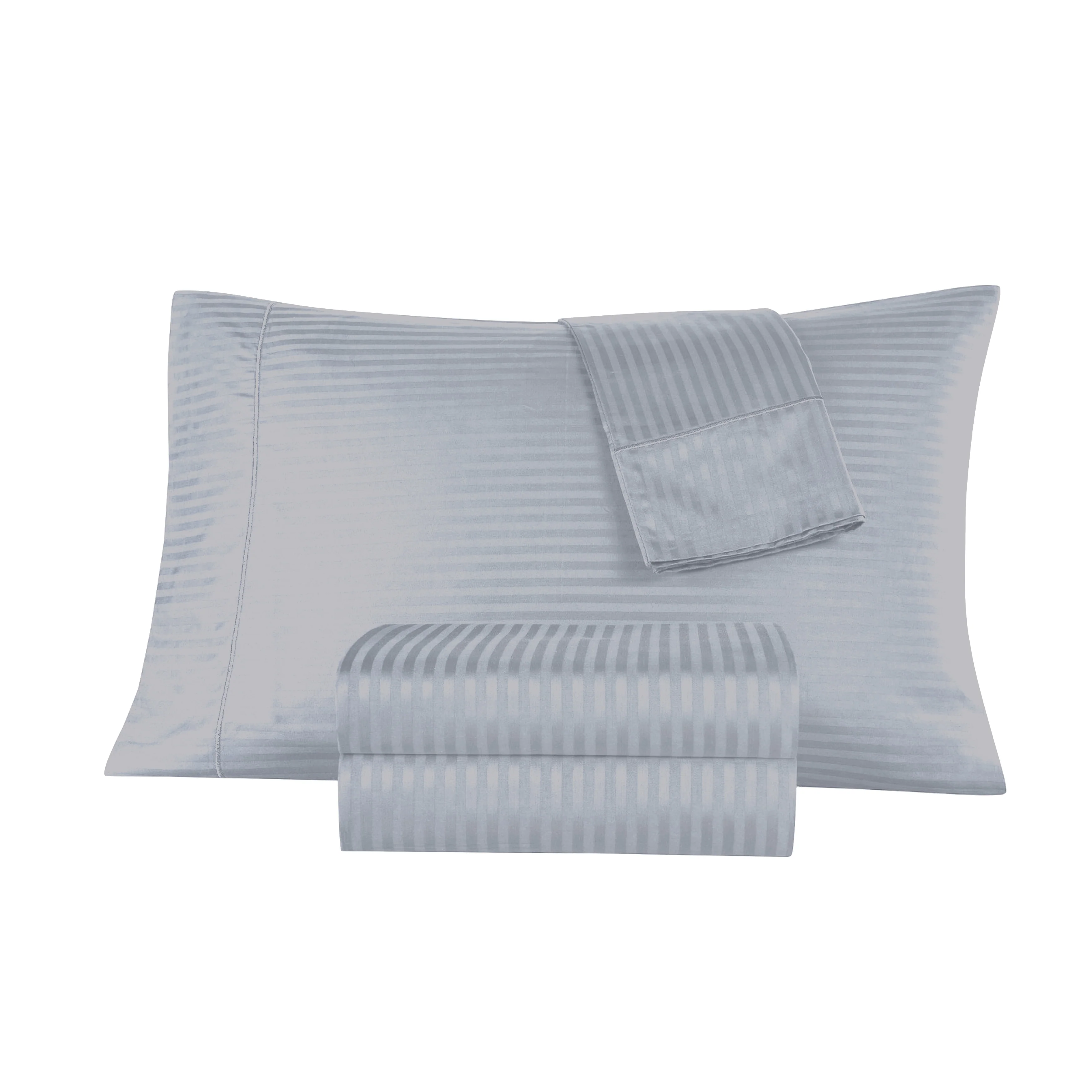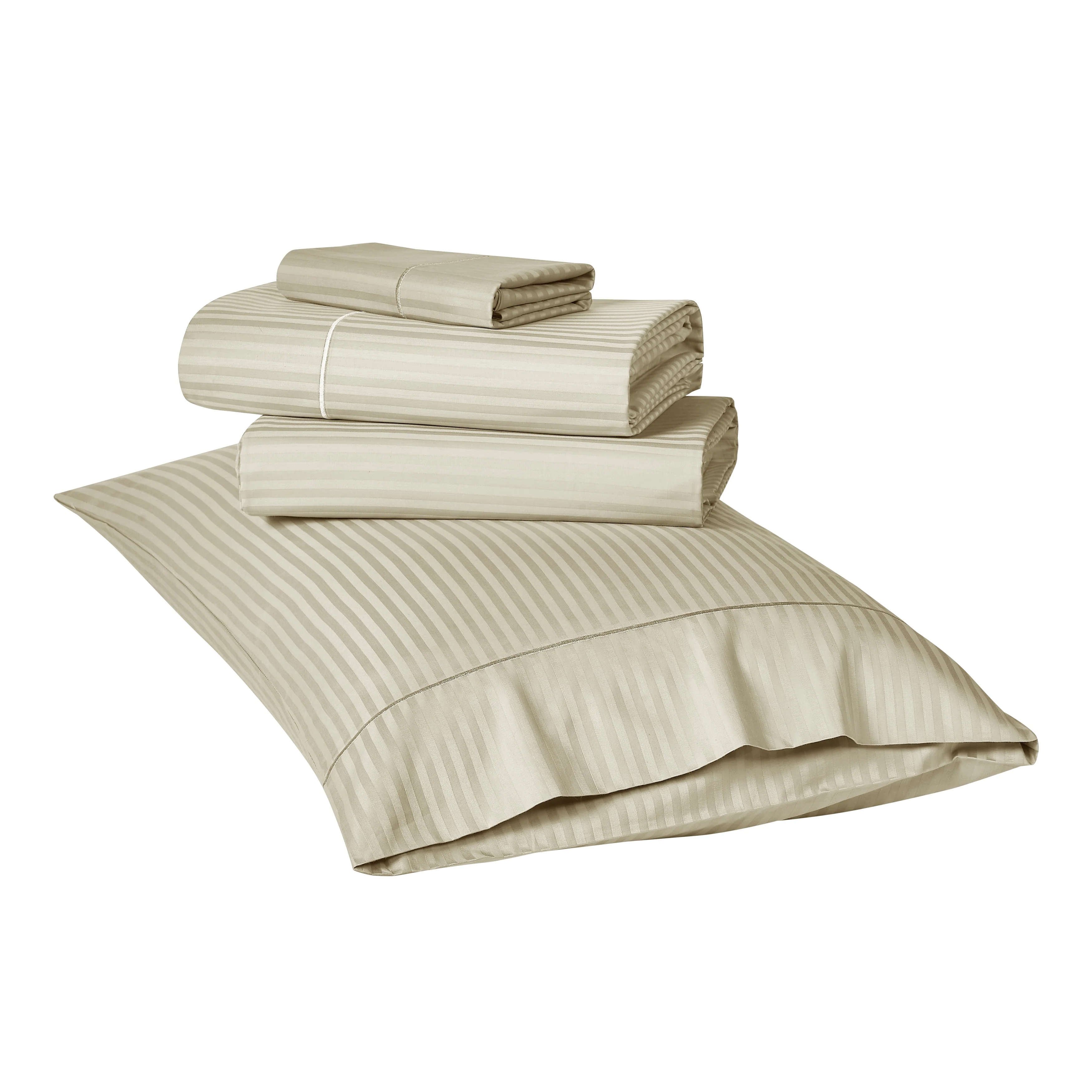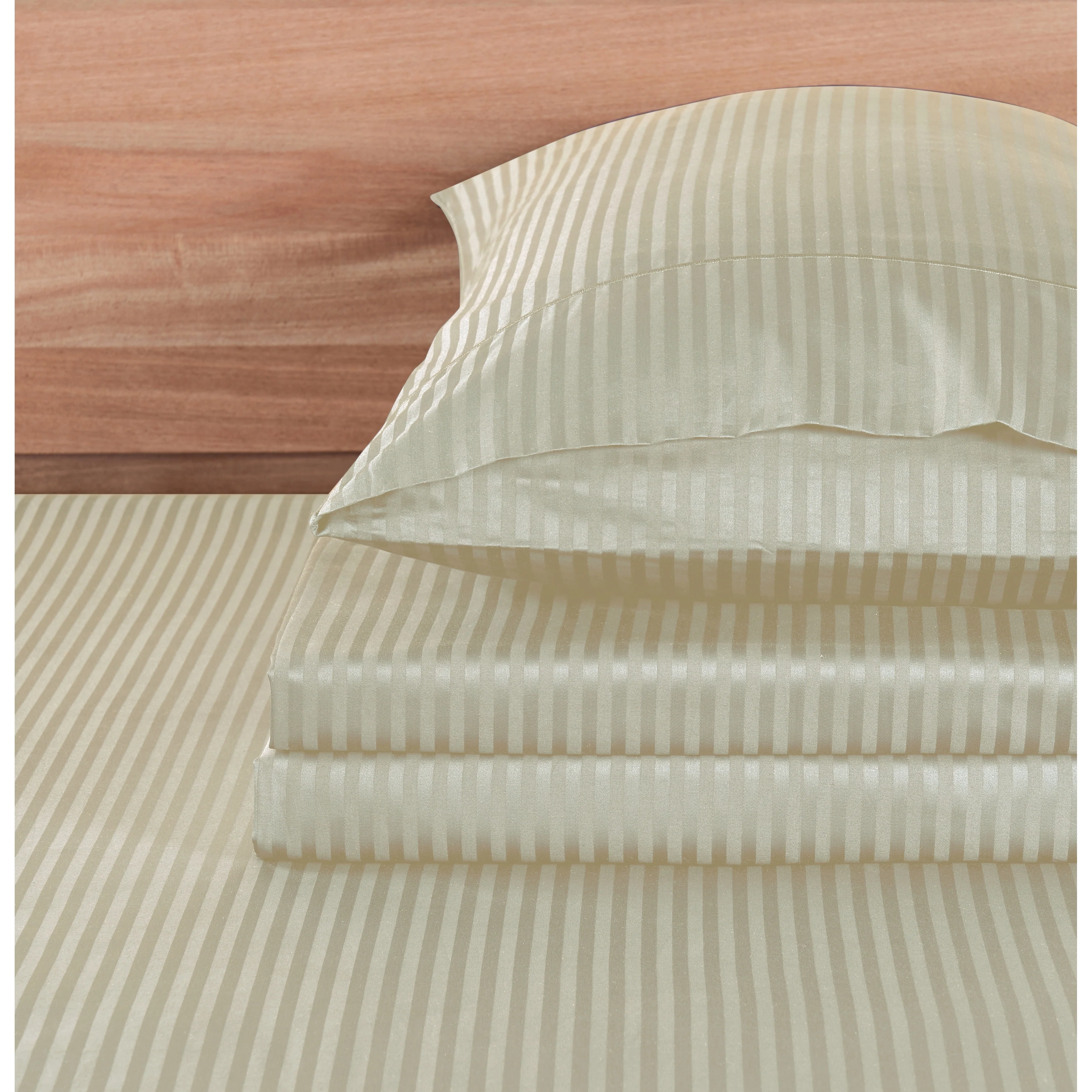 Class and sophistication define this Kathy Ireland 500 Thread Count stripe sheet set. Using only the finest in long staple cotton, the woven delicate stripes into each set that not only add textural depth but also create a beautiful designer accent look. The sateen style weave allows for a radiant sheen while the subtle breakthroughs stitching on the flat sheet and pillowcases add just the right amount of stylish detail to each piece. The OptiFit fitted sheets include our exceptional one-inch thick elastic edging to ensure tight fitting of most mattress sizes and also offer a generous 16 inch pocket depth.