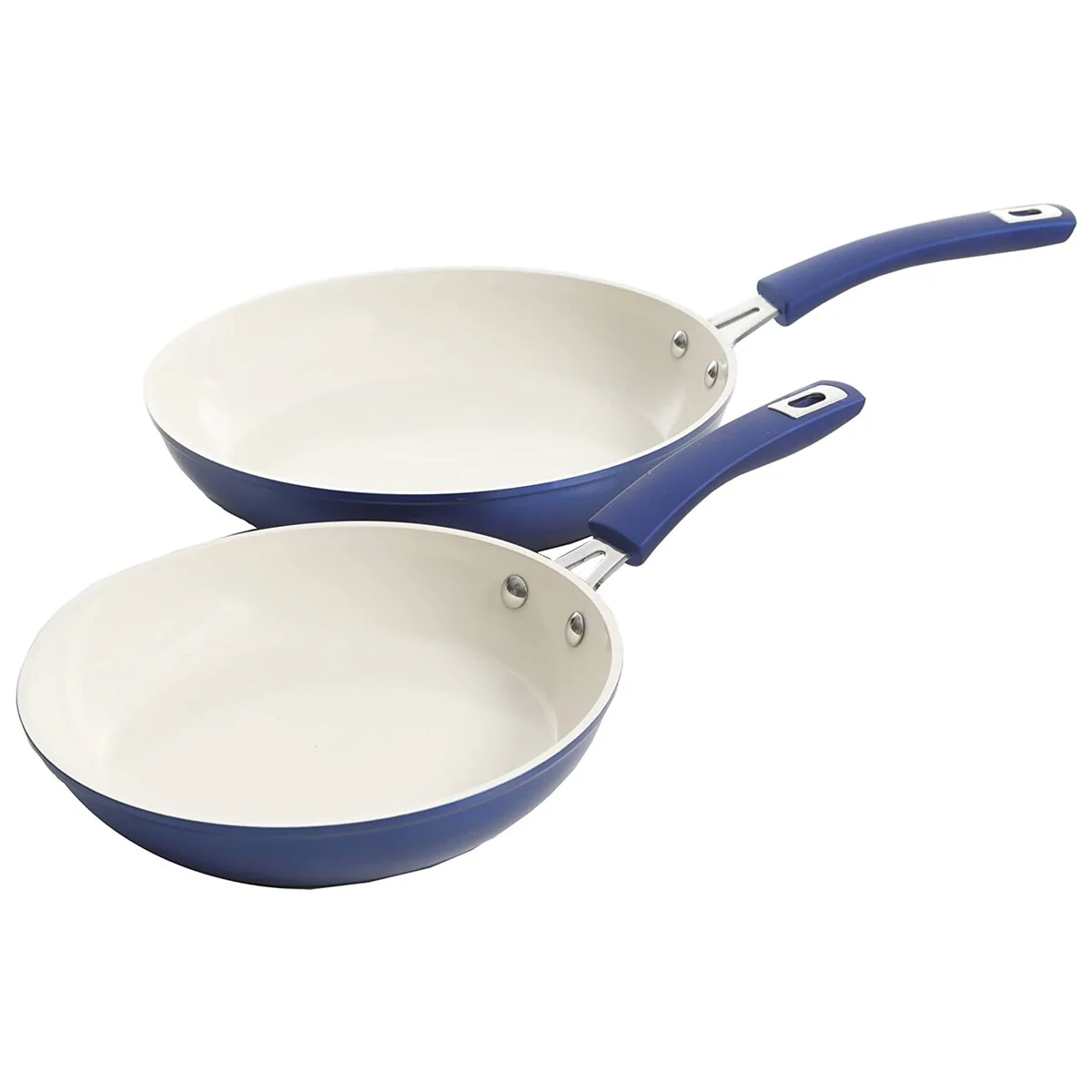 Step up your cooking game with the high quality Kenmore Arlington 2 Piece Aluminum Ceramic Coated Nonstick Frying Pan Set in Metallic Blue. This pair masterfully allows you to cook with effective precision. The heavy gauge aluminum body is built to handle gas, electric, halogen, and induction heat. Cut down on fats and oils with the nonstick ceramic coating; allowing for much healthier dishes. Create outstanding lemon seared chicken, penne pasta, cheese omelet and many other dishes for guests to enjoy.