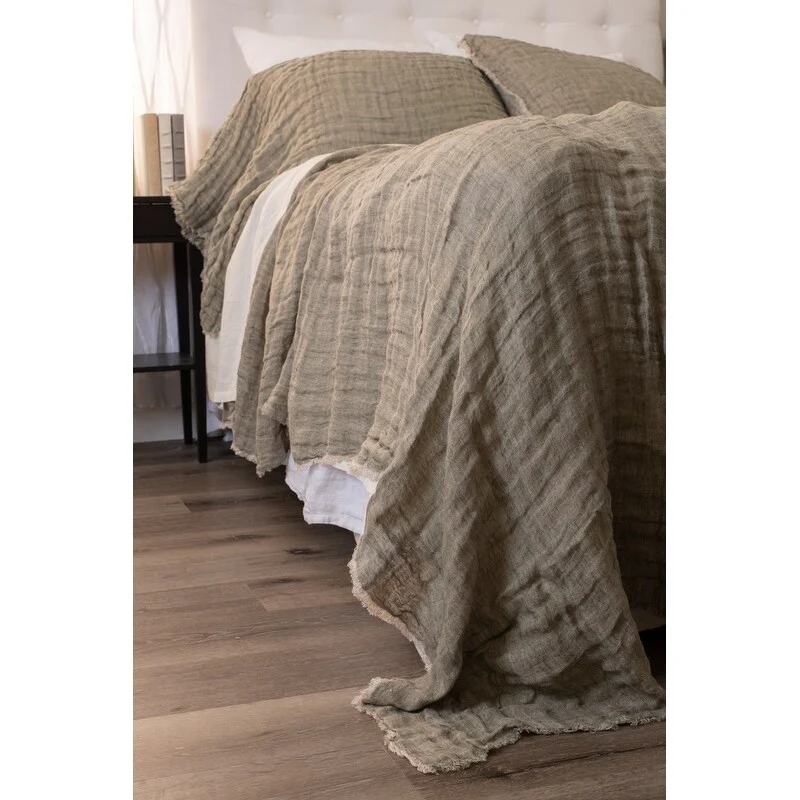 Inspired by the more relaxed European lifestyle, Kent brings home the casual elegance the continent is known for. Oversize linen gauze double cloth, that is designed with a European causal sensibility so that it completely covers the bed, nearly skirting the floor (depending on mattress height) and extra-long shams (one sided open like a pillowcase) is a textbook European style- Classy yet Casual. Taking note of the new colors of the year, we have taken a softer more subtle approach with this introduction in 11 colors. The eyelash edge bedspread reverses to natural linen on the back side, so that Kent offers the newness of Asphalt grounded with the always appropriate Natural Linen on the reverse. Available in: Asphalt, French Blue, Indigo, Lavender, Kale, Ochre, Peacock, Pomegranate, Saddle, Tangerine, and White. All reverse to Natural. The shams are designed as a pillowcase style with an exaggerated drape. All colors reverse to natural linen and are finished with a hand frayed eyelash edge. Sizes: Twin 80×110 InchesFull/Queen 102×118 InchesKing 120×105 InchesStandard Sham 21×40 InchesKing Sham 21×50 InchesEuro Sham 26×26 Inches100% Linen