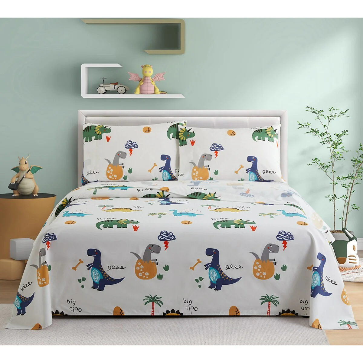 Kids Boys Printed 600 Thread Count Deep Pocket Cotton Blend Percale All Season Bedding Sheet Set, Cartoon Dinosaur Zoo Dino