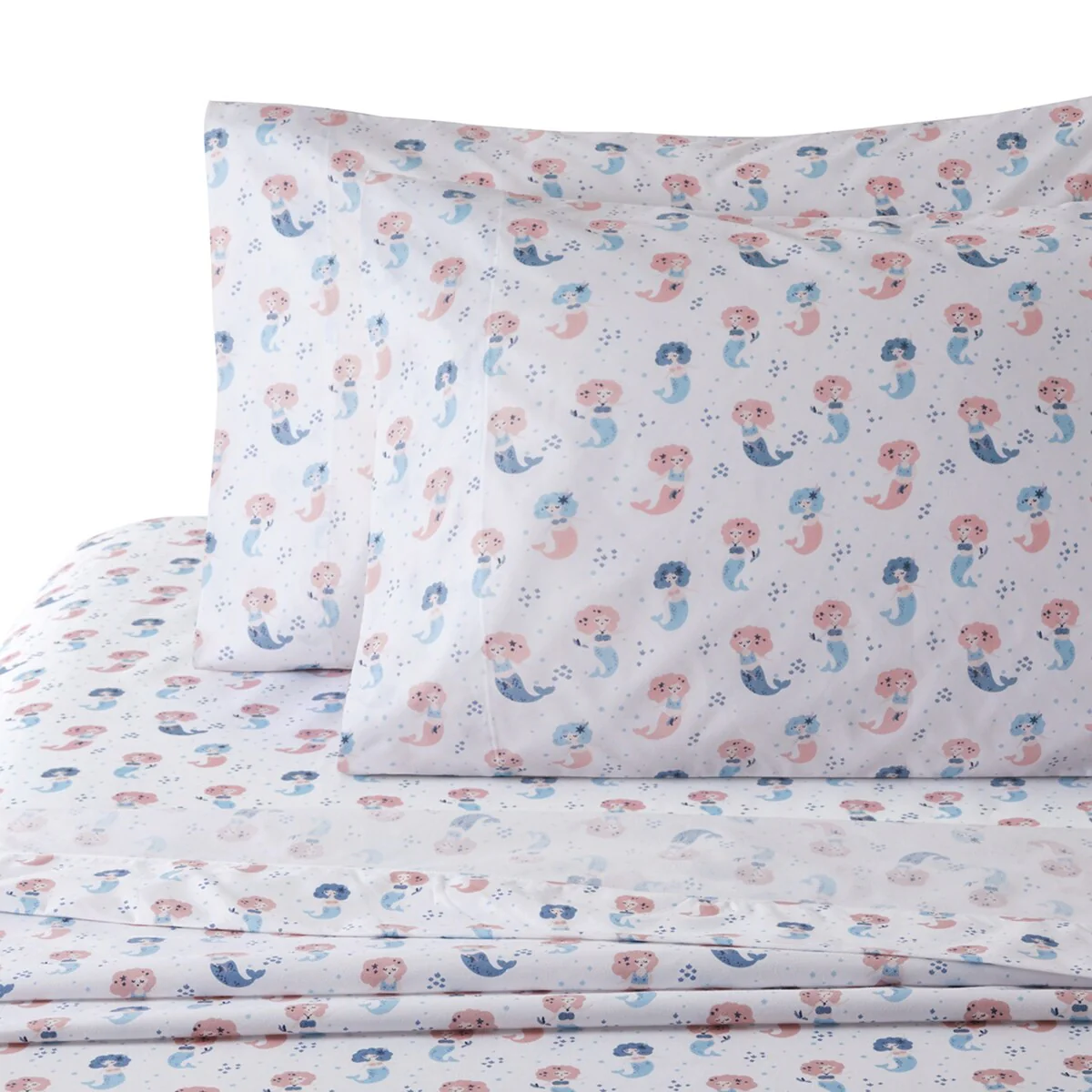 Kids Girls Printed 600 Thread Count Cotton Blend Percale Duvet Cover Fitted Sheet Ensemble Bedding Set, Cartoon Mermaid