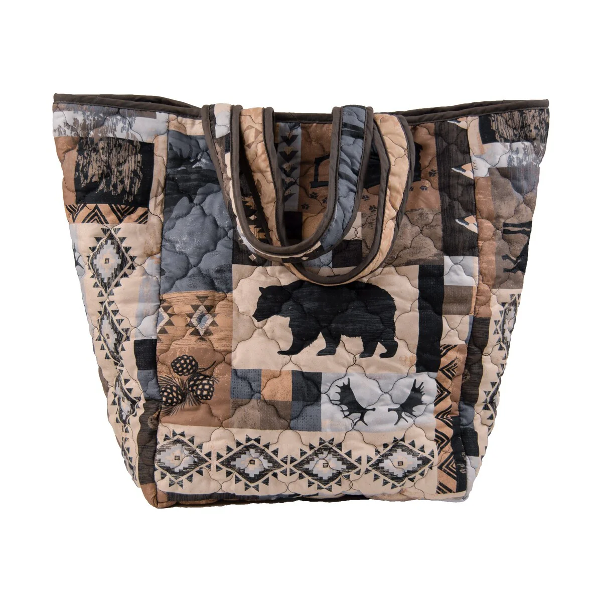 Kila lightweight quilt set from Your Lifestyle by Donna Sharp is a rustic bedding ensemble featuring a hopscotch geometric pattern with various forest-related elements arranged throughout. Deer, moose, bear, duck, log cabin and pine motifs are accented by geometric symbols. Colors include blue-grey, parchment, charcoal, chocolate, tobacco, sand and dusty blue. Each set includes a light weight quilt and 2 shams   (Twin has 1 sham) and comes packaged inside a FREE matching tote bag! (Sham image may vary.) Reversible and perfect for any bedroom in the home. Décor pillows and throw sold separately. 100% Polyester, machine washable.