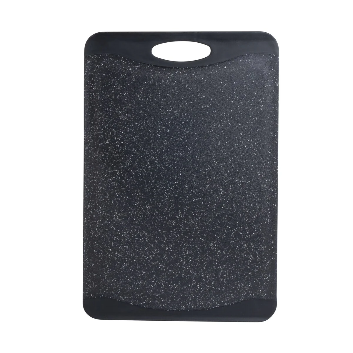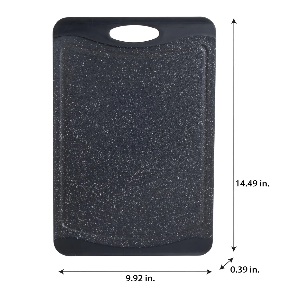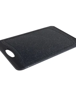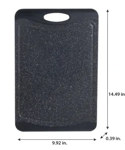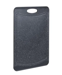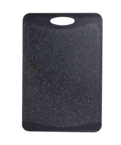 Prep your meals with the Kitchen Details granite look cutting board. With its double side you can prep an entire meal without cross contamination. The grip handles make it easy to transport. The drip edges collect any excess run off keeping your meal prep and kitchen neat and clean. The smooth granite look also makes for a nice looking serving tray.