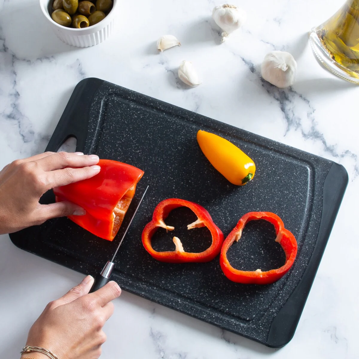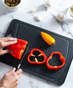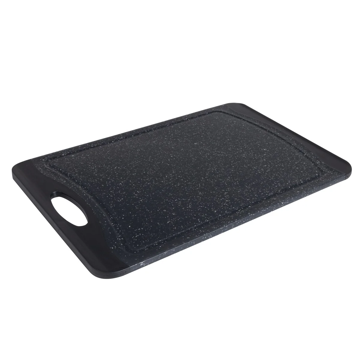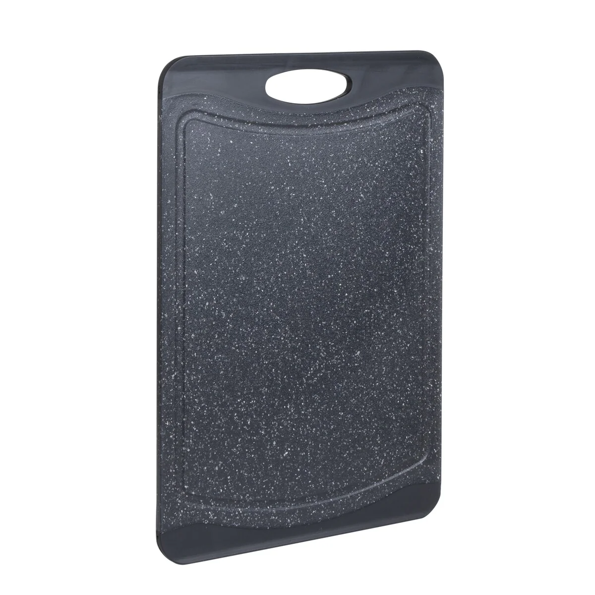 Prep your meals with the Kitchen Details granite look cutting board. With its double side you can prep an entire meal without cross contamination. The grip handles make it easy to transport. The drip edges collect any excess run off keeping your meal prep and kitchen neat and clean. The smooth granite look also makes for a nice looking serving tray.