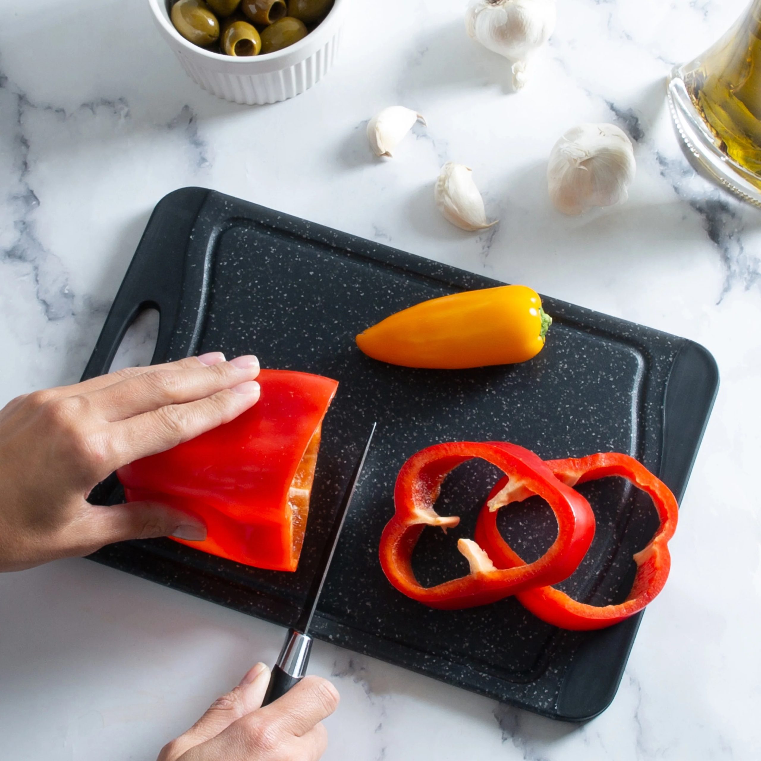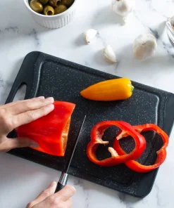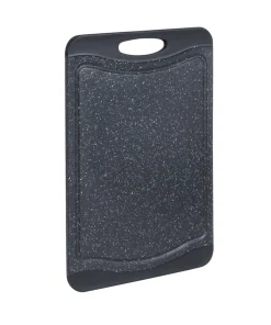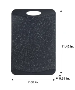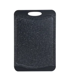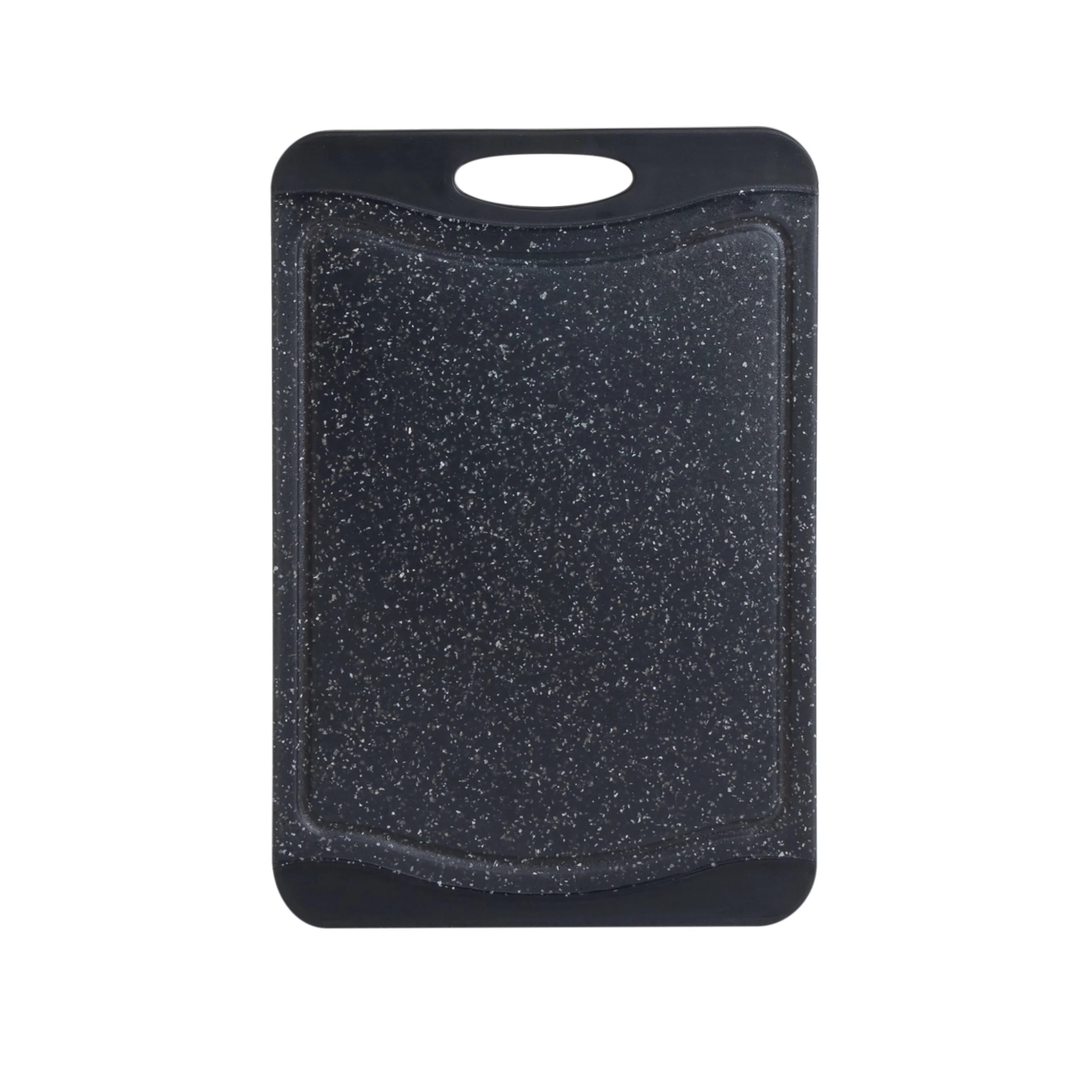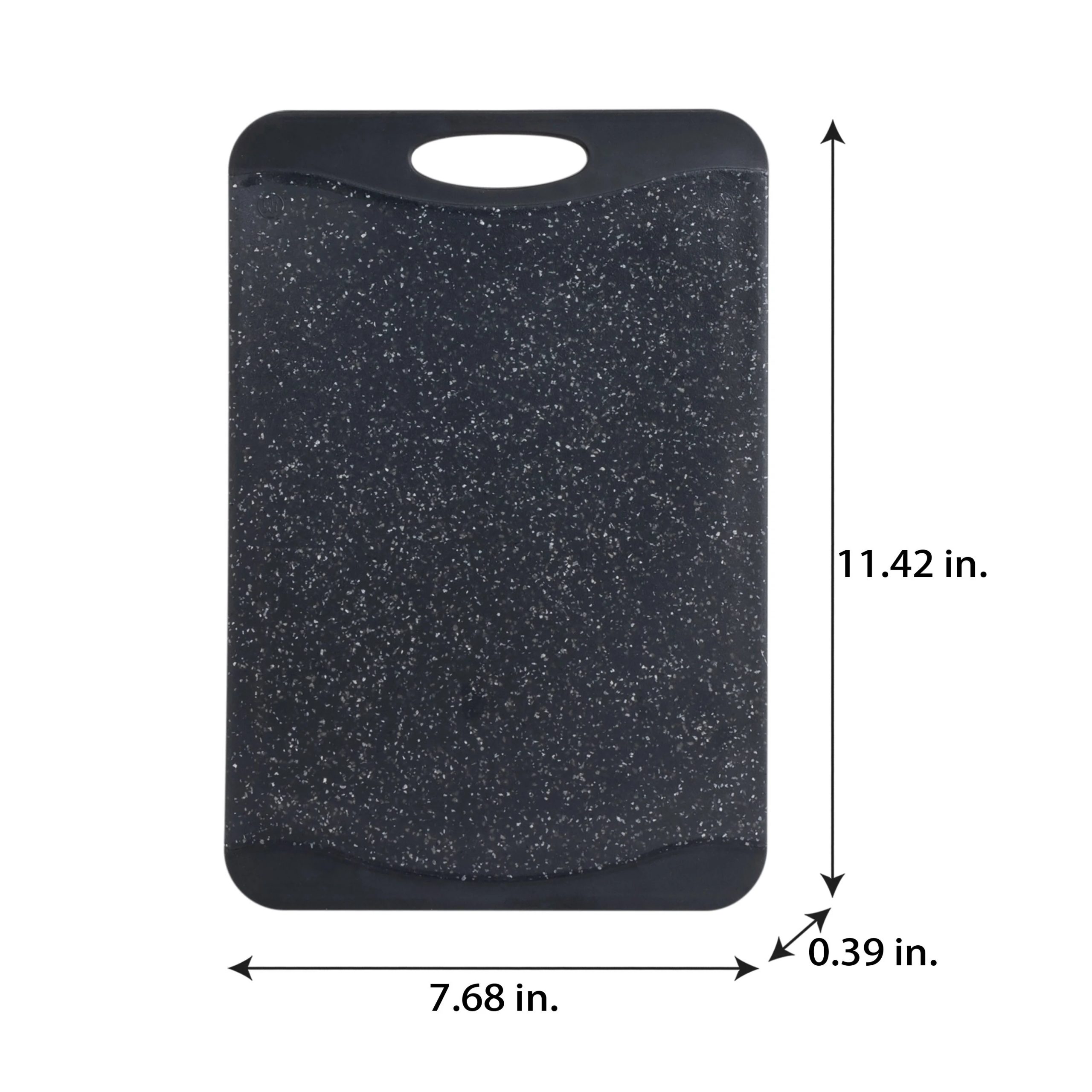 Prep your meals with the Kitchen Details granite look cutting board. With its double side you can prep an entire meal without cross contamination. The grip handles make it easy to transport. The drip edges collect any excess run off keeping your meal prep and kitchen neat and clean. The smooth granite look also makes for a nice looking serving tray.