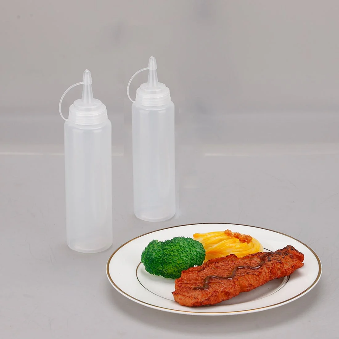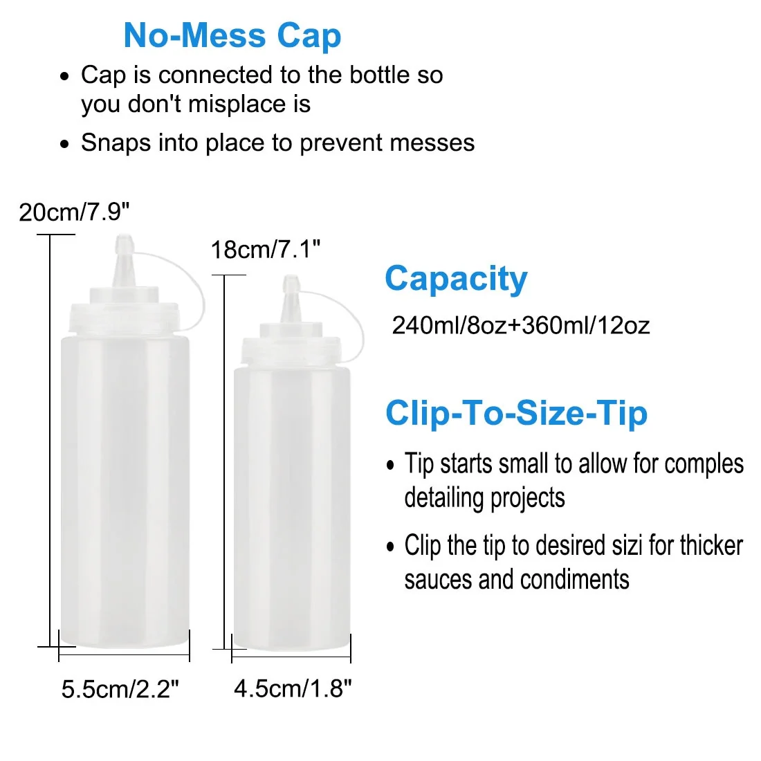 2. It has a cap on the top of the bottle mouth, you do not need to worry falling, will not dirt your table and kitchen. The wide mouth design makes it looks good and easy to make the liquid be the creative shape you want.