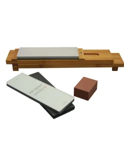 Japanese water stones are an efficient and effective tool for keeping your knives sharp. Using just a few drops of water (no soaking necessary), your knives will be sharp in a matter of minutes – no oil necessary. This Kramer by ZWILLING set features a coarse 400-grit glass stone for dull knives or for reshaping blades, a finer 1,000-grit glass stone for honing, and a 5000-grit glass stone for finishing touches. The bamboo sharpening stone sink bridge holds the stones when in use. Also included in this set is the easy-to-follow Sharpening Instructional DVD by master bladesmith Bob Kramer.