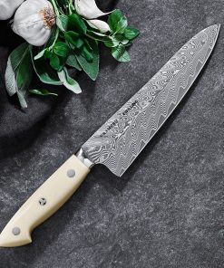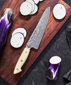 Made in Japan, these exceptionally durable knives are made with an SG2 super-steel core and are hand-finished using a traditional three step process. The cryogenic ice-hardened, 11° angle blade offers scalpel-like sharpness and will stay sharper, longer. Featuring an exquisite 101-layer, deep-etched chevron Damascus pattern, these revolutionary knives are true works of art.