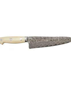 Made in Japan, these exceptionally durable knives are made with an SG2 super-steel core and are hand-finished using a traditional three step process. The cryogenic ice-hardened, 11° angle blade offers scalpel-like sharpness and will stay sharper, longer. Featuring an exquisite 101-layer, deep-etched chevron Damascus pattern, these revolutionary knives are true works of art.