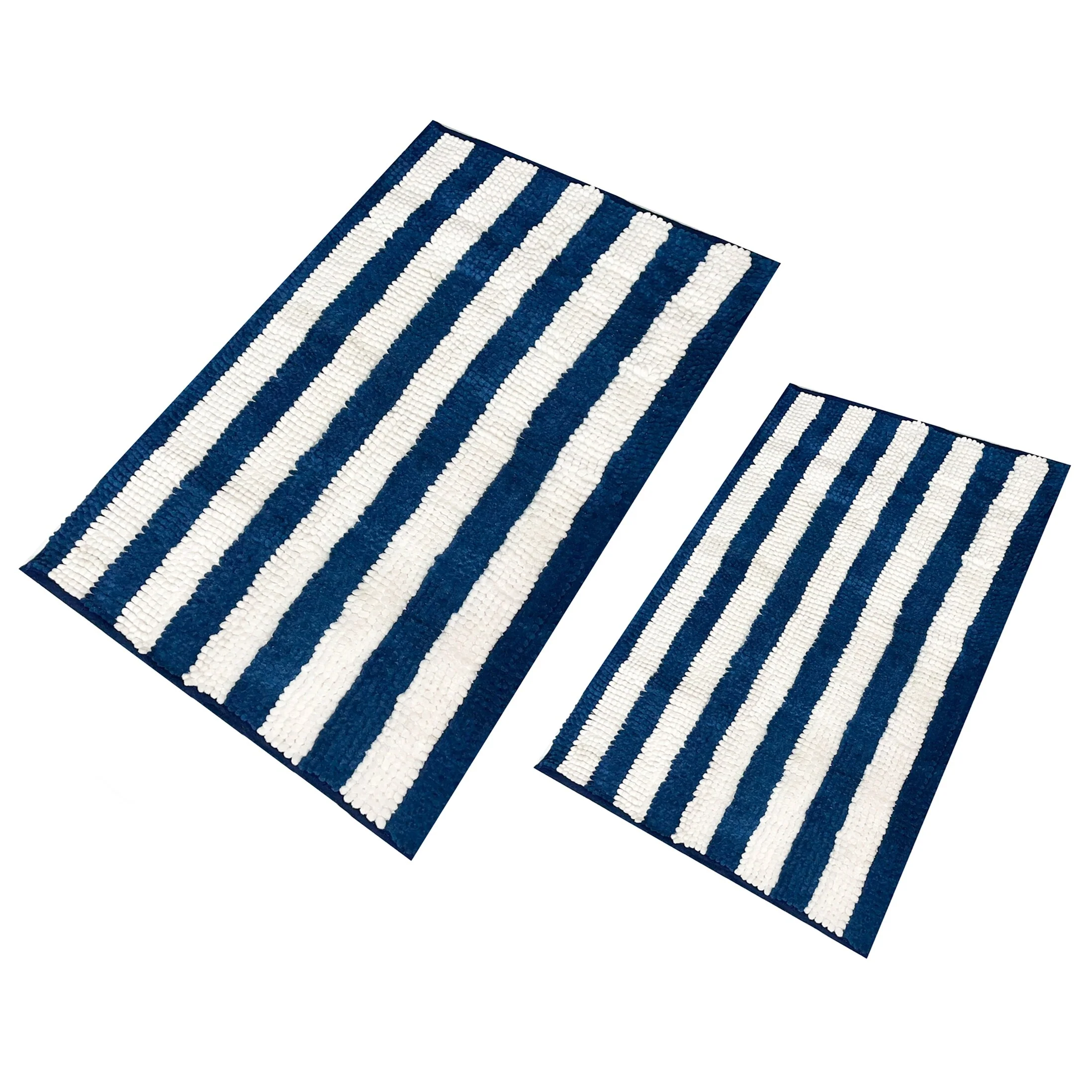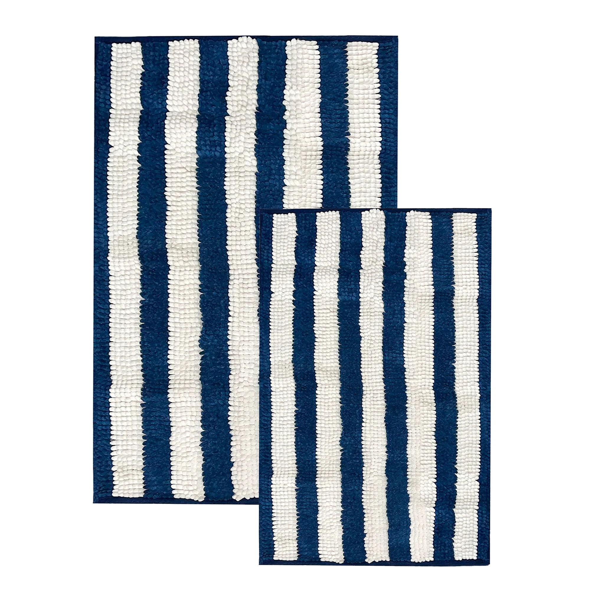 Large 2 Piece Set Blue White Stripe Soft Cozy Plush Chenille Bath Mat Bathroom Rug