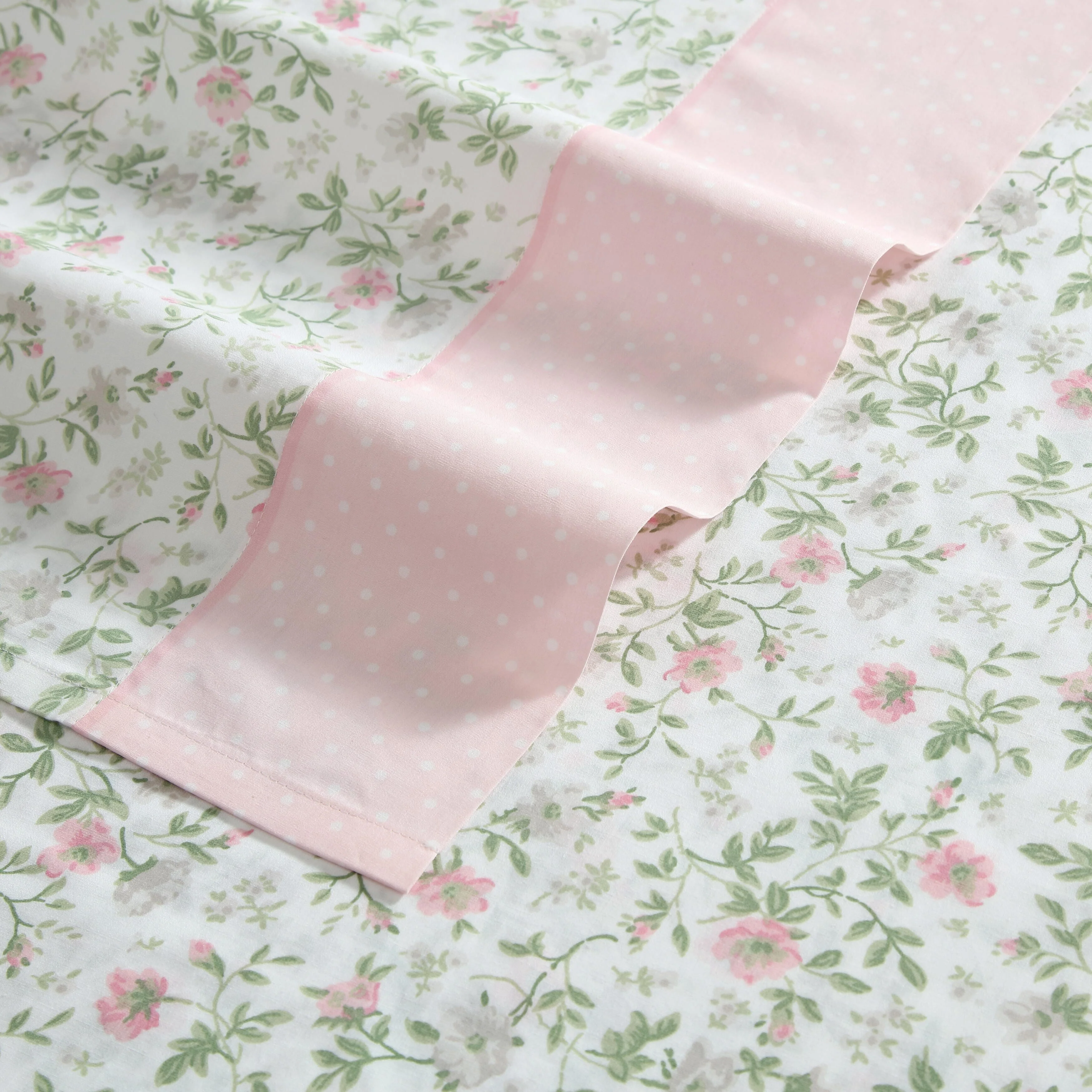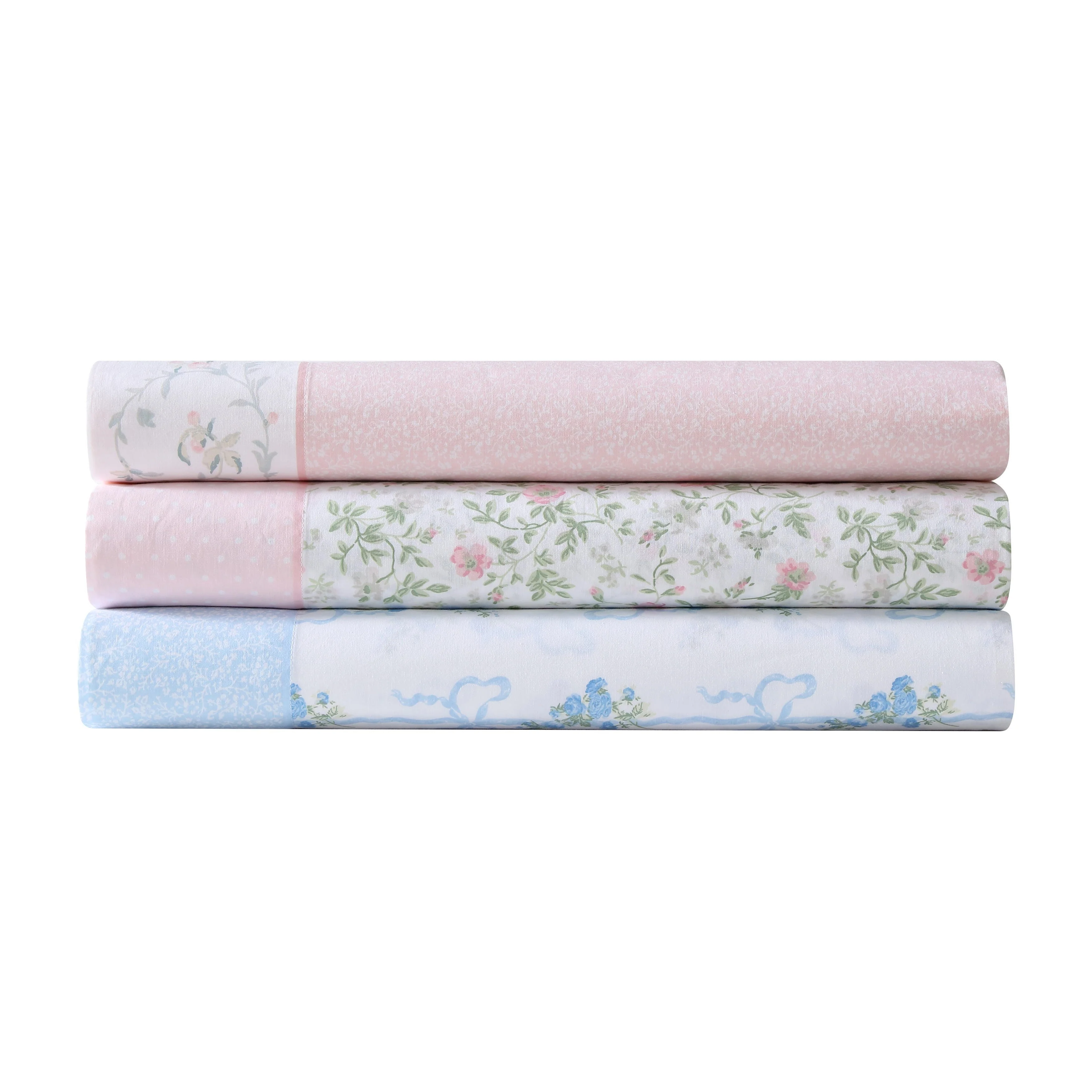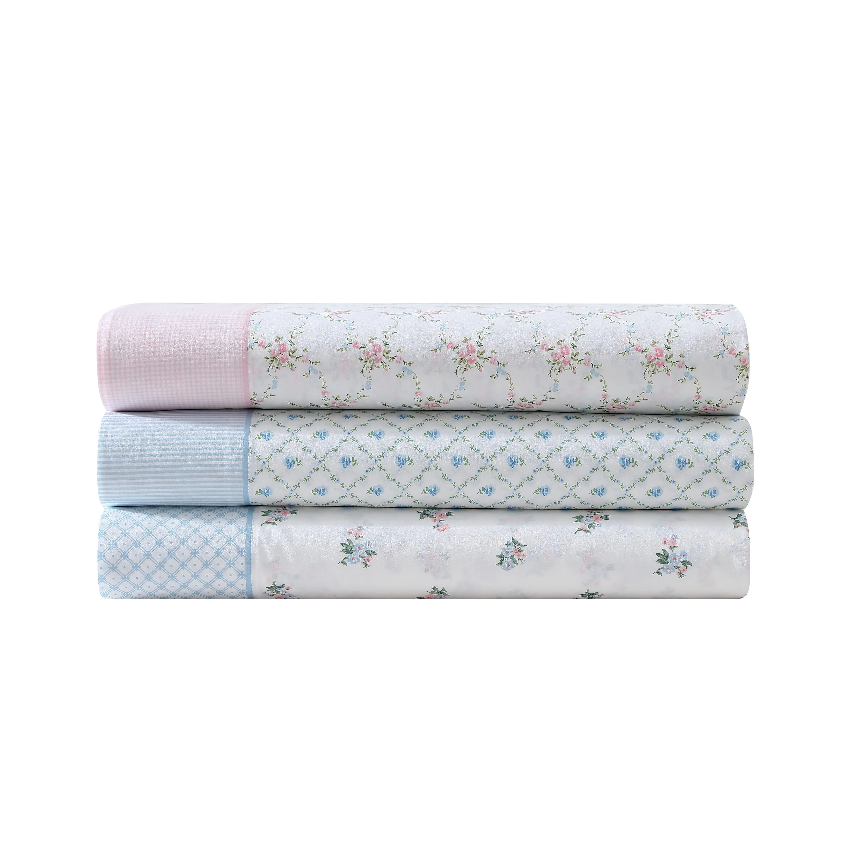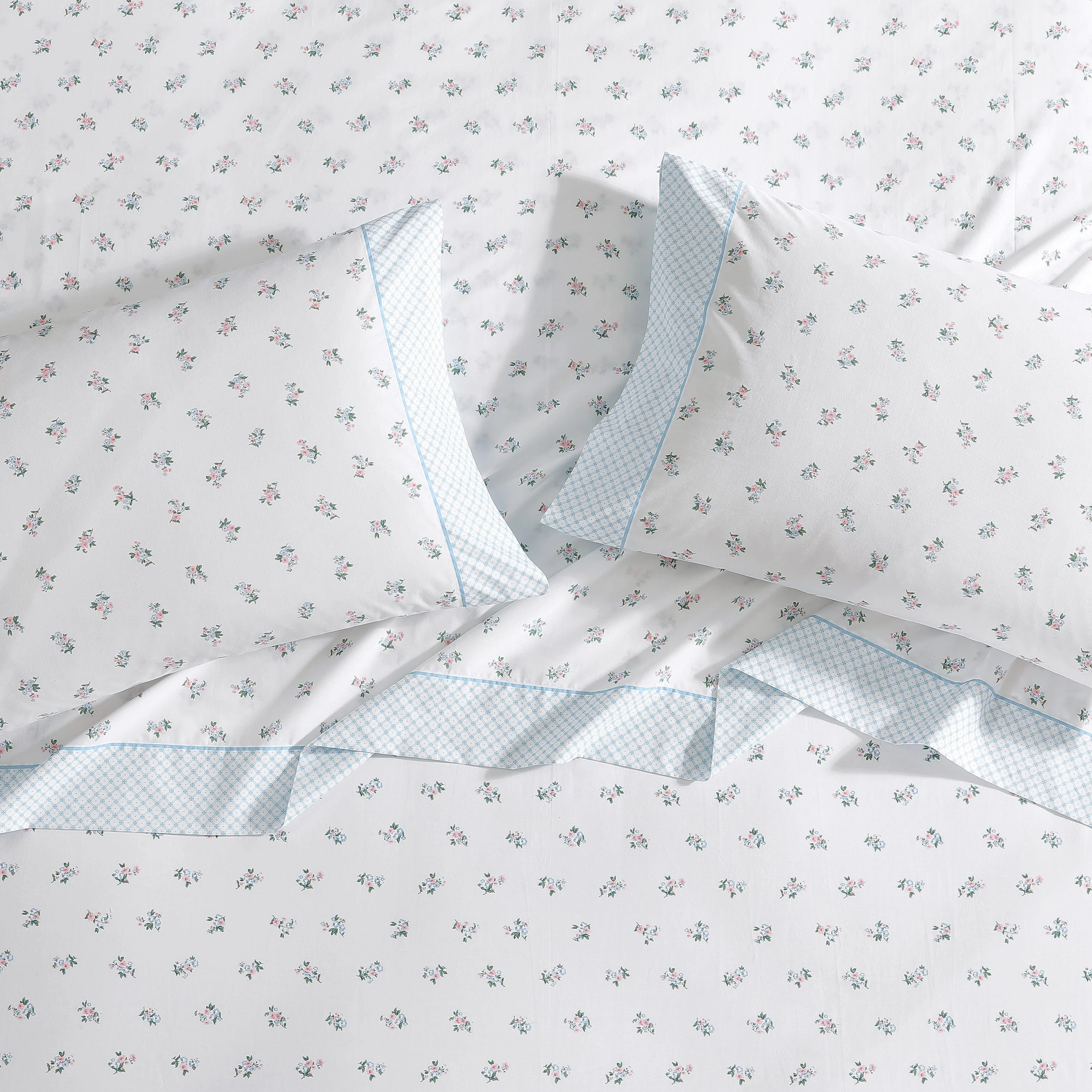 Update your bedroom decor with a new Printed Hem Sheet Set from Laura Ashley. These stylish sheet sets seamlessly blend classic floral prints with a printed hem accent. Crafted from premium percale cotton, these sheets are soft to the touch feel and provide enduring comfort. What sets them apart is the innovative design- featuring captivating floral prints with a distinct twist – a different but complementary print adorning the hem. This unique detail adds an extra layer of style and individuality to your bed, creating a truly distinctive look for your bedroom décor. Each sheet boasts a captivating array of prints that breathe life into your sleeping sanctuary. Coordinate with your own bedding or combine with a new Laura Ashley comforter, duvet or quilt set. Set includes one flat sheet, one fitted sheet and two pillowcases (one in twin).  Ensemble is machine washable for easy care.
