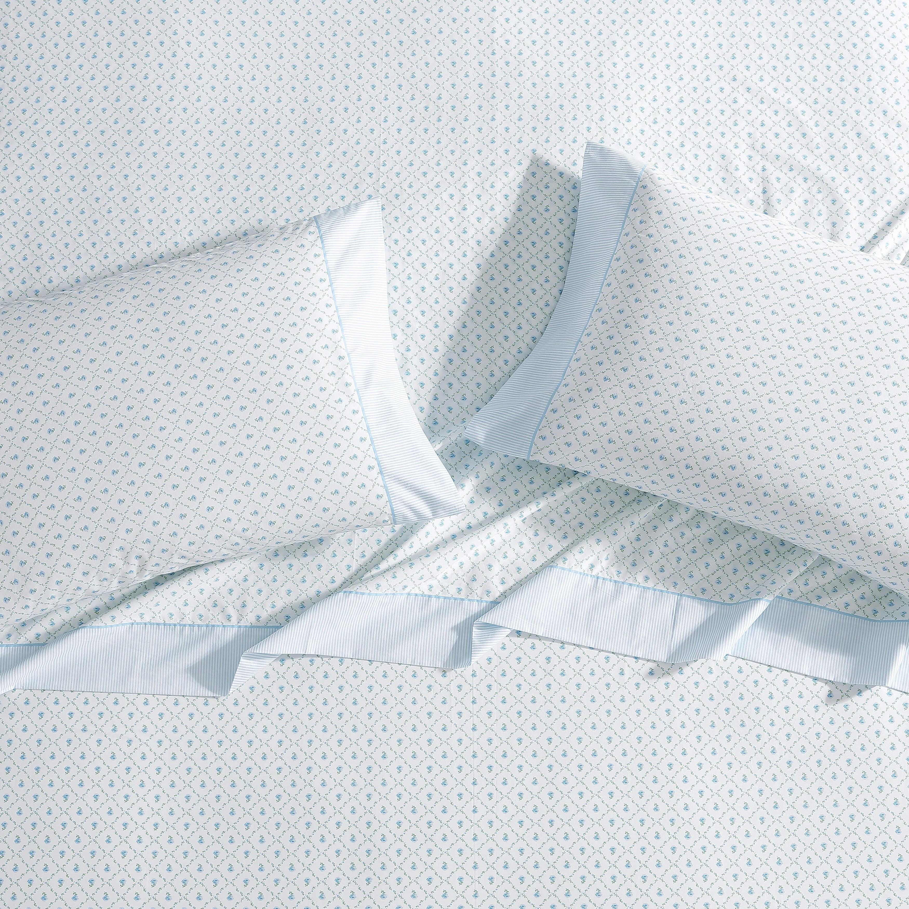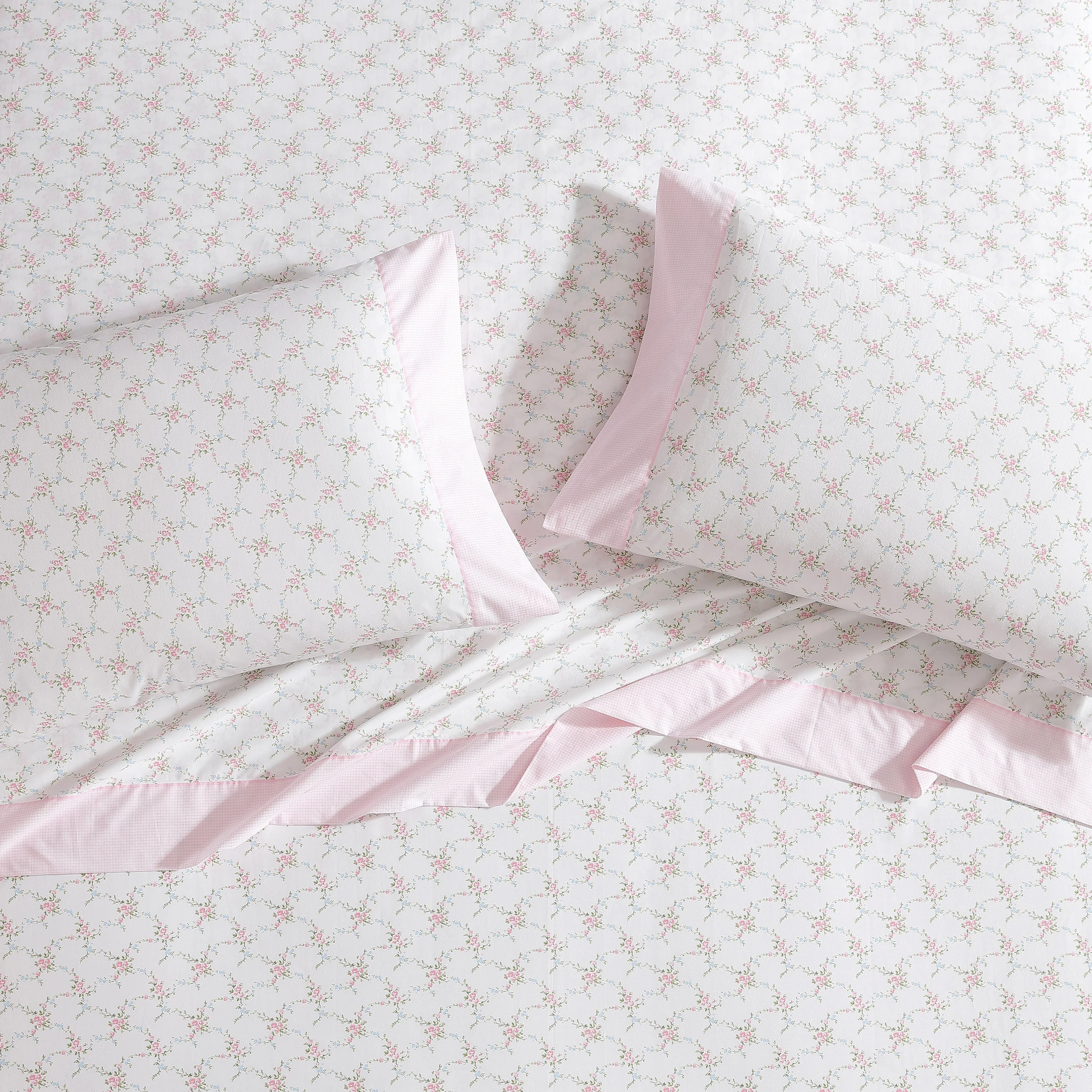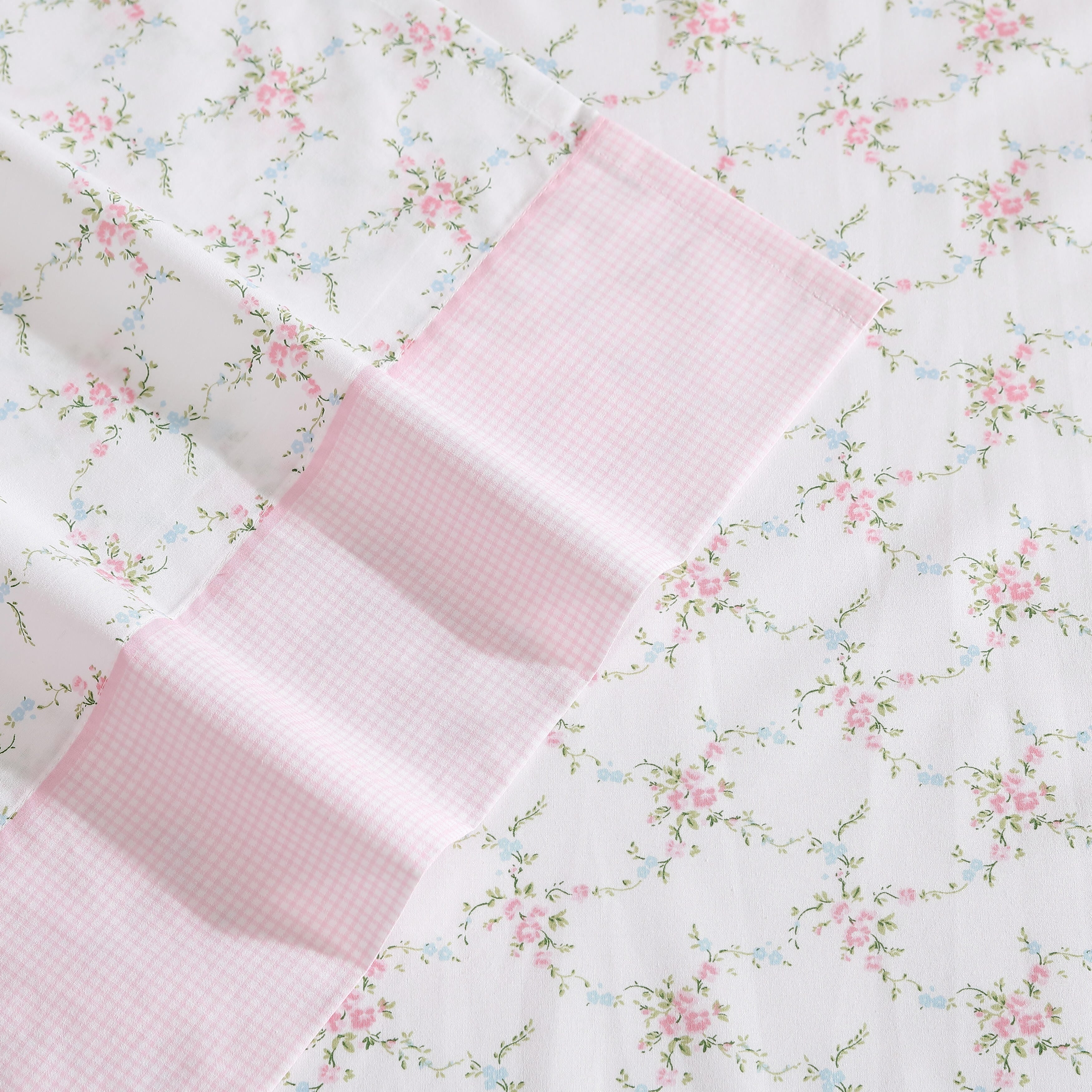 Update your bedroom decor with a new Printed Hem Sheet Set from Laura Ashley. These stylish sheet sets seamlessly blend classic floral prints with a printed hem accent. Crafted from premium percale cotton, these sheets are soft to the touch feel and provide enduring comfort. What sets them apart is the innovative design- featuring captivating floral prints with a distinct twist – a different but complementary print adorning the hem. This unique detail adds an extra layer of style and individuality to your bed, creating a truly distinctive look for your bedroom décor. Each sheet boasts a captivating array of prints that breathe life into your sleeping sanctuary. Coordinate with your own bedding or combine with a new Laura Ashley comforter, duvet or quilt set. Set includes one flat sheet, one fitted sheet and two pillowcases (one in twin).  Ensemble is machine washable for easy care.