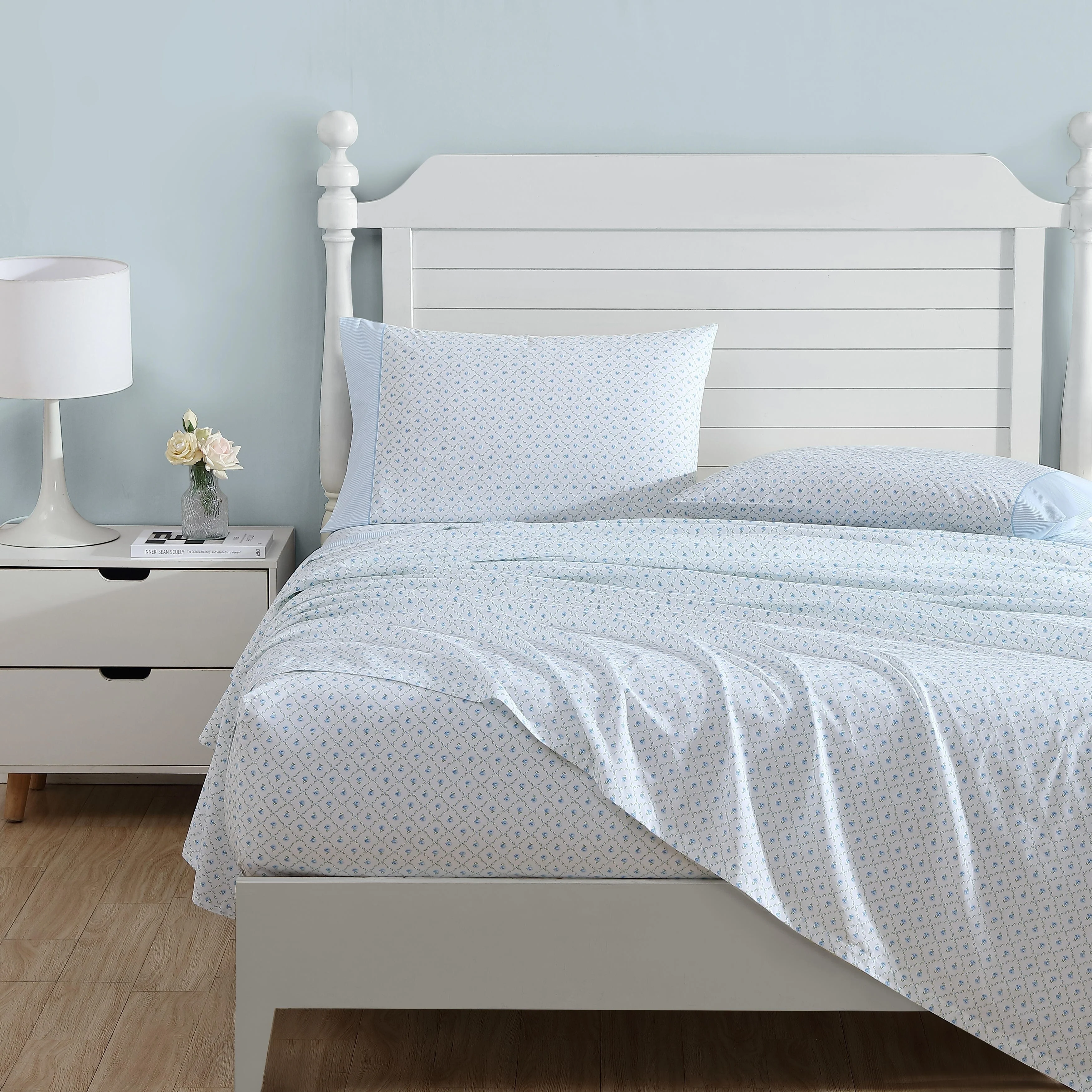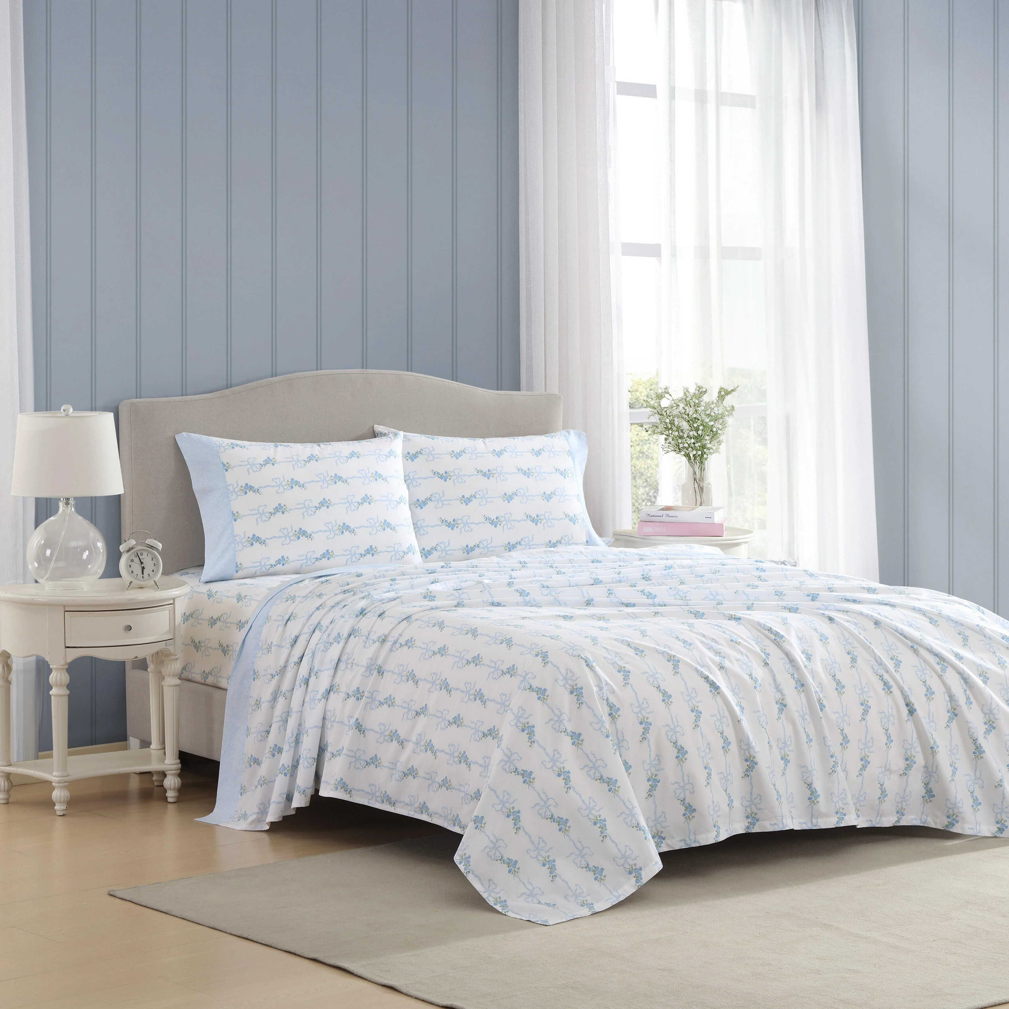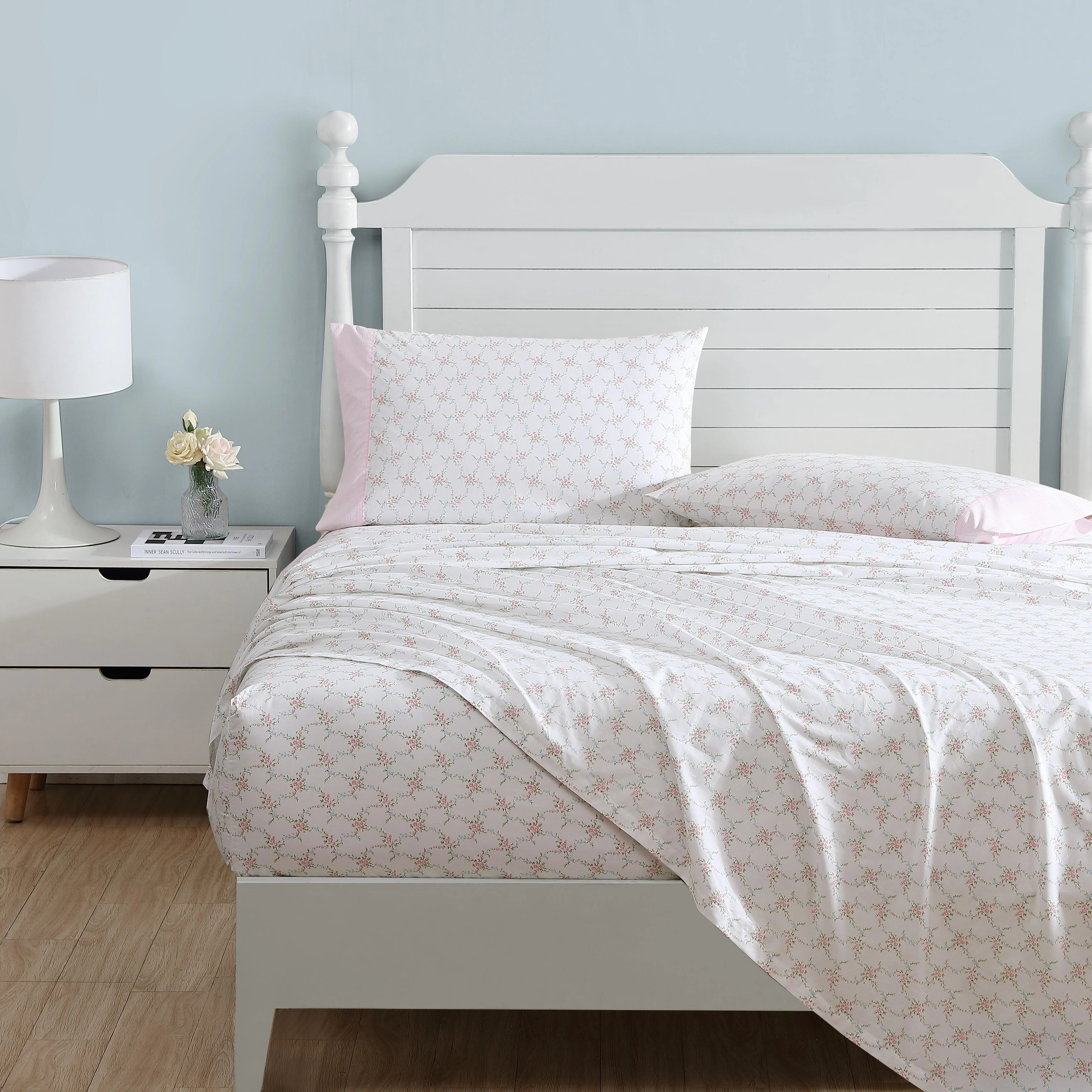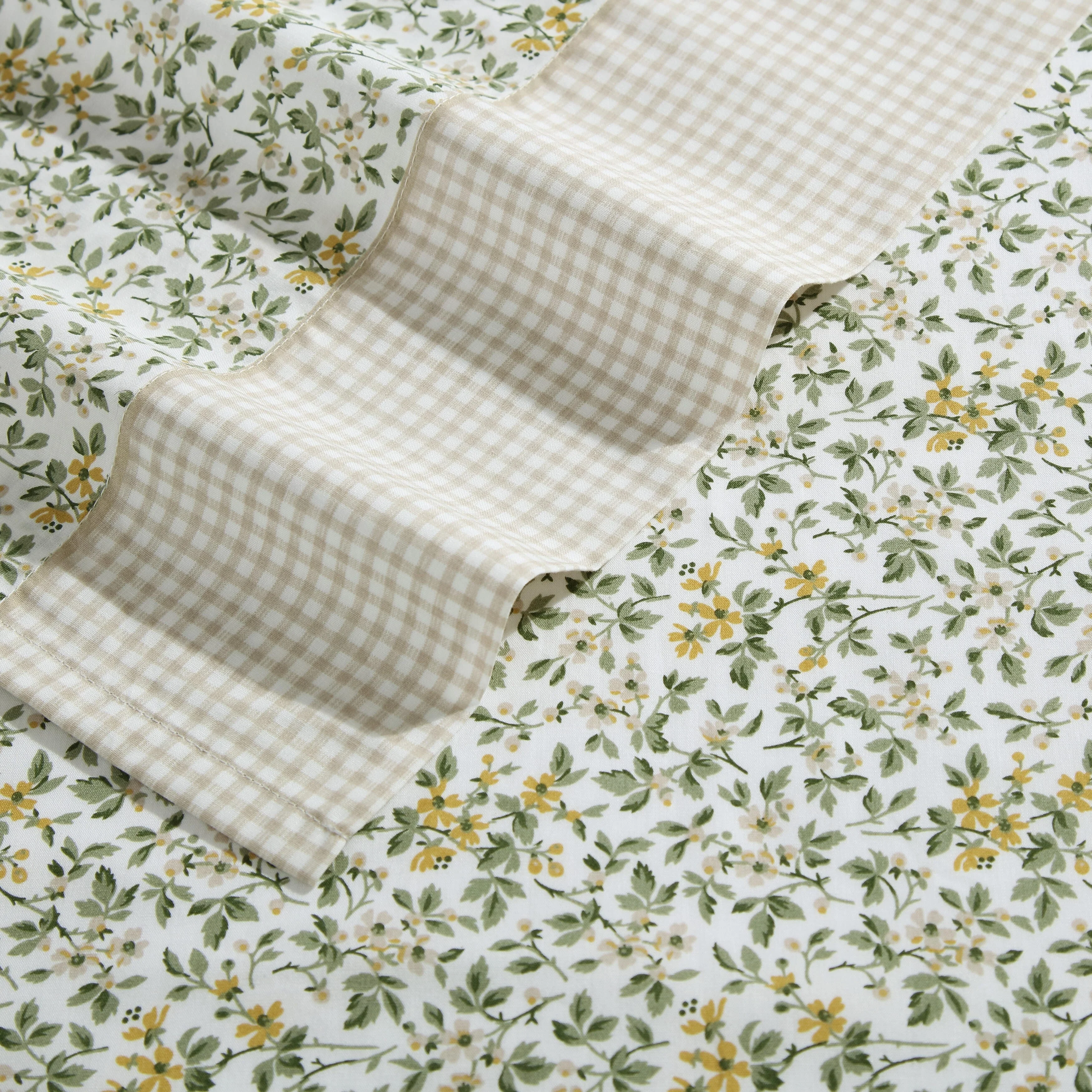 Update your bedroom decor with a new Printed Hem Sheet Set from Laura Ashley. These stylish sheet sets seamlessly blend classic floral prints with a printed hem accent. Crafted from premium percale cotton, these sheets are soft to the touch feel and provide enduring comfort. What sets them apart is the innovative design- featuring captivating floral prints with a distinct twist – a different but complementary print adorning the hem. This unique detail adds an extra layer of style and individuality to your bed, creating a truly distinctive look for your bedroom décor. Each sheet boasts a captivating array of prints that breathe life into your sleeping sanctuary. Coordinate with your own bedding or combine with a new Laura Ashley comforter, duvet or quilt set. Set includes one flat sheet, one fitted sheet and two pillowcases (one in twin).  Ensemble is machine washable for easy care.