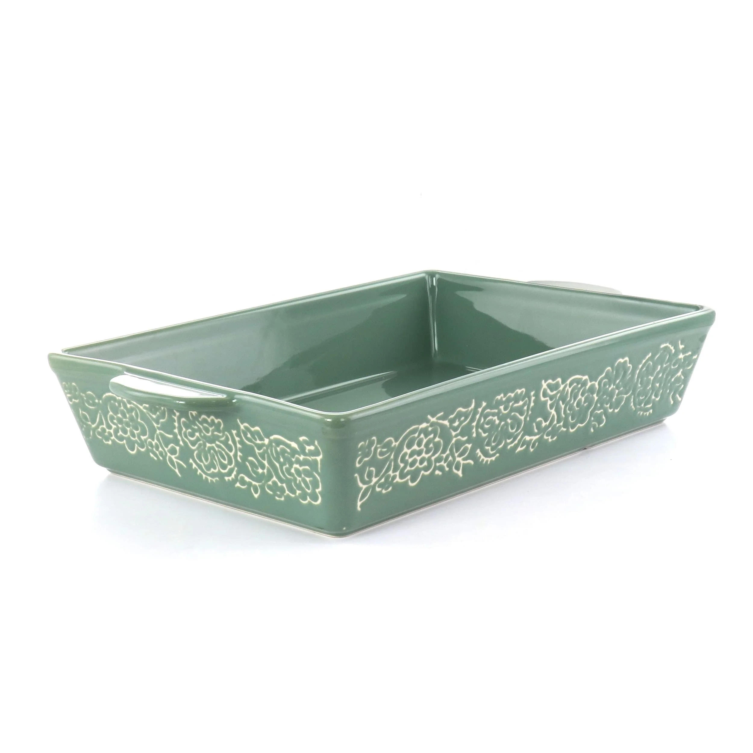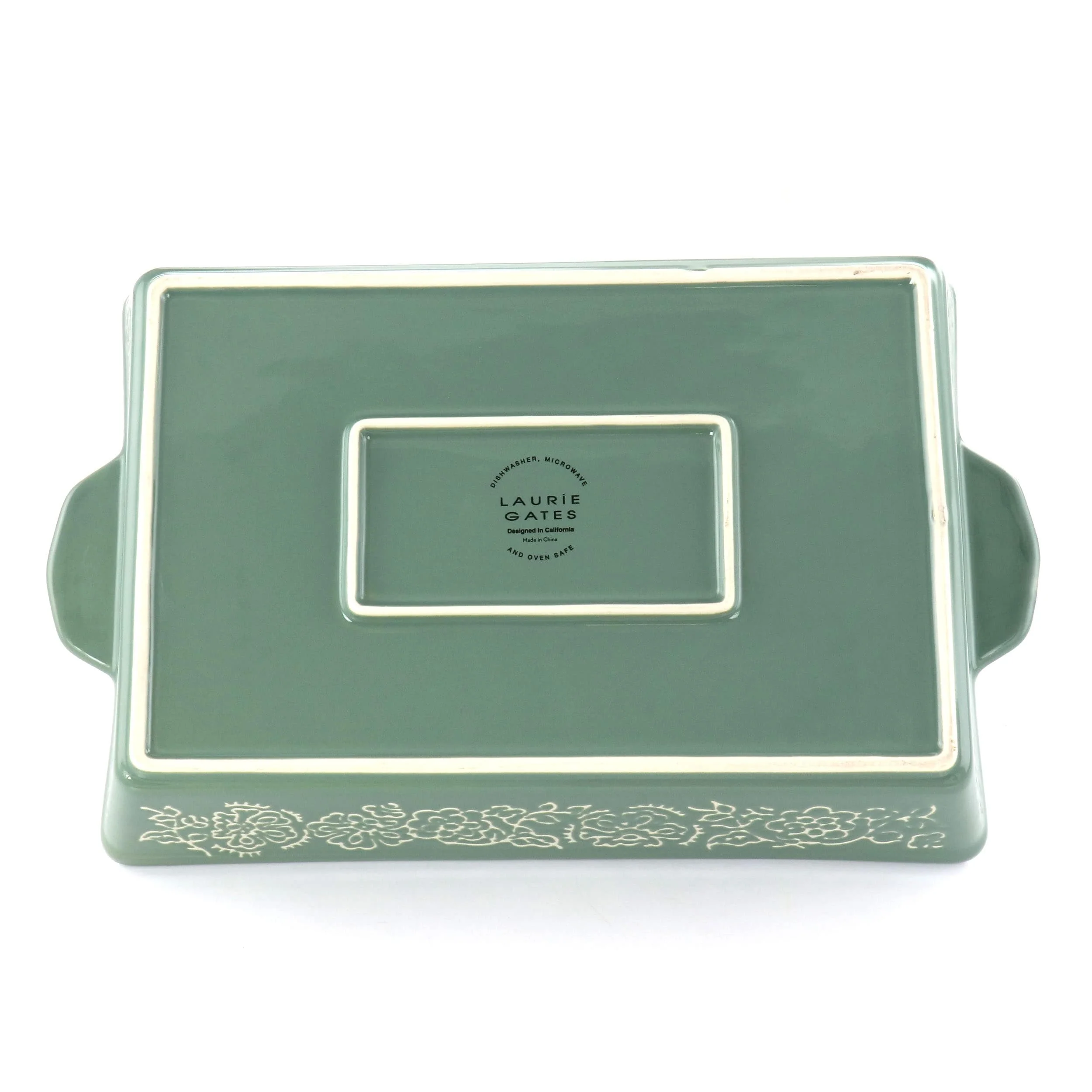 This Laurie Gates 2 Piece Wax Relief Stoneware Baker Set in Red and Mint brings a colorful pop of rustic and timeless beauty to any kitchen. This set includes one 15.75" baker in mint and one 13.75" baker in red, both with intricate hand decorated wax relief patterns making them unique. The tough stoneware construction and glossy coating means these are dishwasher, microwave, and oven safe to meet all your cooking and baking needs. Make your perfect pie or casserole, and then serve it to your guests all in the same pan!Set: 2 Piece Baker SetMaterial: StonewareFinish: GlossyShape: RectangleColor: Red and MintMicrowave SafeDishwasher SafeOven SafeSet Includes:One 15.75" Large BakerOne 13.75" Medium BakerPer Item Measurements:Large Baker: 15.75" length, 9.5" width, 2.75" height, 5.85lbs weightMedium Baker: 13.75" length, 8" width, 3" height, 4.60lbs weight