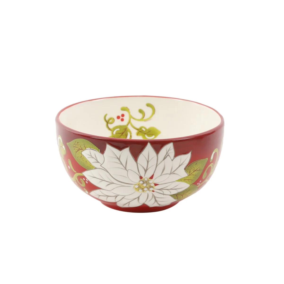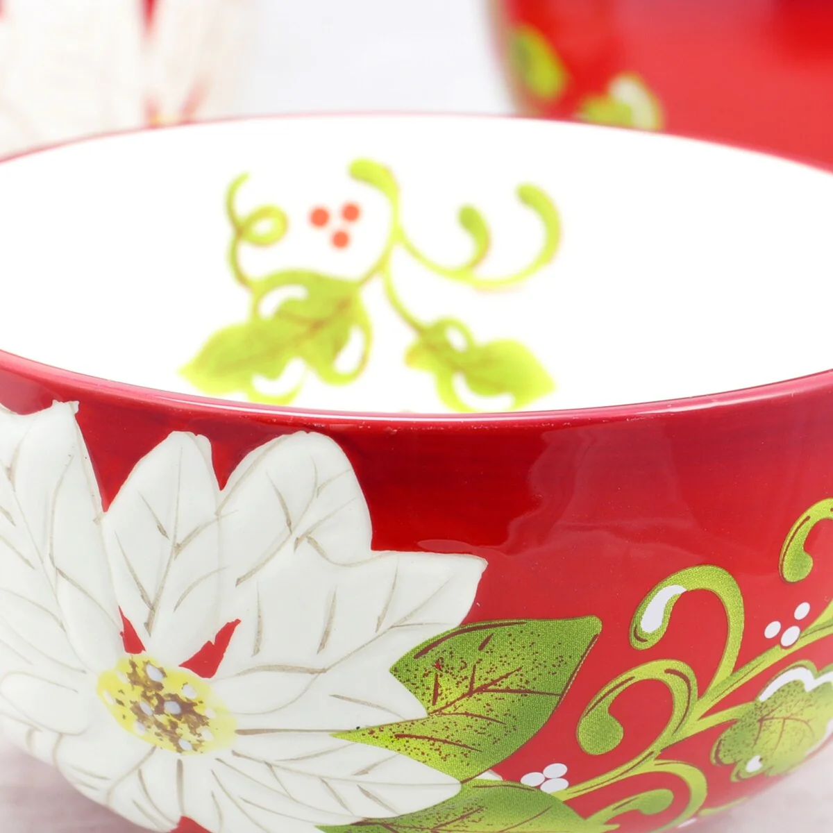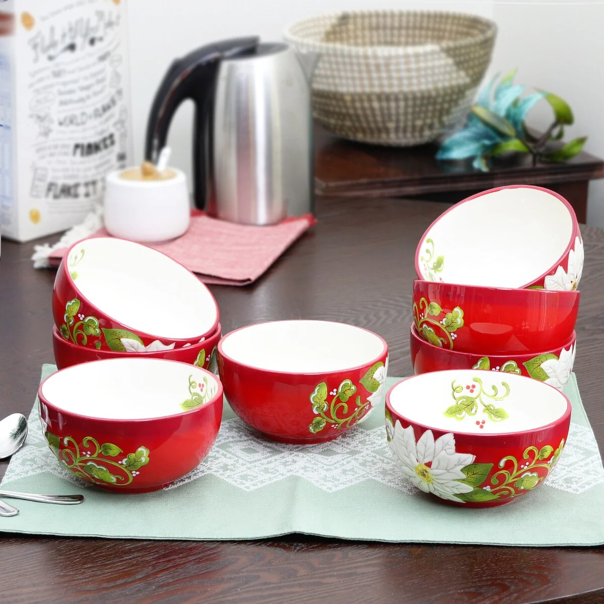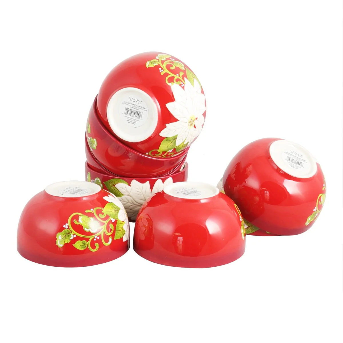 The Pleasant Poinsettia 8-piece bowl set by Laurie Gates brings the traditional joy of the holiday season to your home with rich and vibrant colors. whether to enjoy a warm cup of soup, your favorite cereals, some delicious snacks or fruits, these bowls will bring you comfort and brighten up your table setting. The beautifully hand-painted poinsettia design will nicely compliment your table and meals.