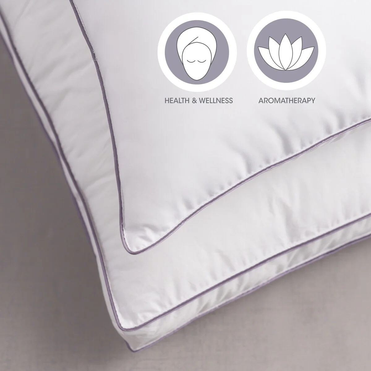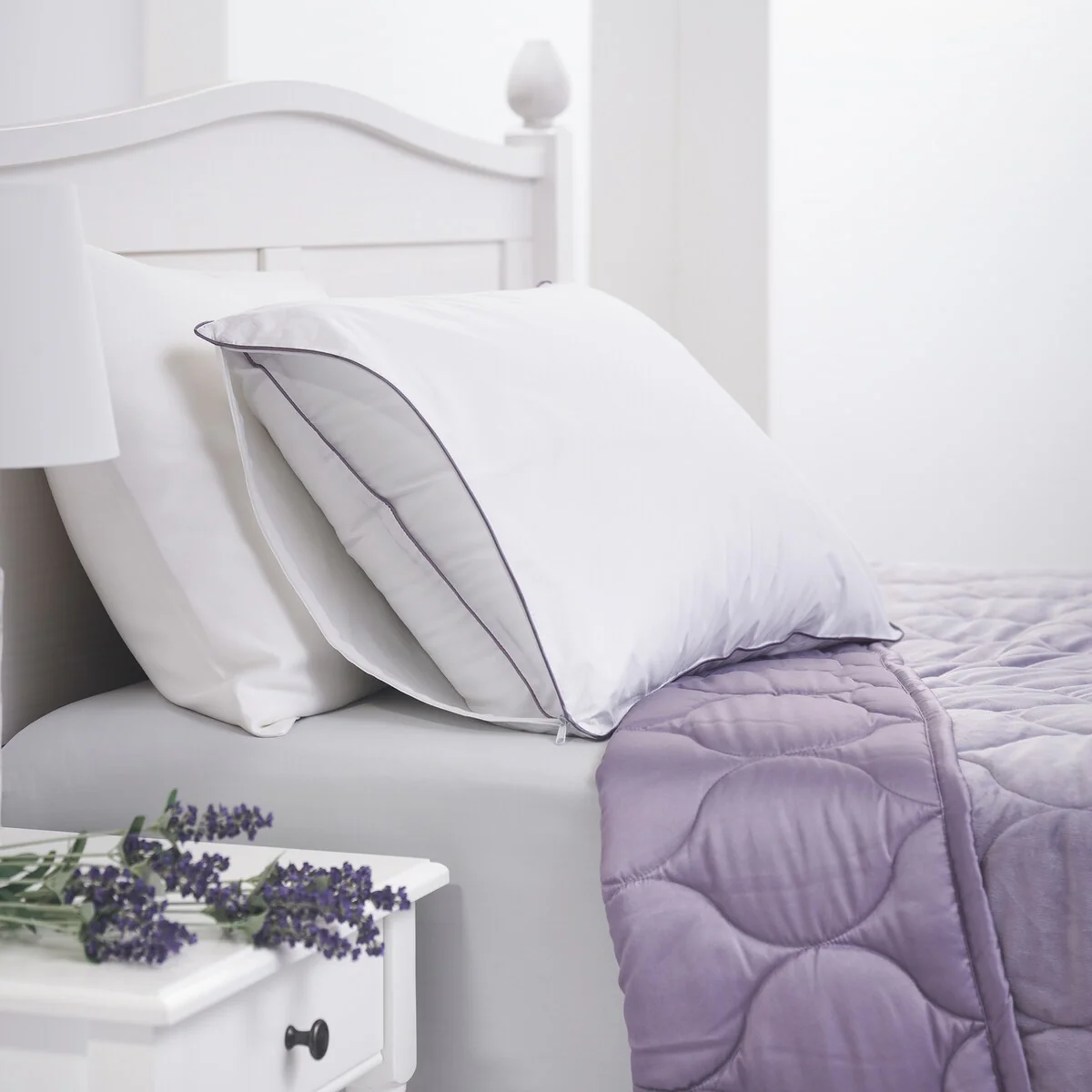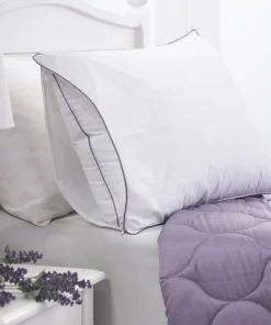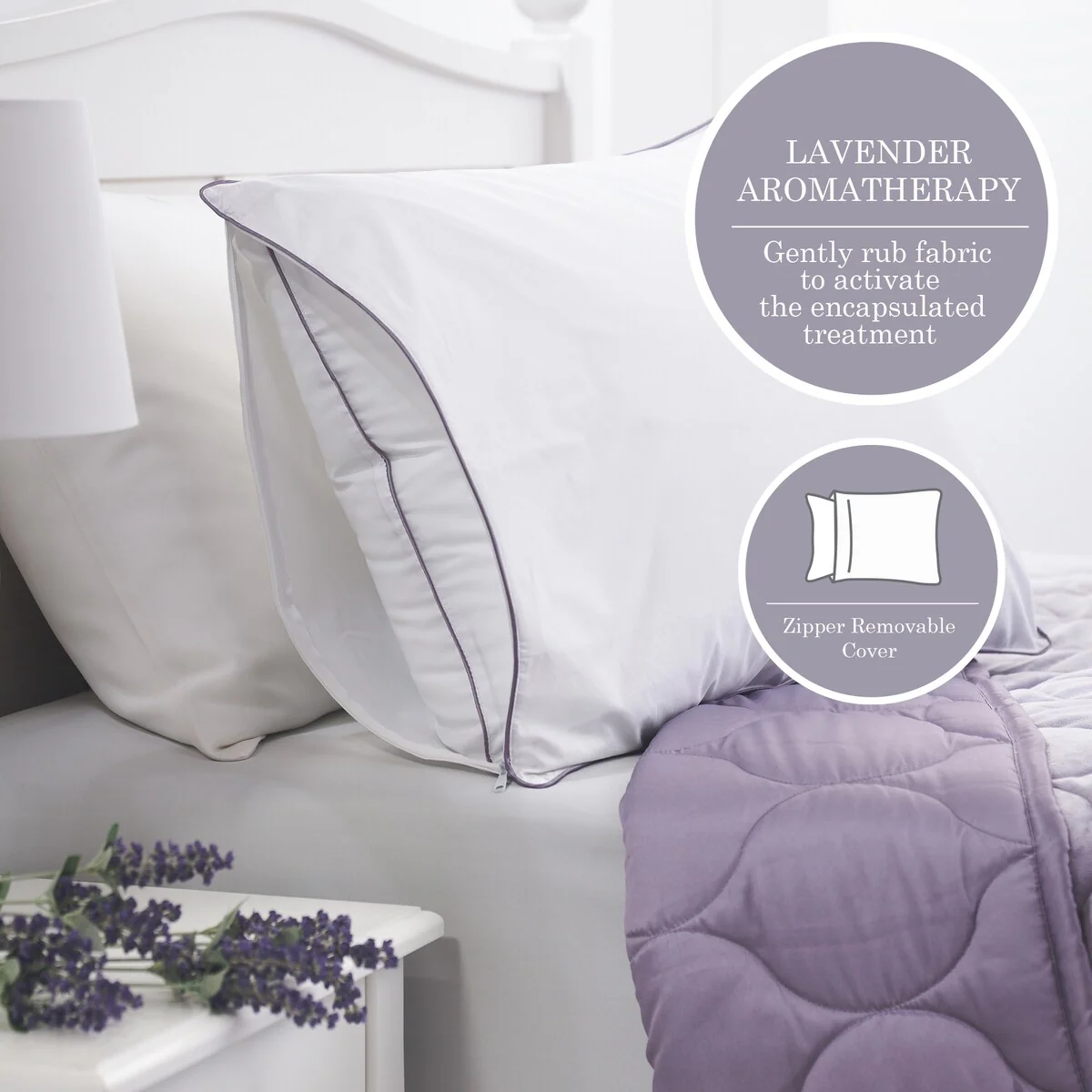 Keep your pillows fresh while you sleep in elevated comfort and relaxation with this Aromatherapy Sleep Lavender Scented Pillow Protector infused with a soothing lavender scent. The calming and relaxing aroma of lavender is widely recognized to improve sleep quality, and as well as reduce fatigue and depression. With the patented encapsulated technology, lavender is infused in micro capsules which gently release the scent as the fabric is handled. This zippered pillow cover is constructed with an all-natural luxurious Cotton cover and detailed with stylish satin piping.Â